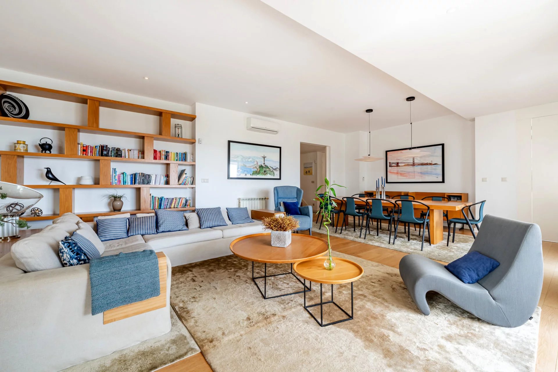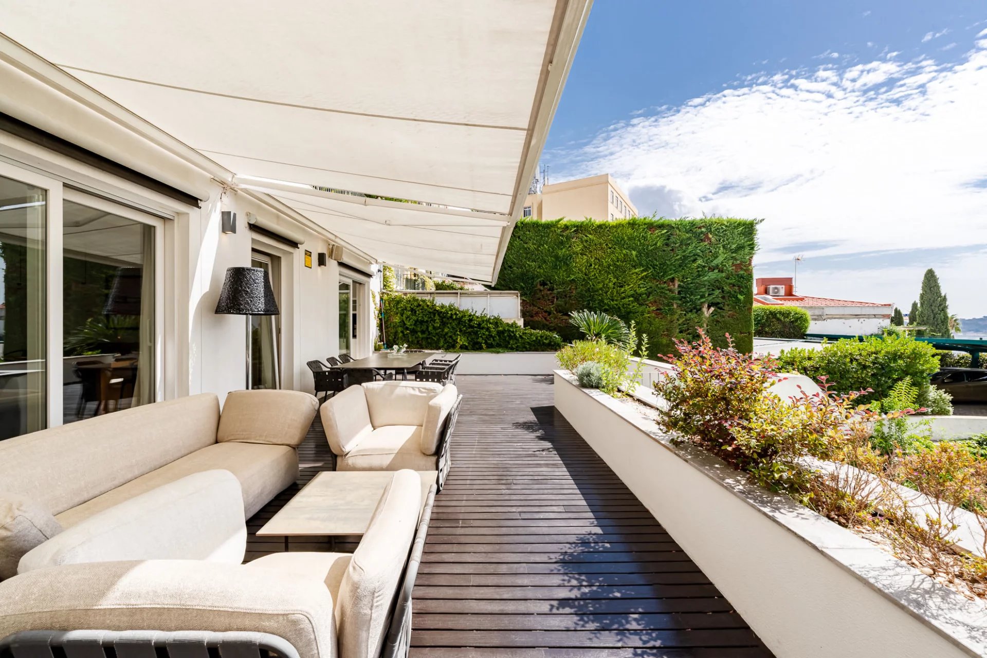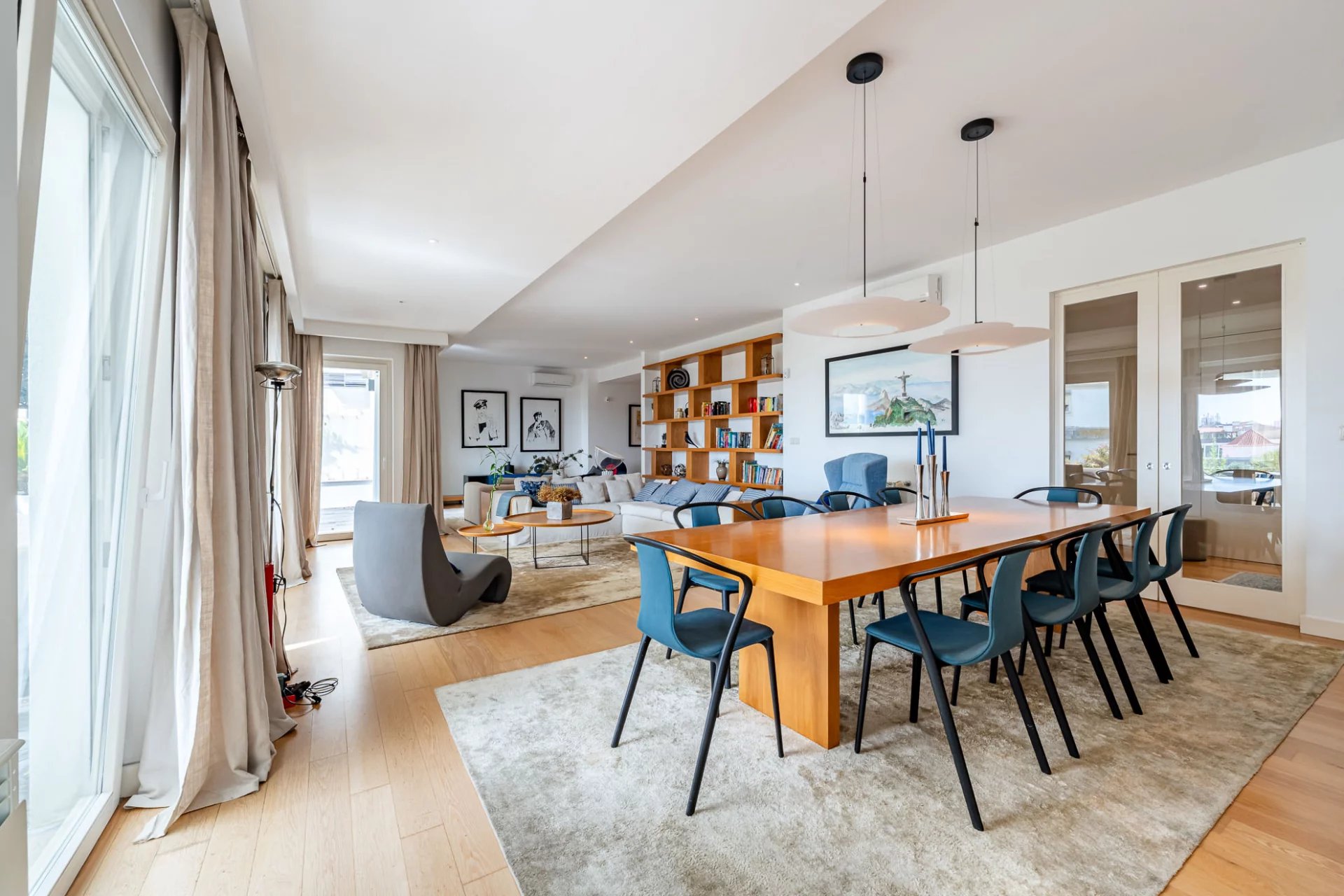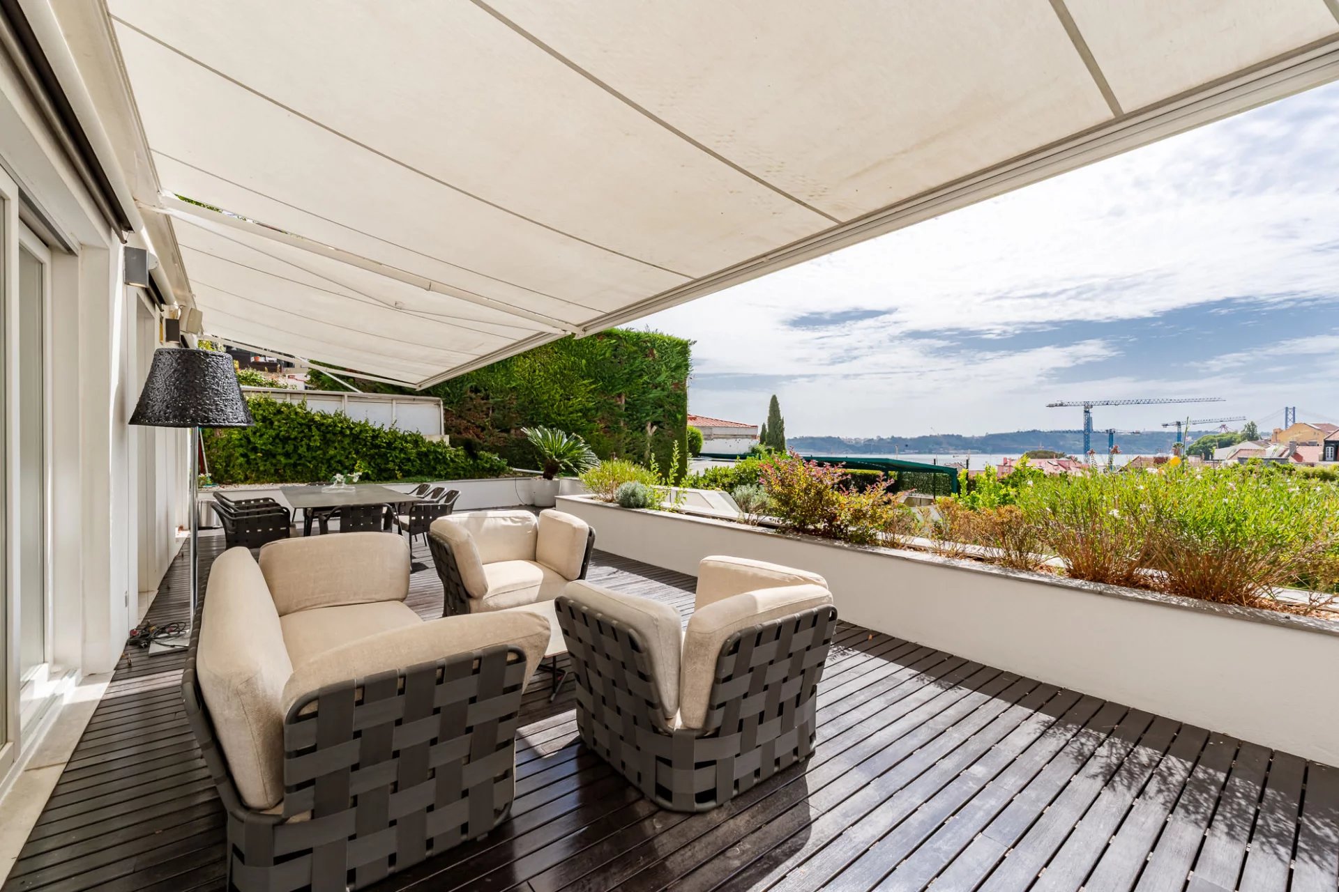 Appartement duplex de 3+2 chambres, 300 m² de surface brute privée et 171 m² d'espace extérieur, avec 4 places de parking et une salle de stockage, bénéficiant d'une situation privilégiée à Lapa avec une vue imprenable sur le Tage et la ville de Lisbonne.