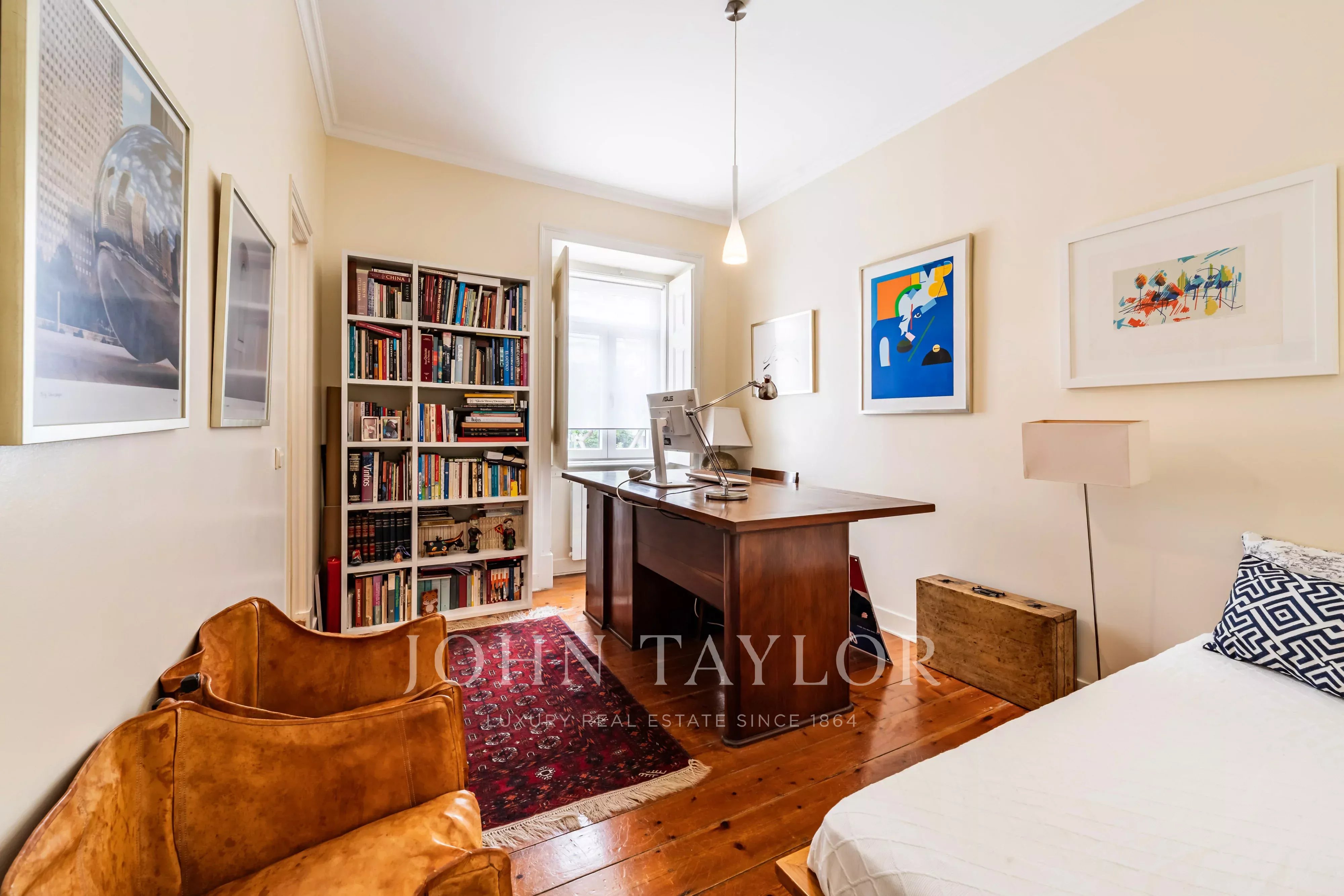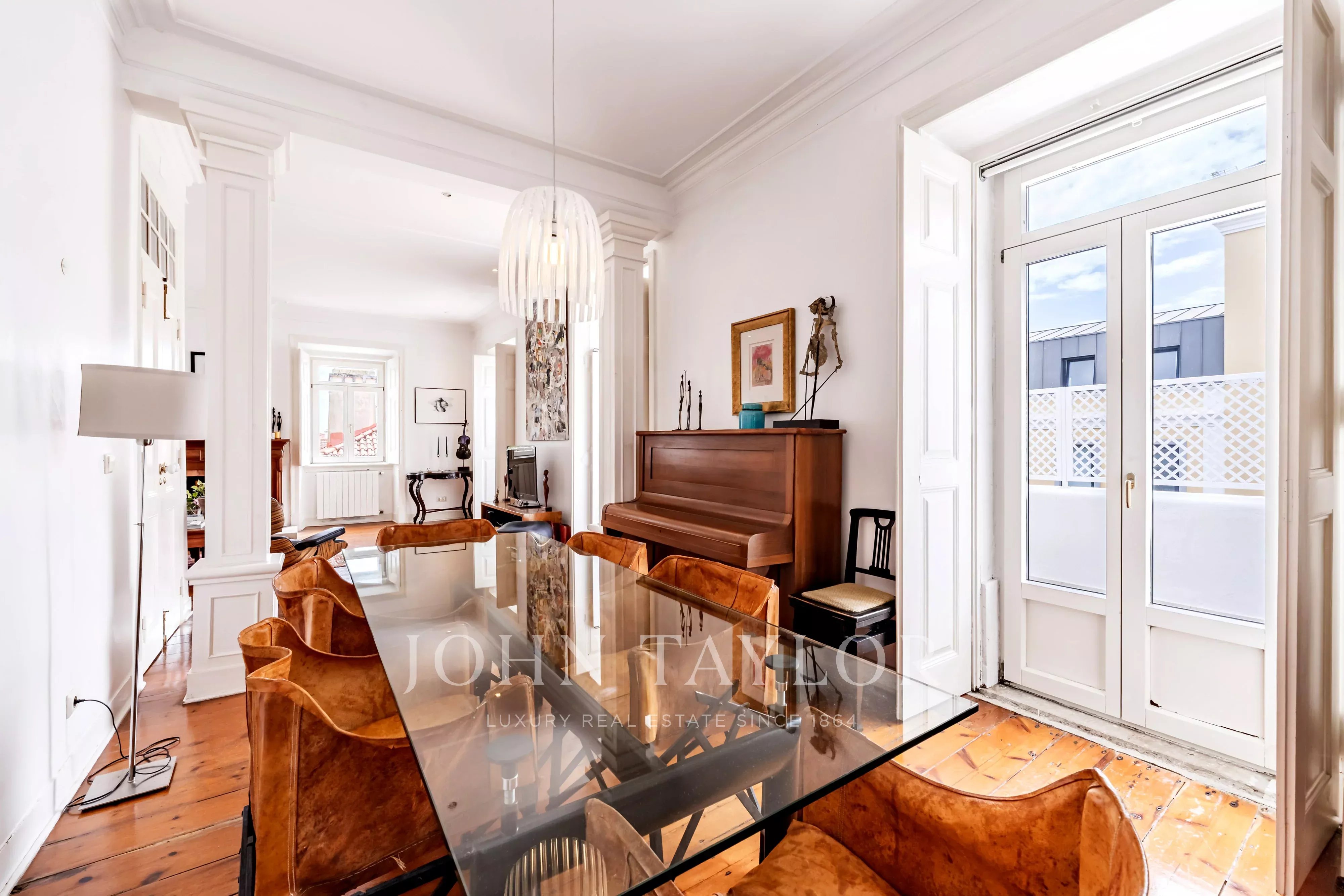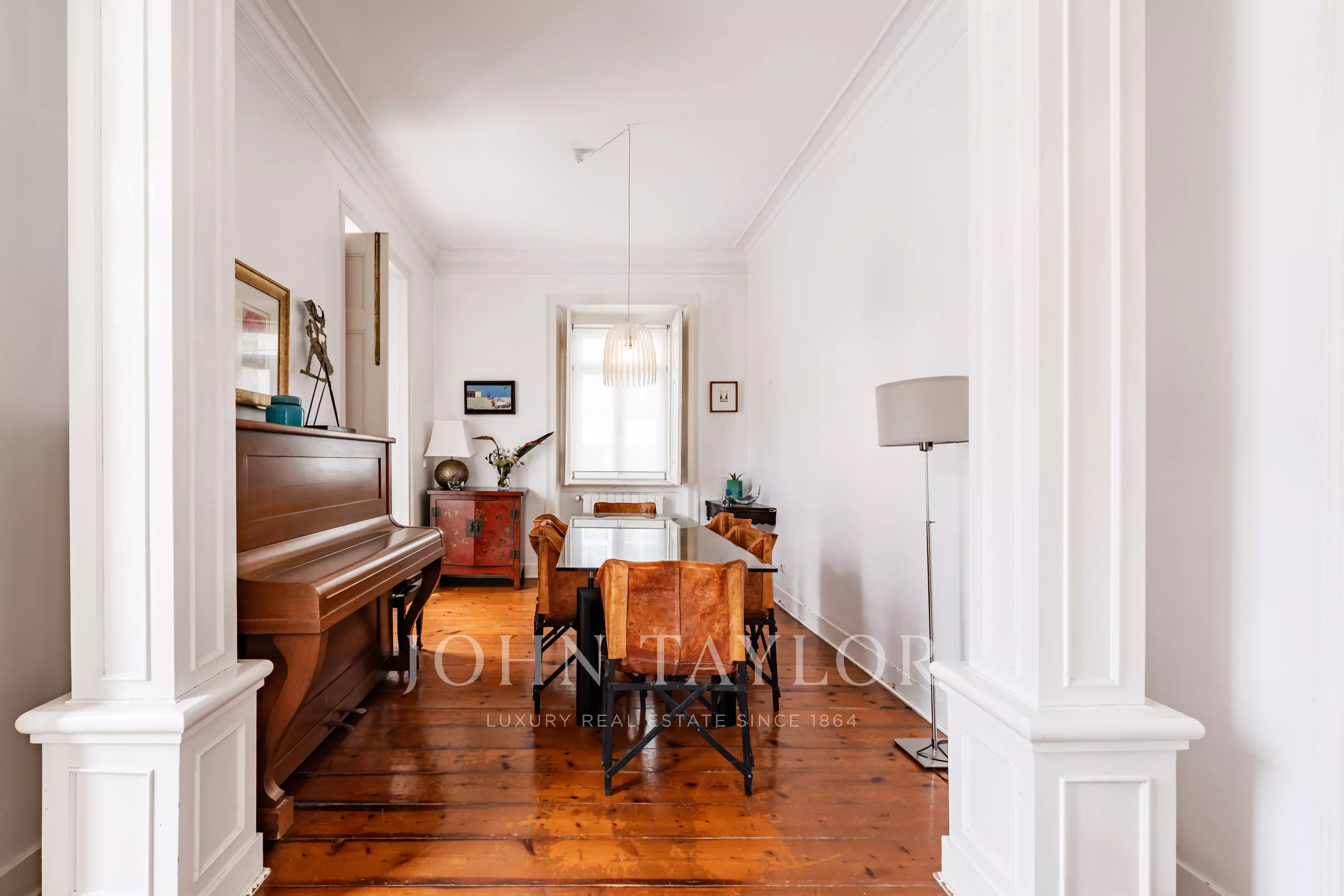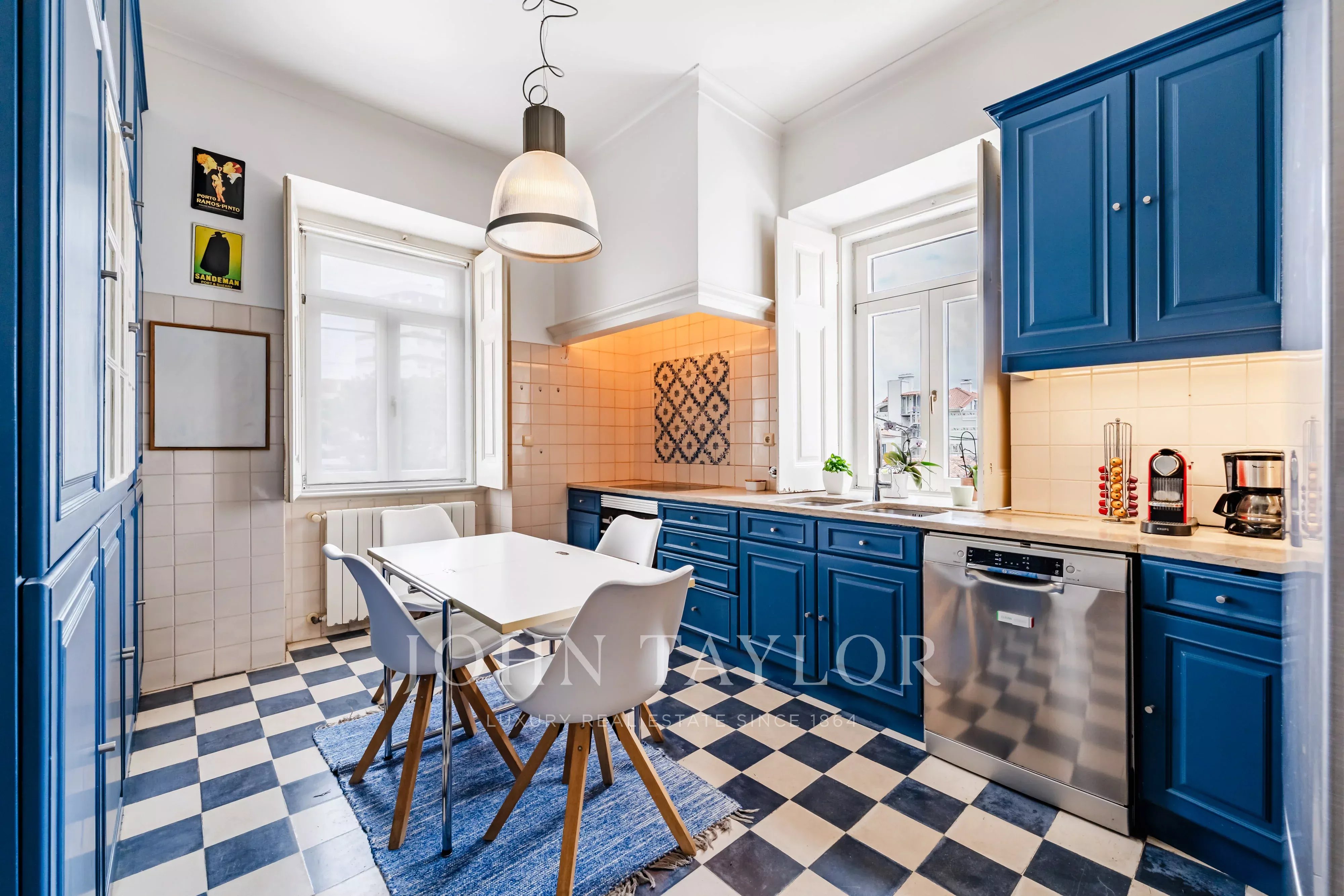 Situé dans un bâtiment de style classique, la propriété se distingue par son charme architectural, accentué par des détails en carreaux d'azulejos traditionnels sur la façade. À l'intérieur, de hauts plafonds, une excellente luminosité naturelle et un parquet créent un sentiment d'espace, de chaleur et d'élégance discrète.