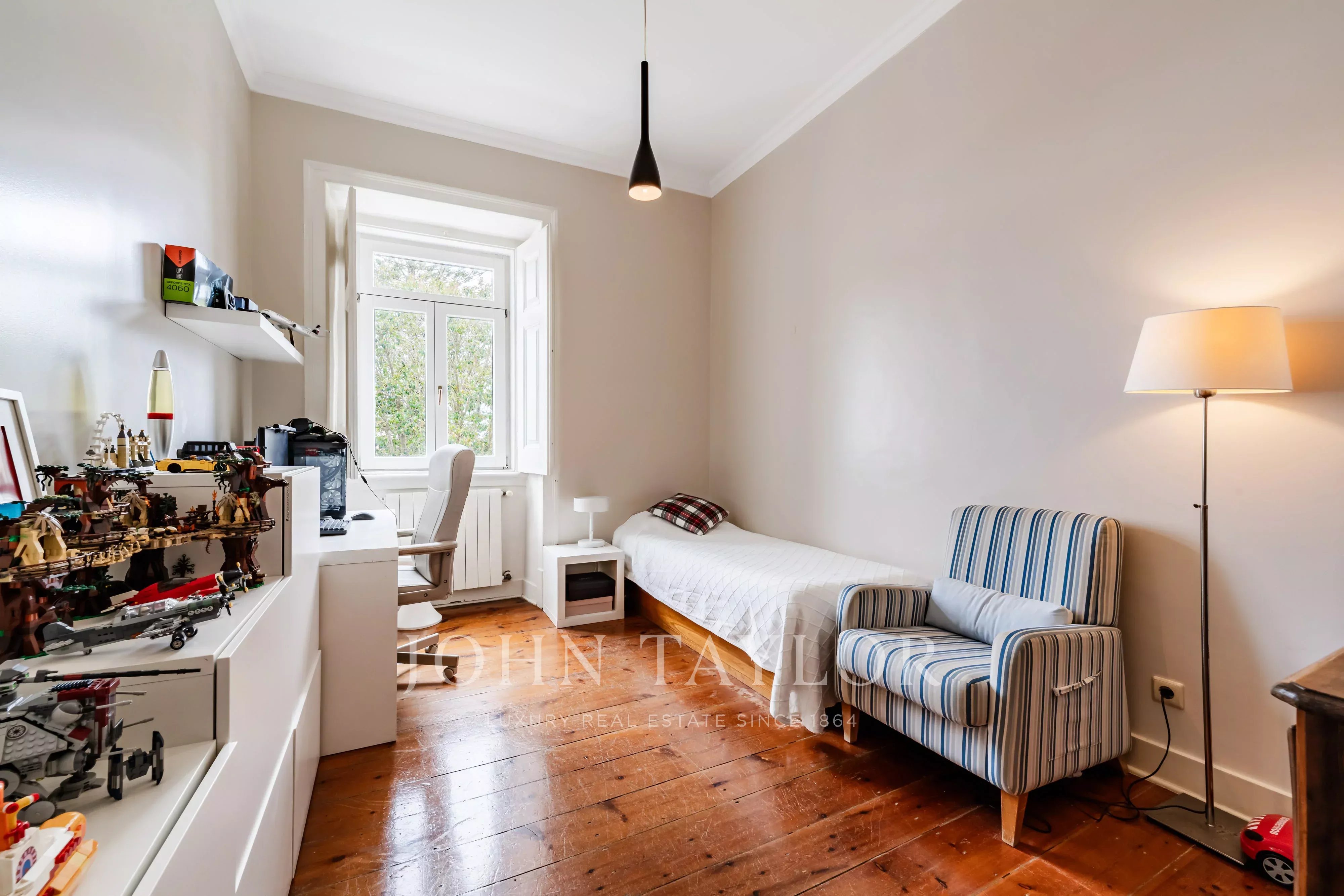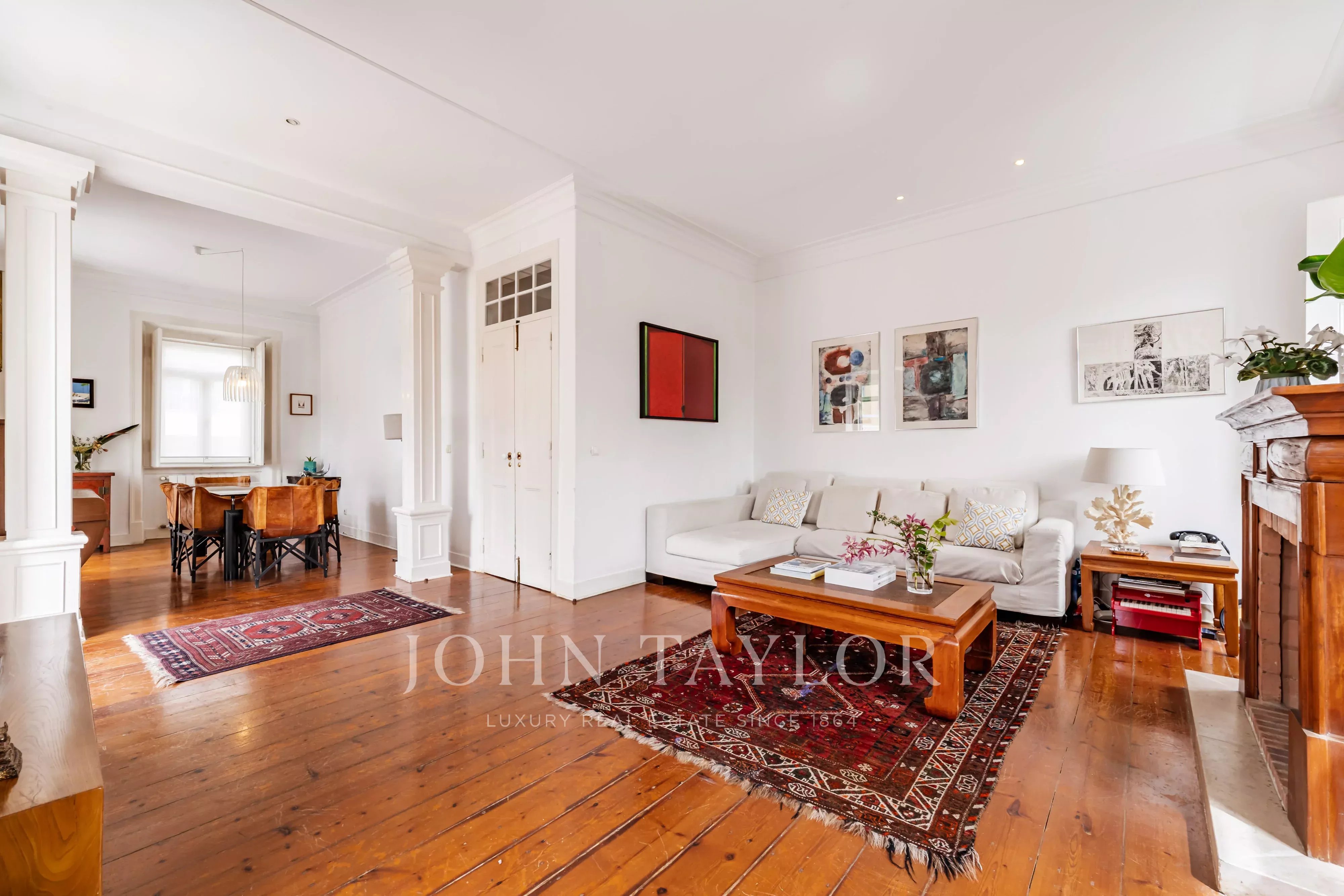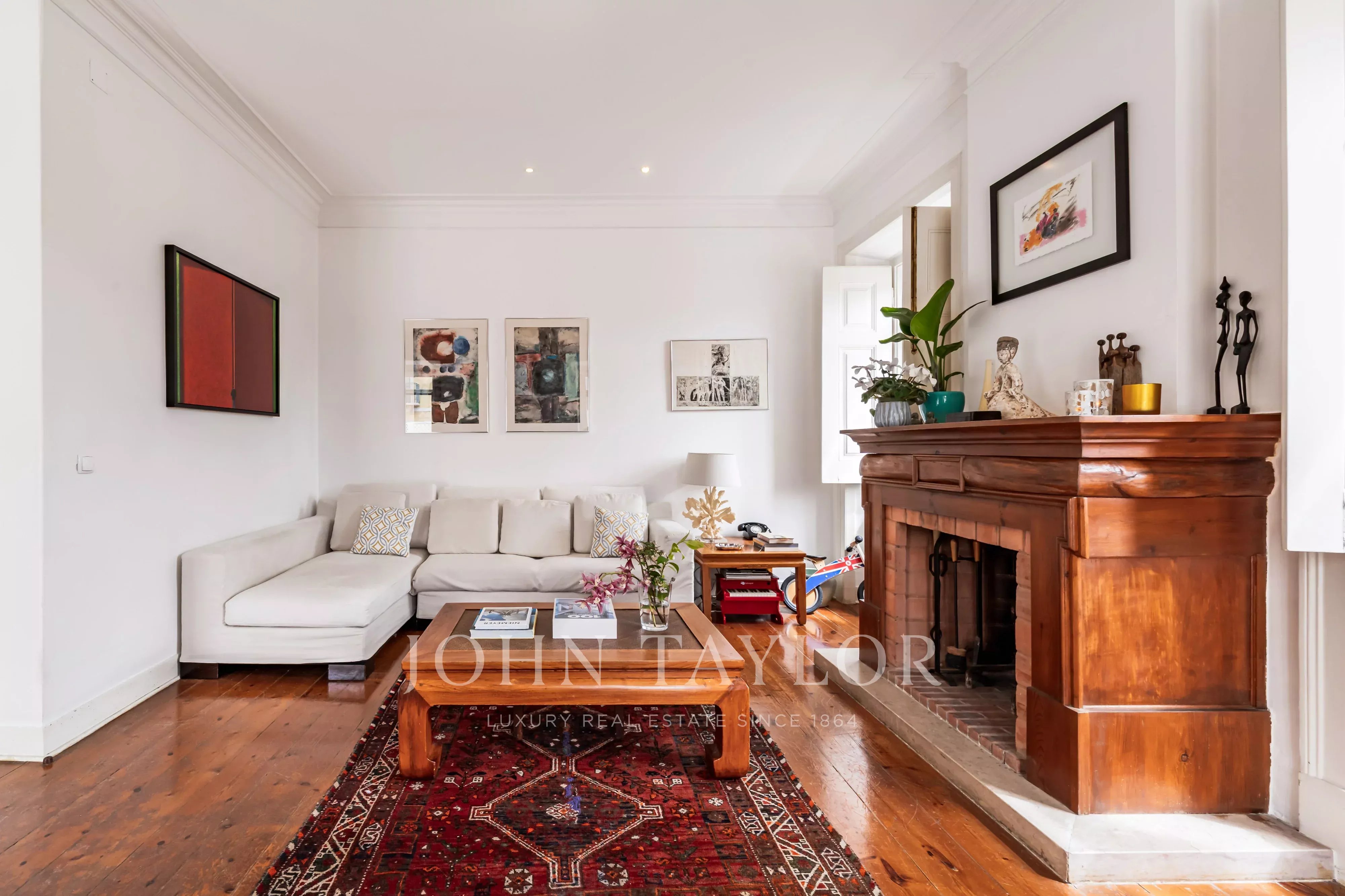 Situé dans un bâtiment de style classique, la propriété se distingue par son charme architectural, accentué par des détails en carreaux d'azulejos traditionnels sur la façade. À l'intérieur, de hauts plafonds, une excellente luminosité naturelle et un parquet créent un sentiment d'espace, de chaleur et d'élégance discrète.