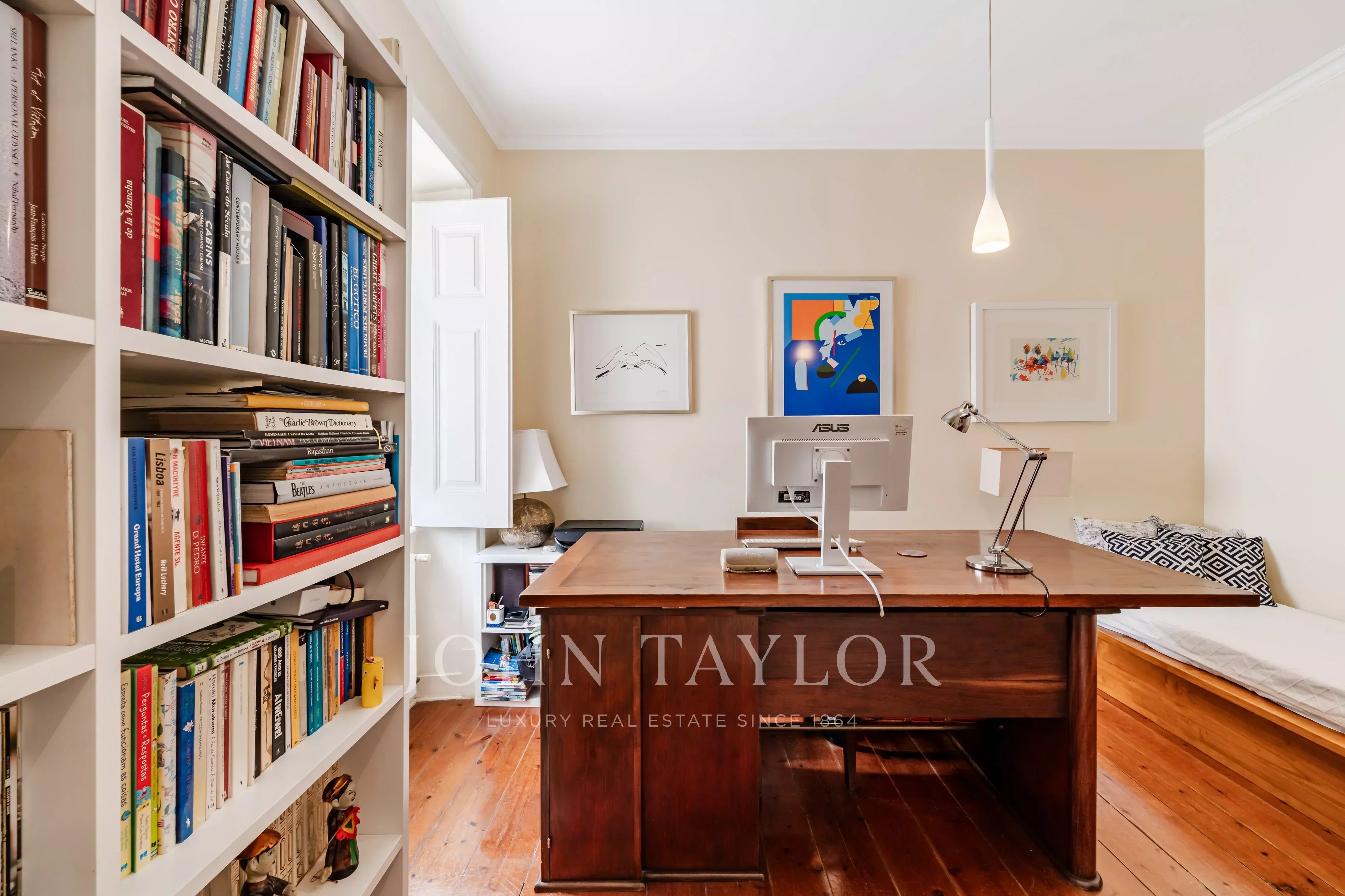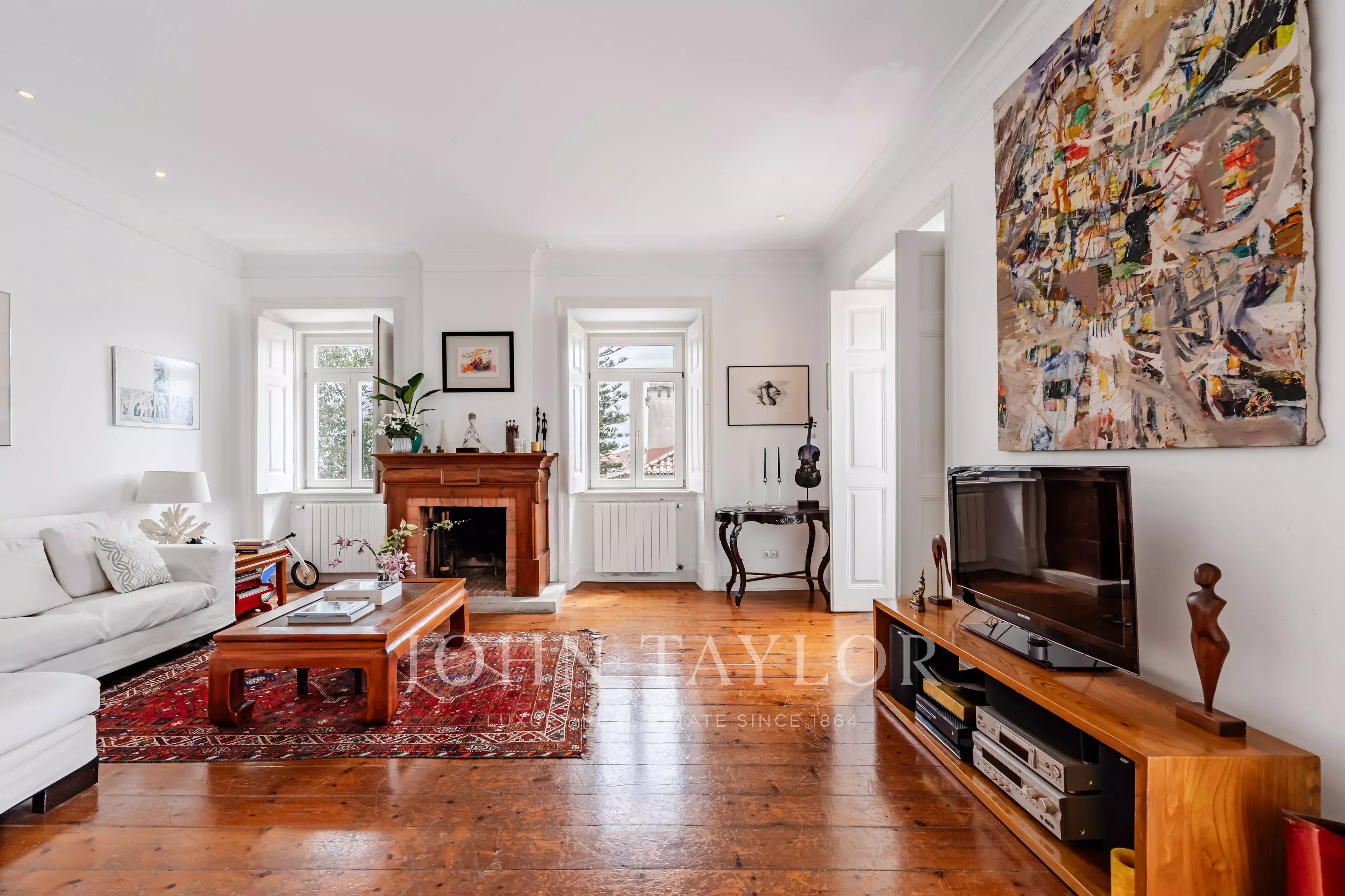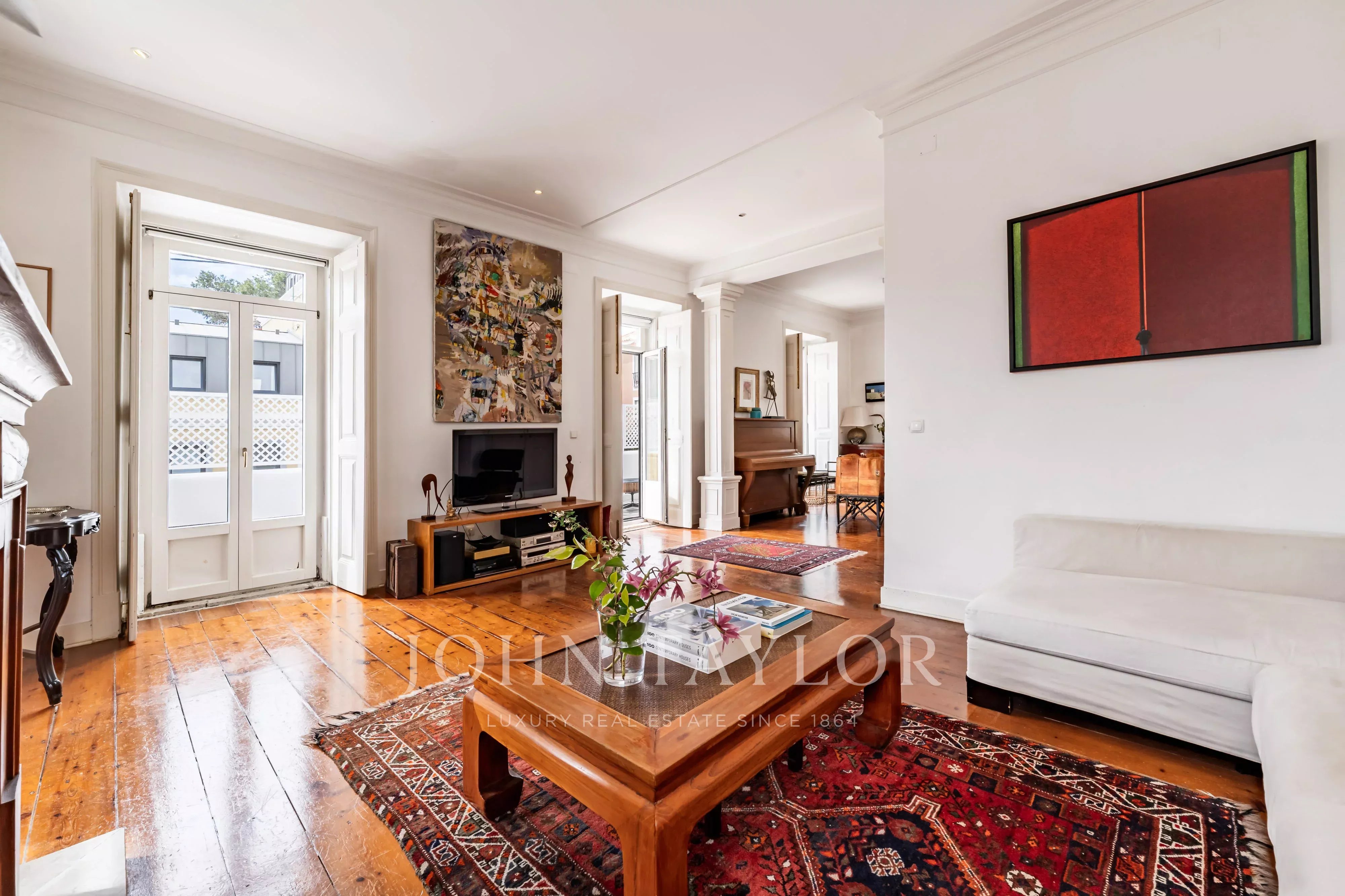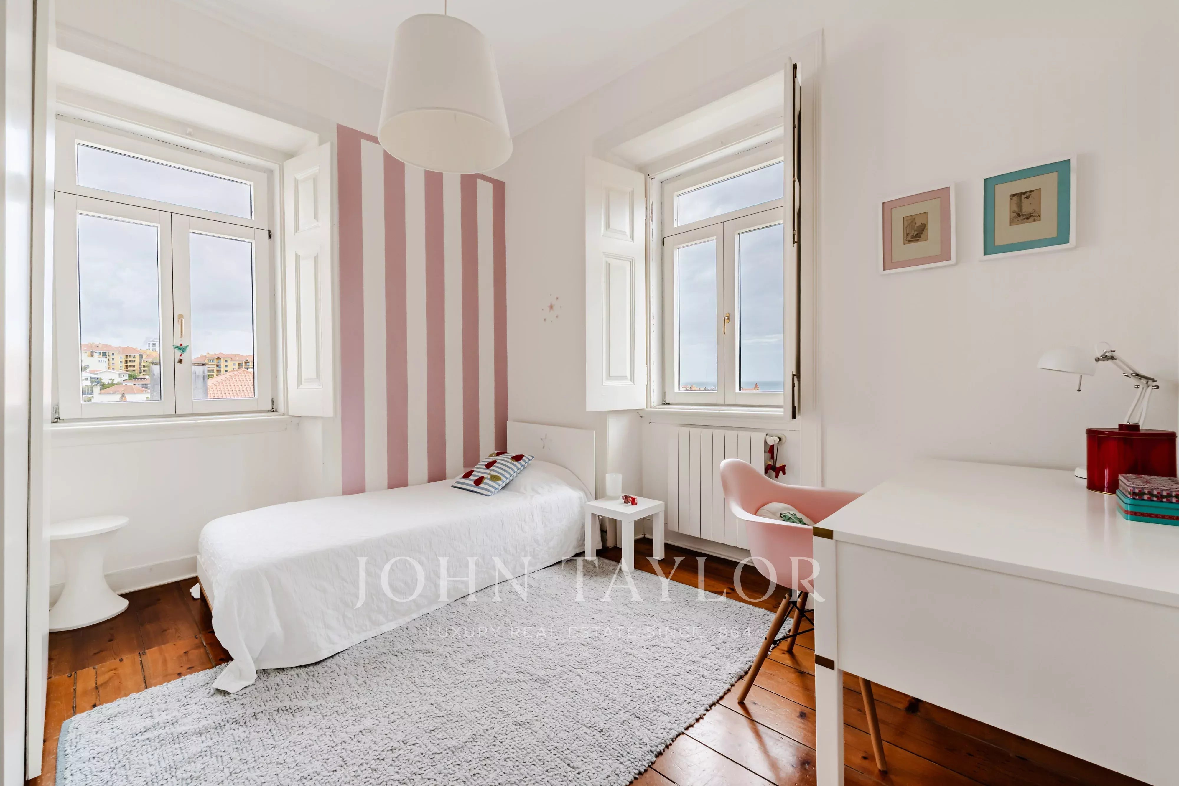 Situé dans un bâtiment de style classique, la propriété se distingue par son charme architectural, accentué par des détails en carreaux d'azulejos traditionnels sur la façade. À l'intérieur, de hauts plafonds, une excellente luminosité naturelle et un parquet créent un sentiment d'espace, de chaleur et d'élégance discrète.