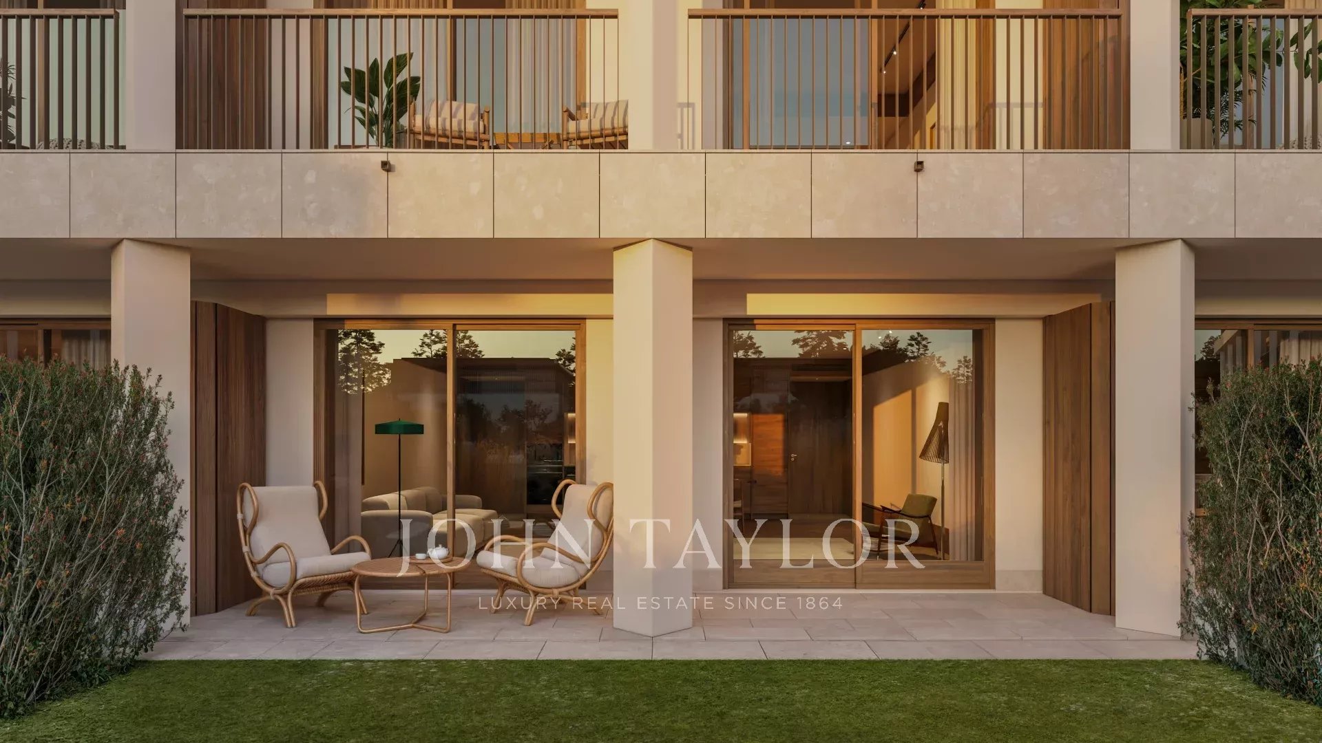 Avec une surface de 147 m², l’appartement dispose au rez-de-chaussée d’un vaste salon-salle à manger, d’une cuisine entièrement équipée, d’une cuisine de service, d’une salle de bains pour invités et d’un salon TV. Les espaces de vie s’ouvrent sur une terrasse avec un coin repas extérieur et une zone de détente, ainsi qu’un jardin privé.
