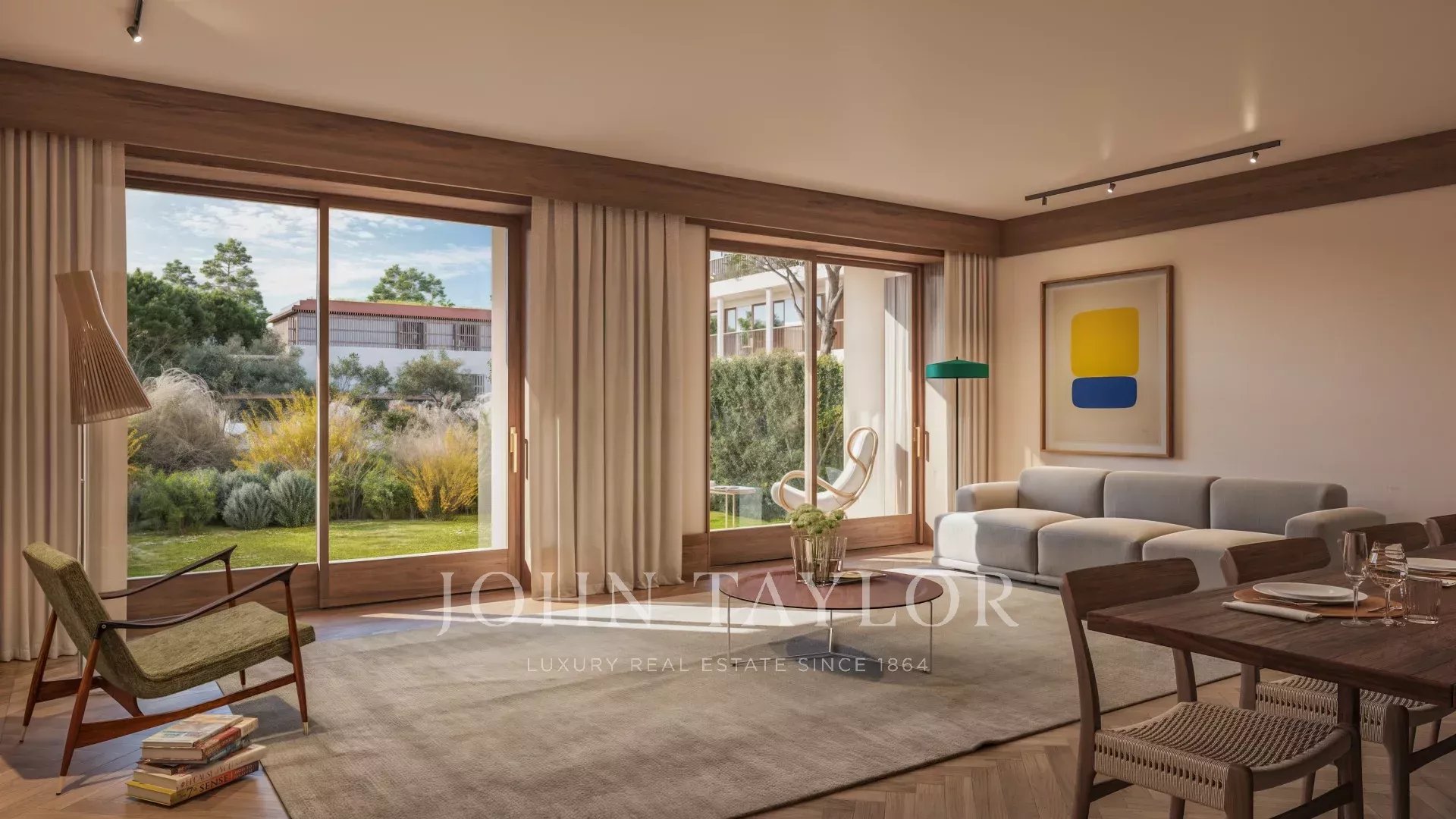 Avec une surface de 147 m², l’appartement dispose au rez-de-chaussée d’un vaste salon-salle à manger, d’une cuisine entièrement équipée, d’une cuisine de service, d’une salle de bains pour invités et d’un salon TV. Les espaces de vie s’ouvrent sur une terrasse avec un coin repas extérieur et une zone de détente, ainsi qu’un jardin privé.