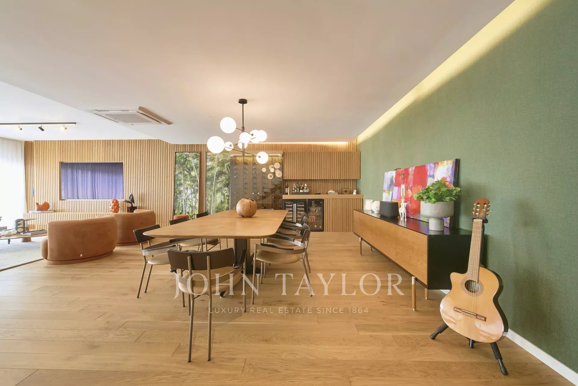 Au rez-de-jardin, un espace de vie supplémentaire avec cuisine offre une flexibilité d’aménagement, pouvant servir de salon, salle de cinéma ou bureau. Ce niveau comprend également un garage privé pouvant accueillir quatre voitures, garantissant confort et sécurité.