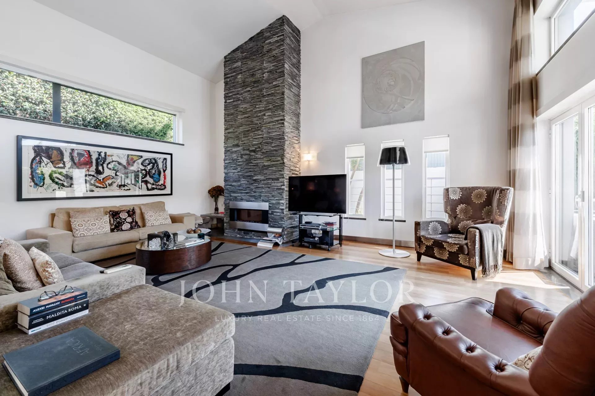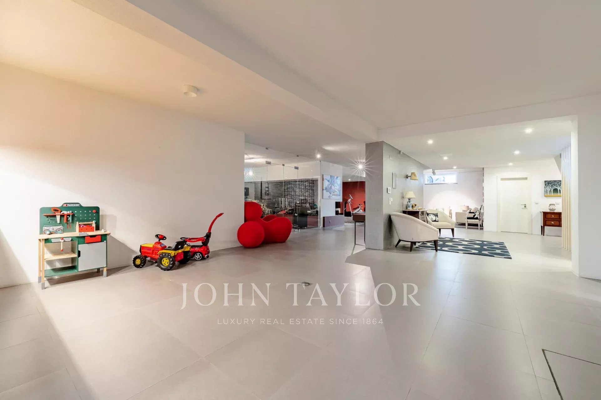 Le rez-de-chaussée vous accueille avec un superbe salon doté de plafonds de plus de 5 mètres de haut, inondant l'espace de lumière naturelle et créant une sensation de volume exceptionnelle. La cuisine moderne est entièrement équipée et s'ouvre sur le jardin et la piscine chauffée, idéale pour en profiter toute l'année. A ce niveau, vous trouverez également la suite parentale avec un accès direct au jardin, ainsi qu'un WC pour les invités.