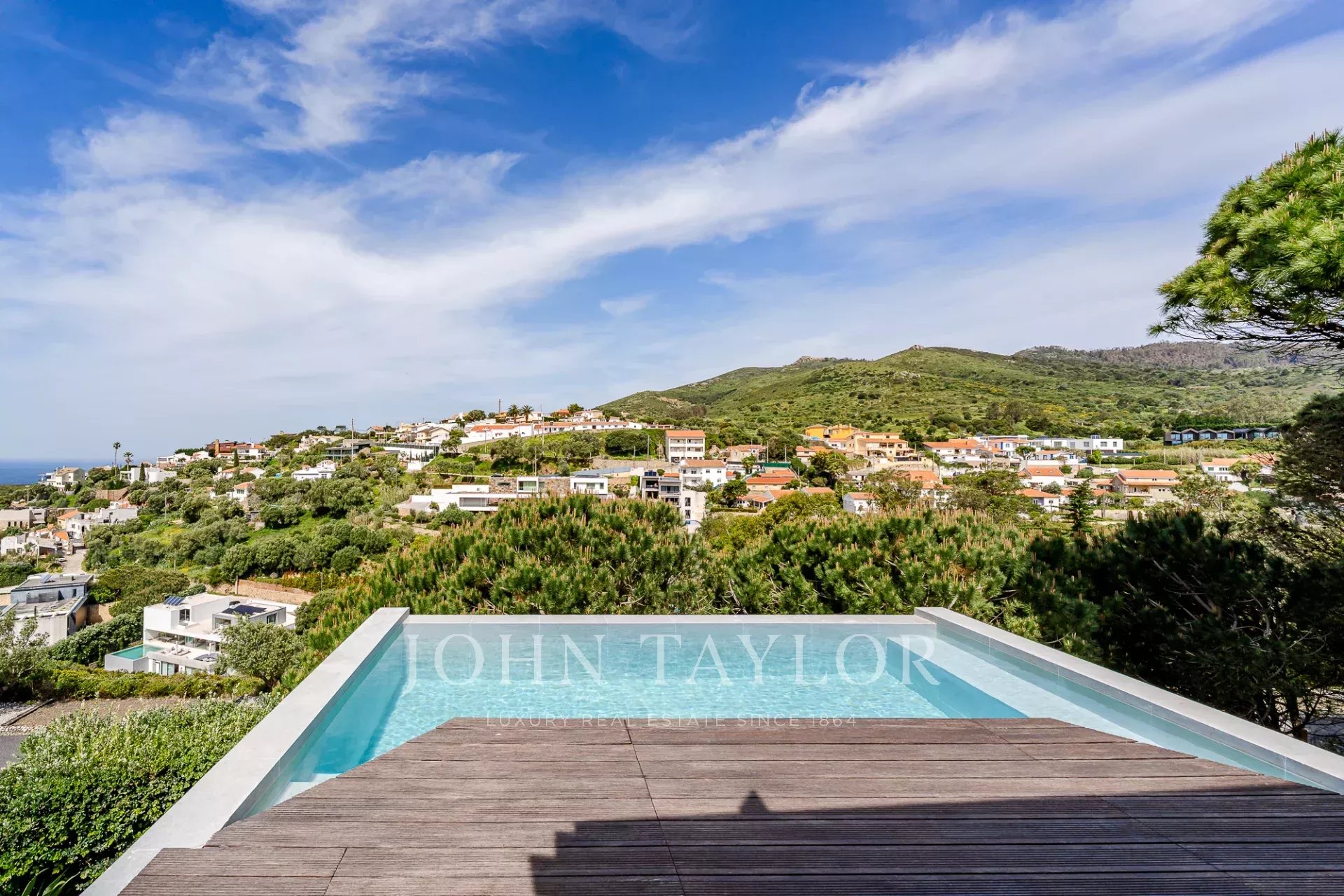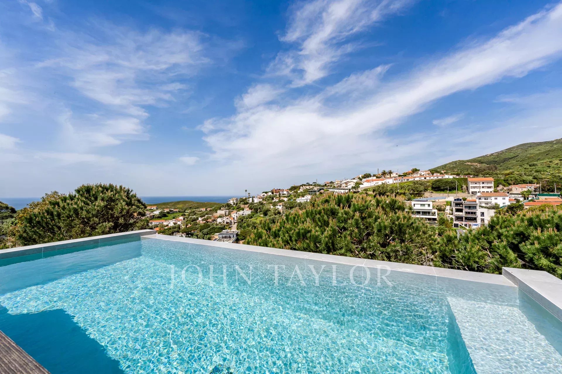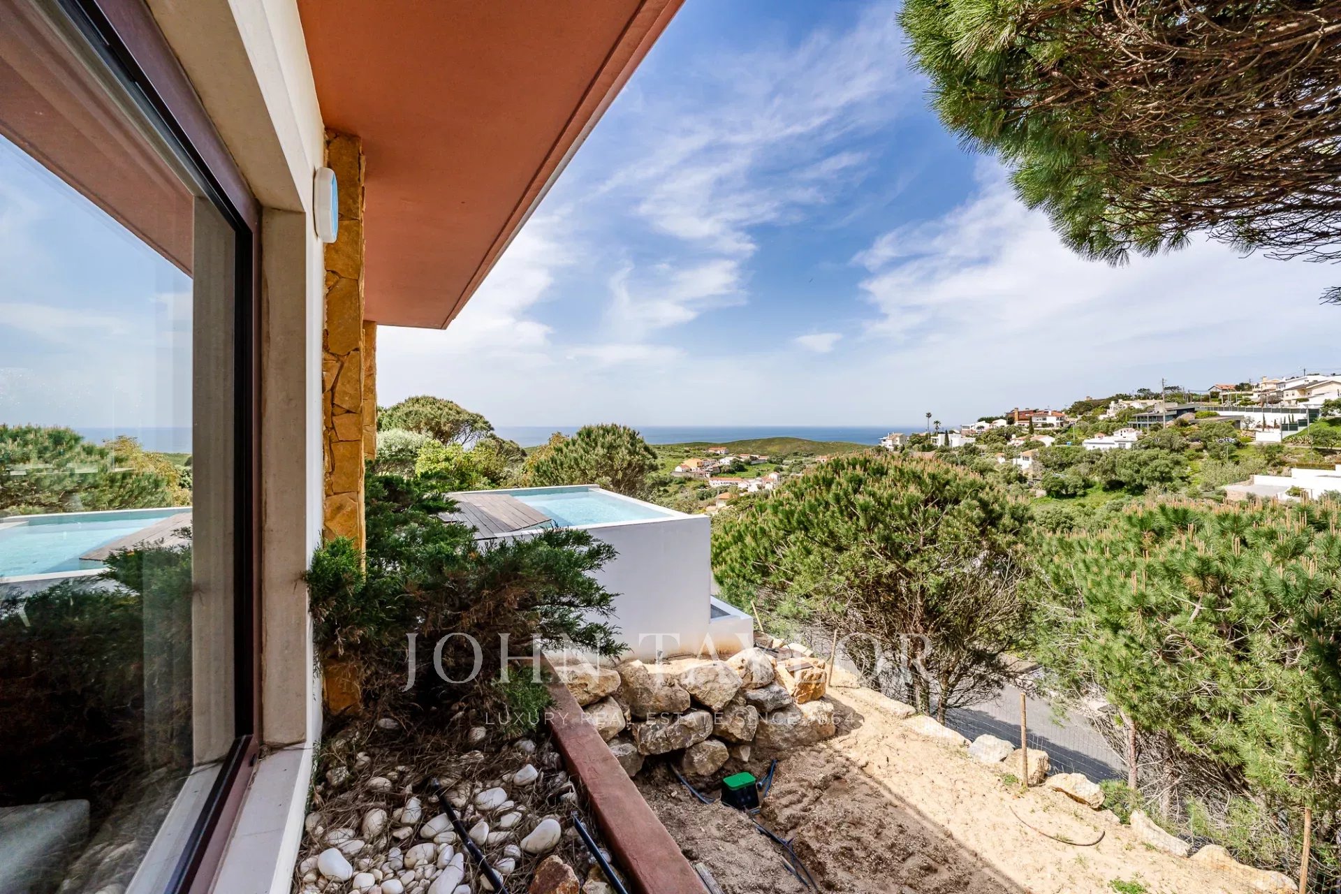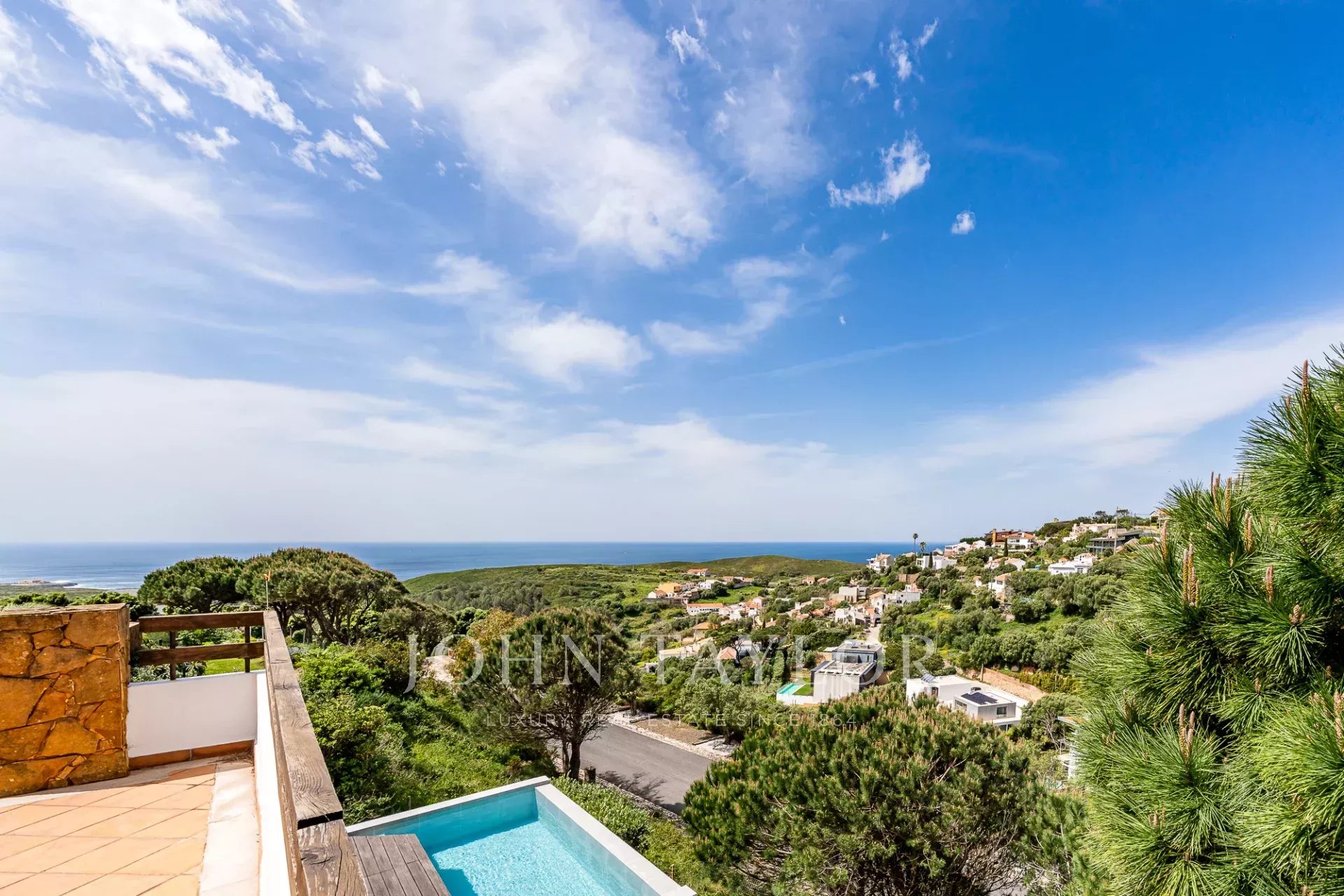 Située dans une copropriété privée sécurisée près de la baie de Guincho, cette villa offre des vues ininterrompues sur l'océan Atlantique depuis de nombreuses pièces et espaces extérieurs. Elle se distingue par sa position surélevée et ses perspectives ouvertes, la mer étant visible depuis les espaces de vie, la terrasse et la piscine privée.