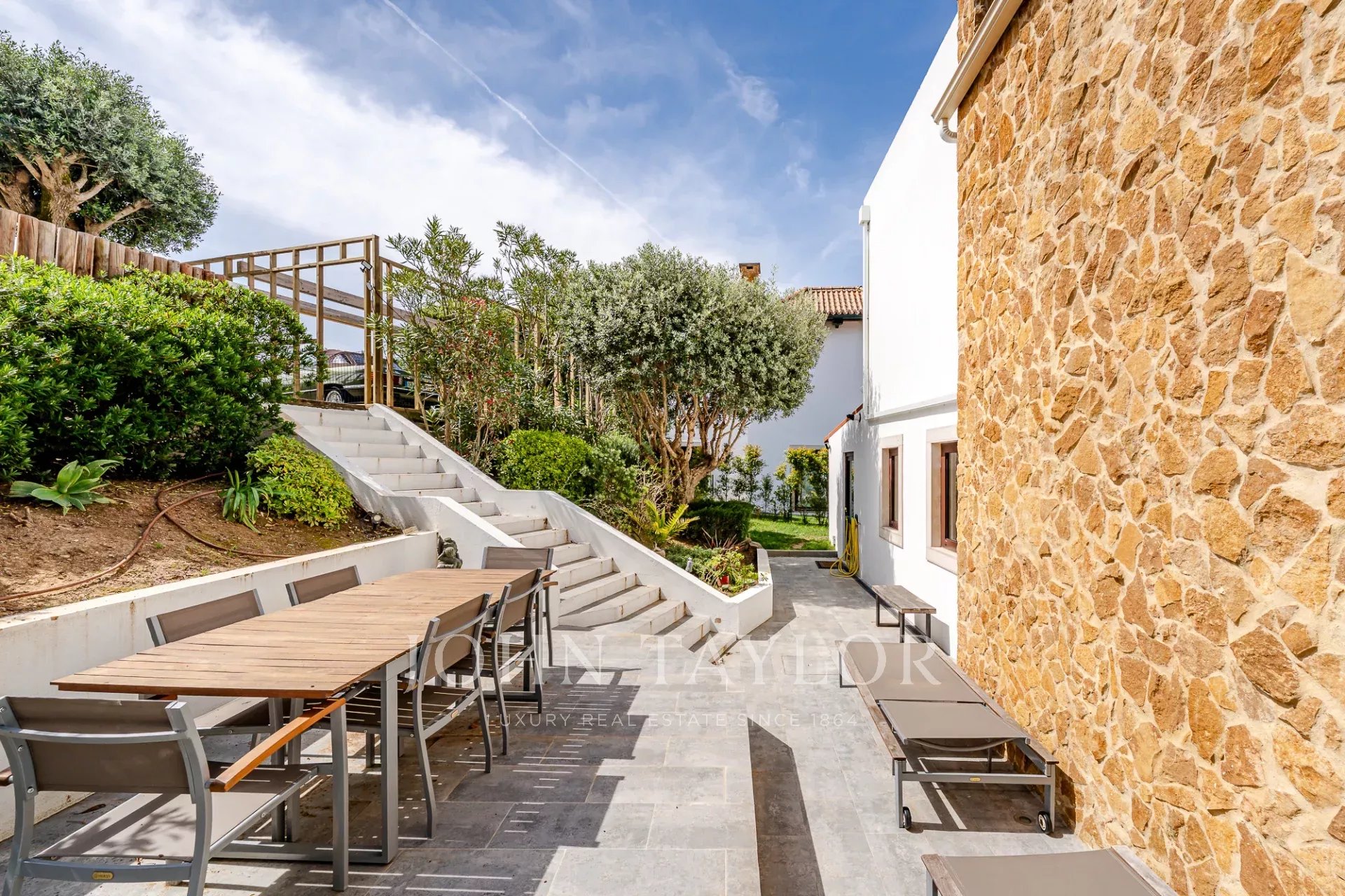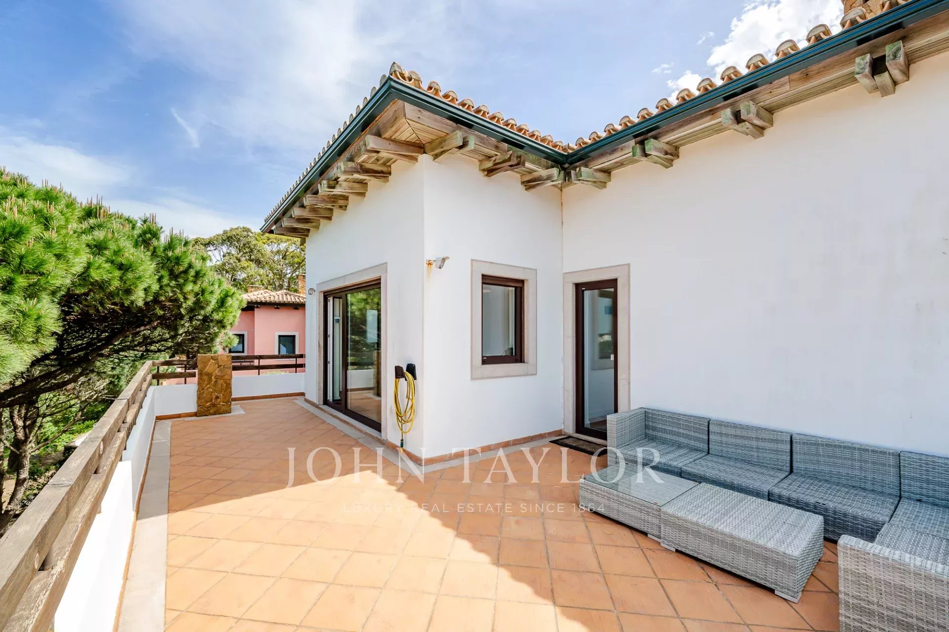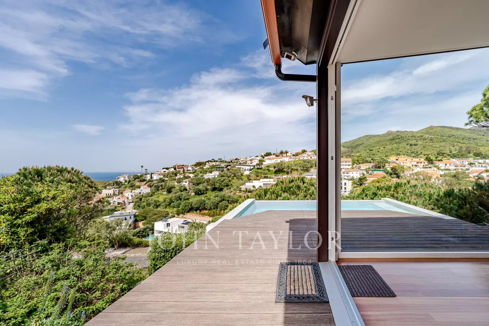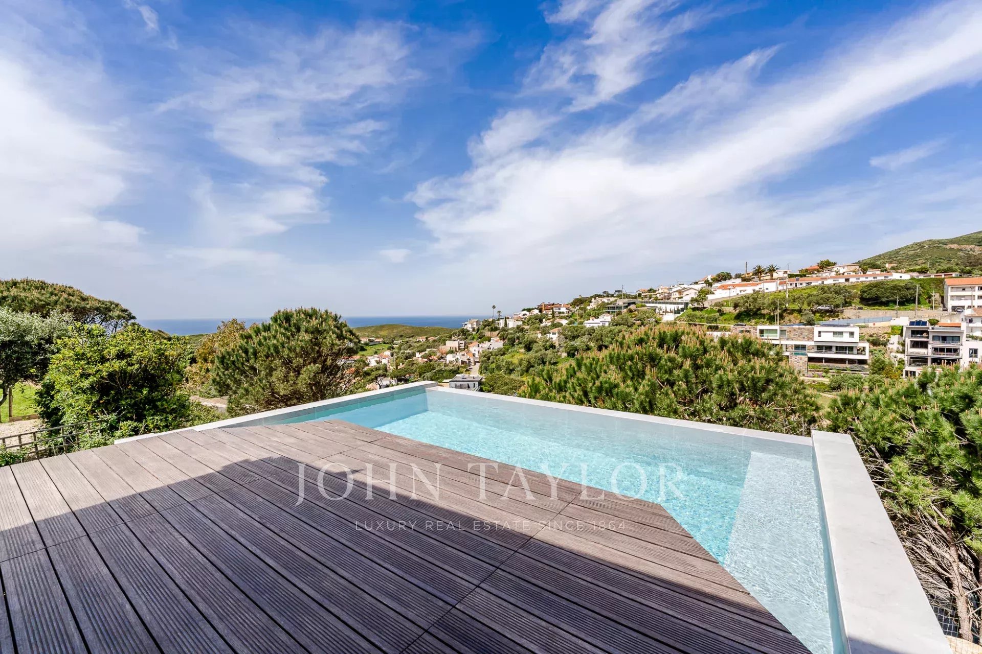 Située dans une copropriété privée sécurisée près de la baie de Guincho, cette villa offre des vues ininterrompues sur l'océan Atlantique depuis de nombreuses pièces et espaces extérieurs. Elle se distingue par sa position surélevée et ses perspectives ouvertes, la mer étant visible depuis les espaces de vie, la terrasse et la piscine privée.