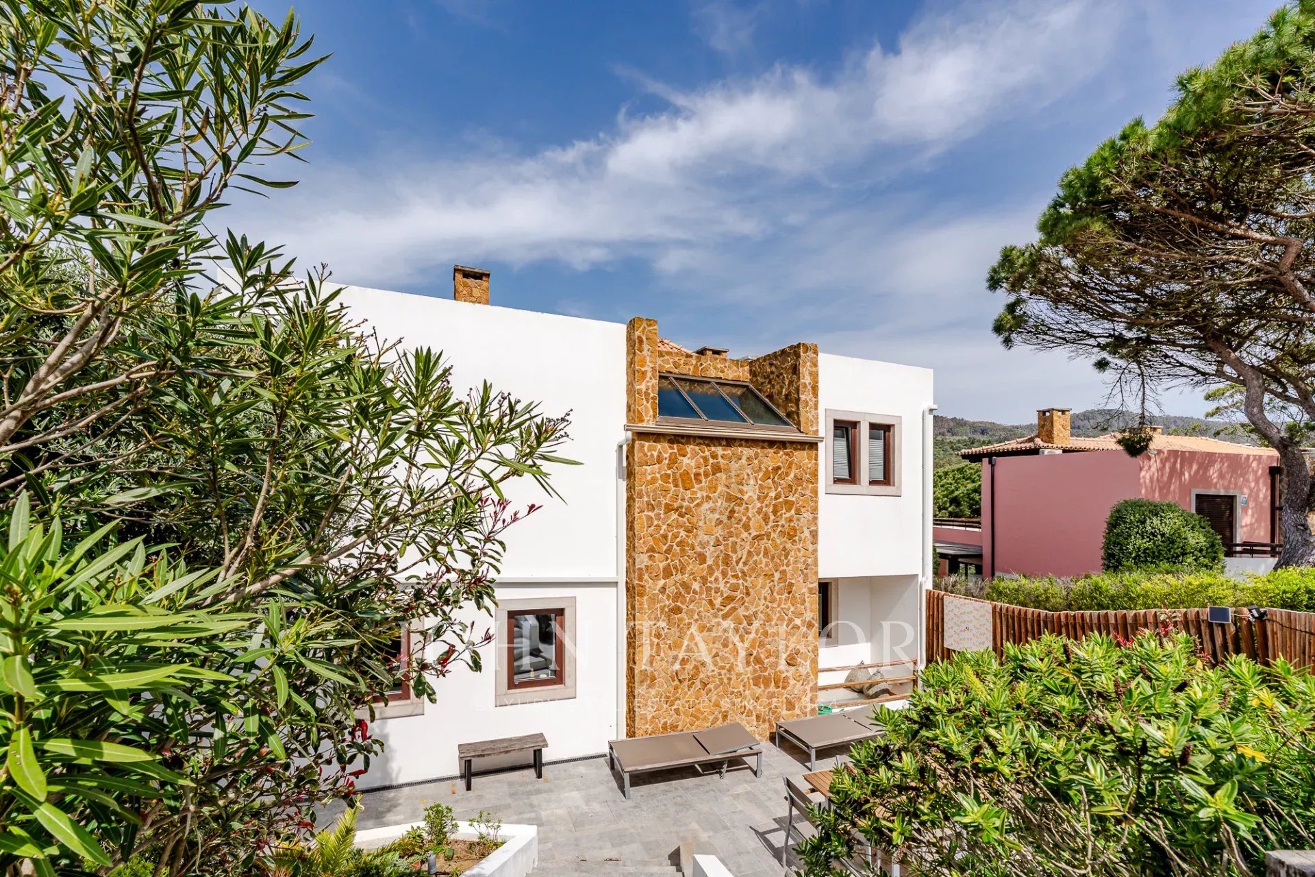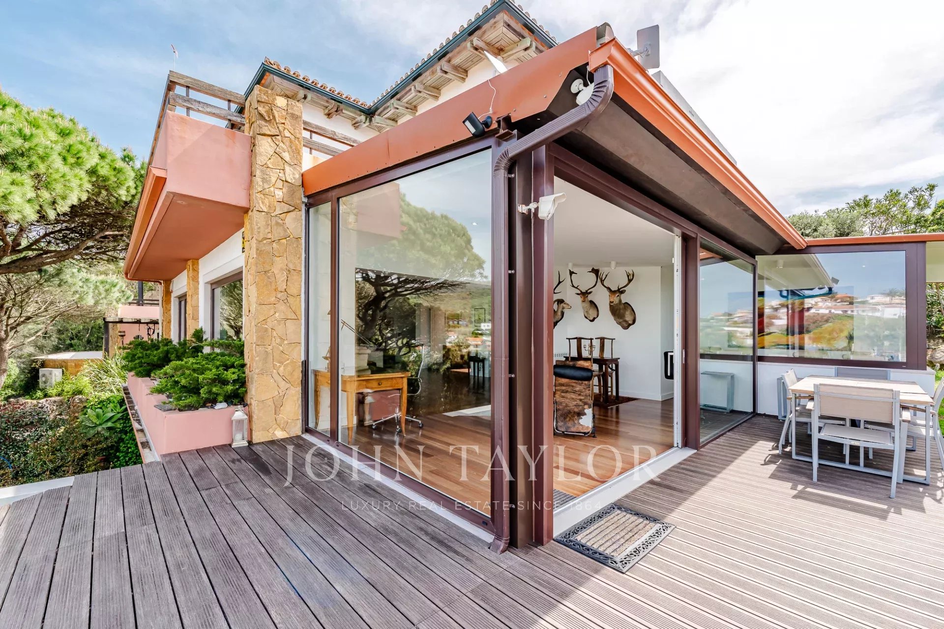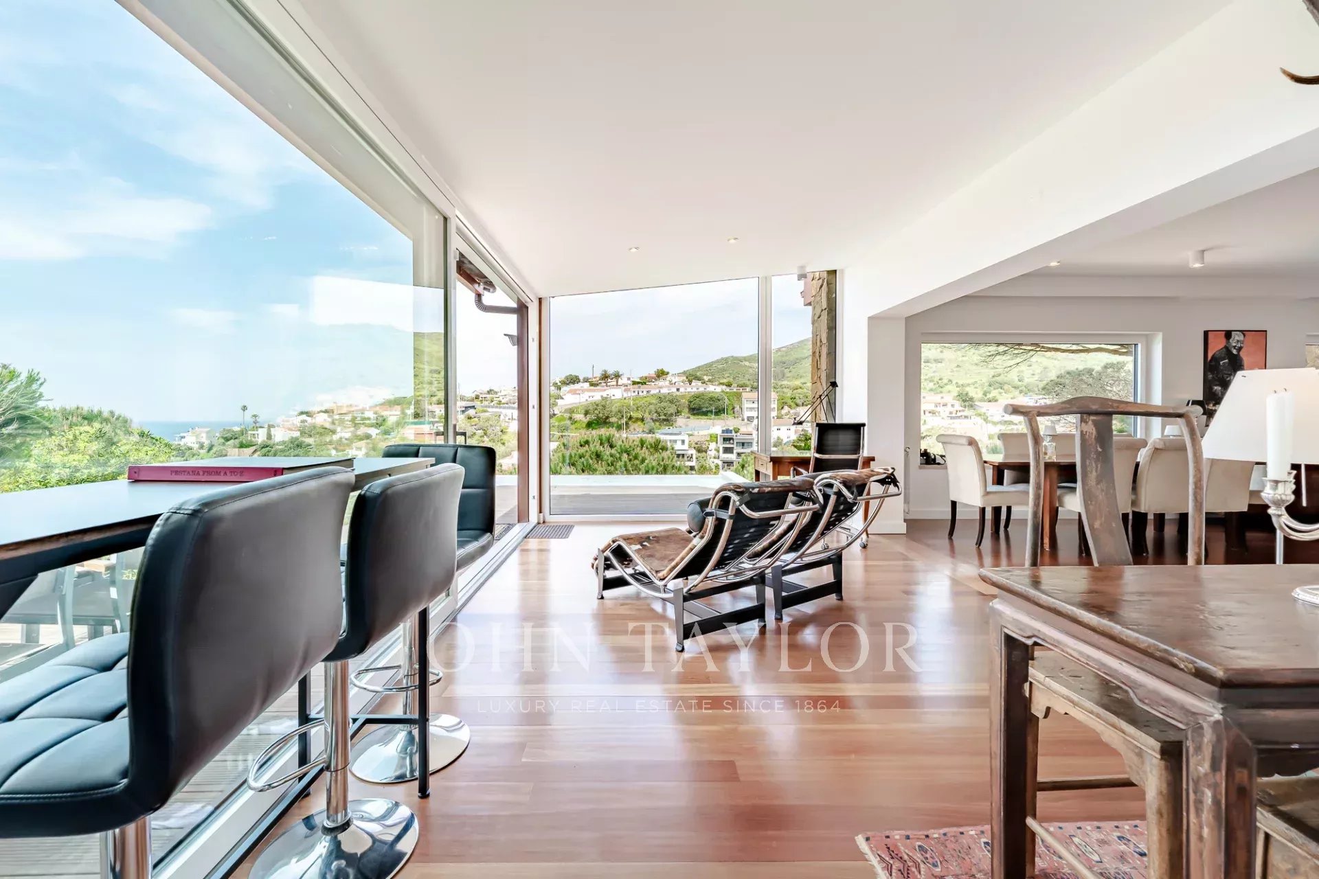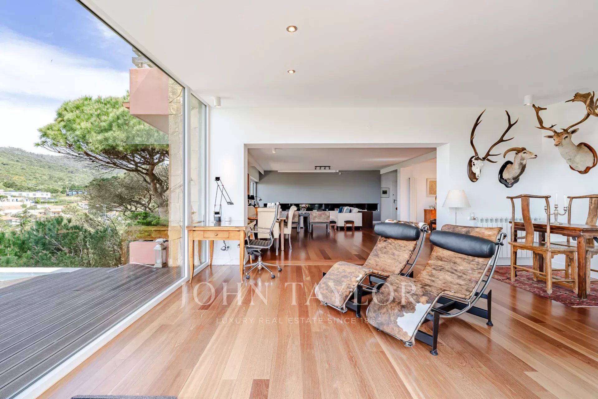 Située dans une copropriété privée sécurisée près de la baie de Guincho, cette villa offre des vues ininterrompues sur l'océan Atlantique depuis de nombreuses pièces et espaces extérieurs. Elle se distingue par sa position surélevée et ses perspectives ouvertes, la mer étant visible depuis les espaces de vie, la terrasse et la piscine privée.