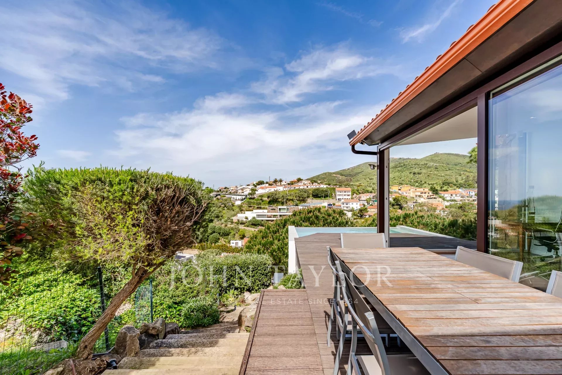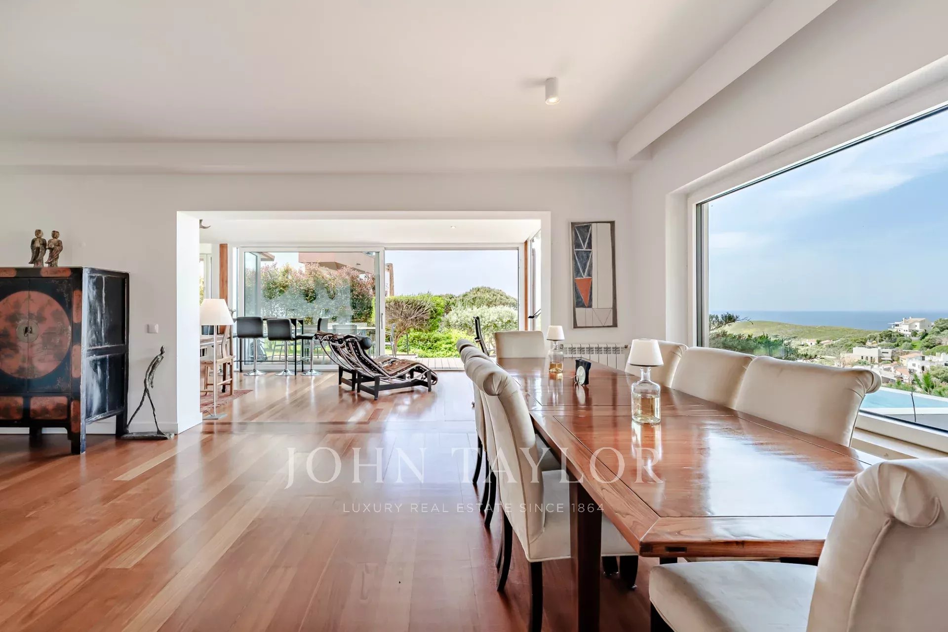 La terrasse extérieure et la piscine privée sont placées de manière à maximiser la vue sur la mer, offrant un lien étroit avec le paysage environnant et une intimité totale. Chaque niveau de la maison profite de l'orientation et de la vue, ce qui en fait une rareté dans cette partie de la côte.