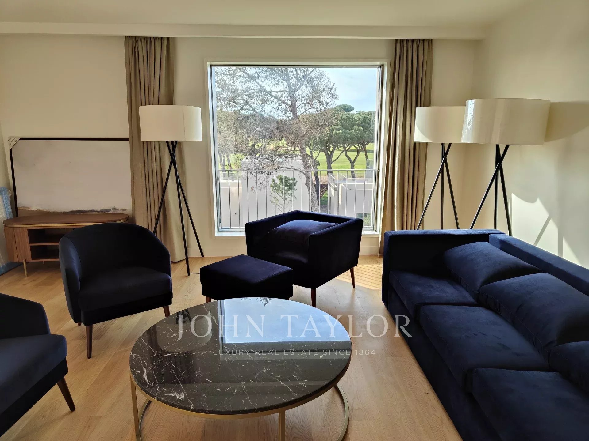 Dans cet appartement T4 en duplex de 261m2 de surface brute, on entre dans un hall de 16m2, relié au grand séjour de 44m2, avec de grandes baies vitrées du sol au plafond qui offrent une agréable vue sur le golf.
