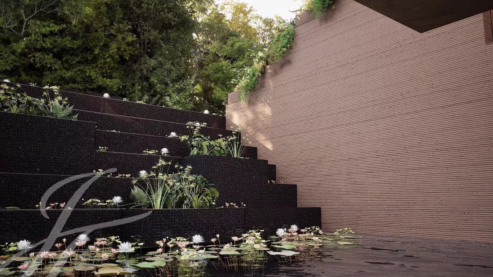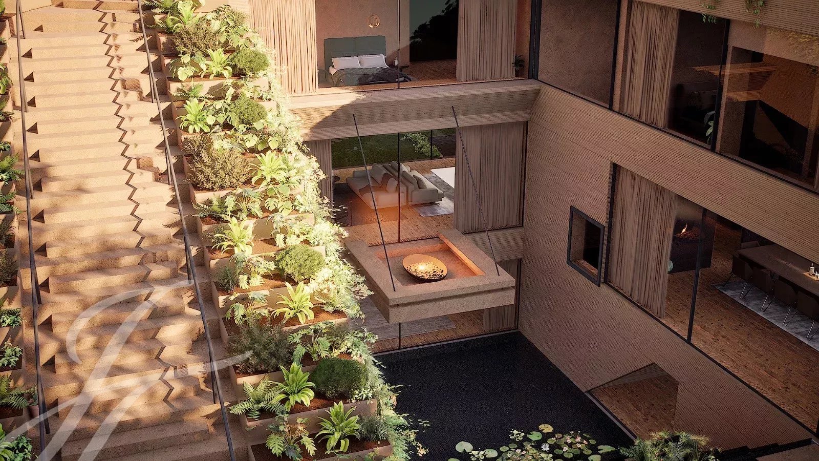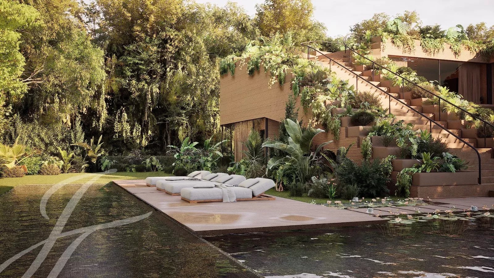 L'étage inférieur se distingue par son espace bien-être, avec une salle de sport, un sauna et une vue imprenable sur la cour intérieure, qui est reliée à la piscine par une cascade. Ce niveau comprend également une chambre de service, des espaces techniques multifonctionnels et un garage pouvant accueillir jusqu'à quatre véhicules.