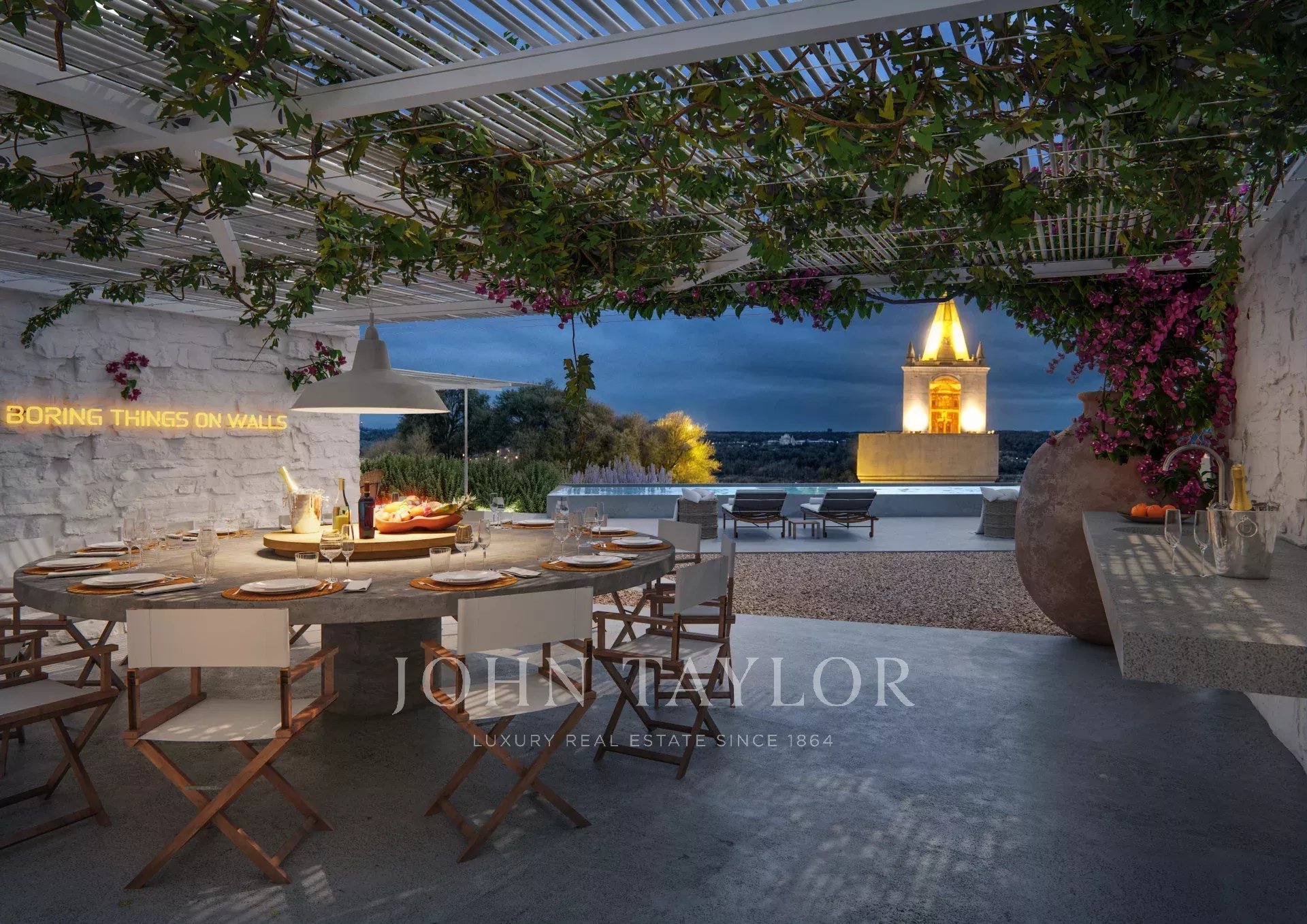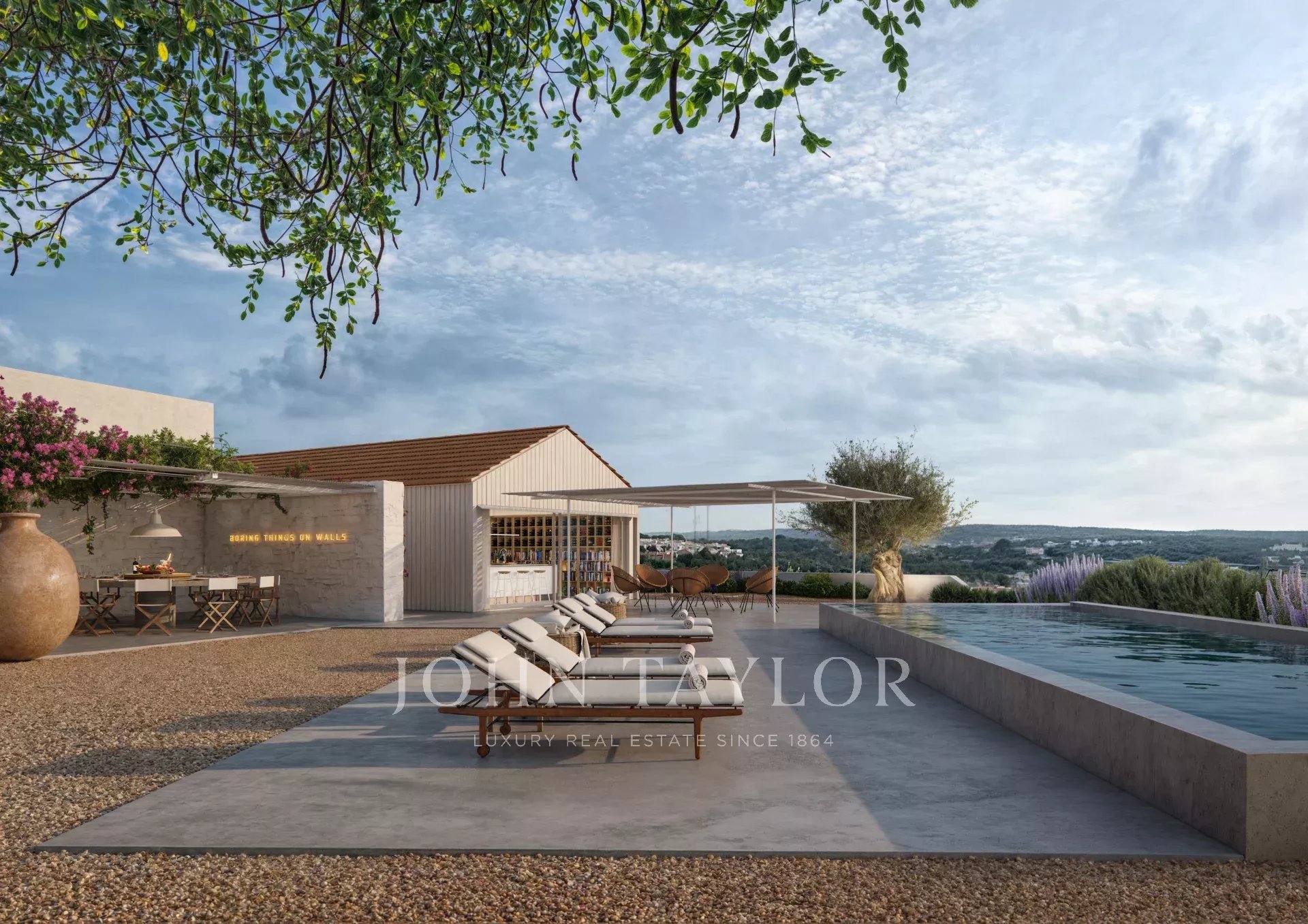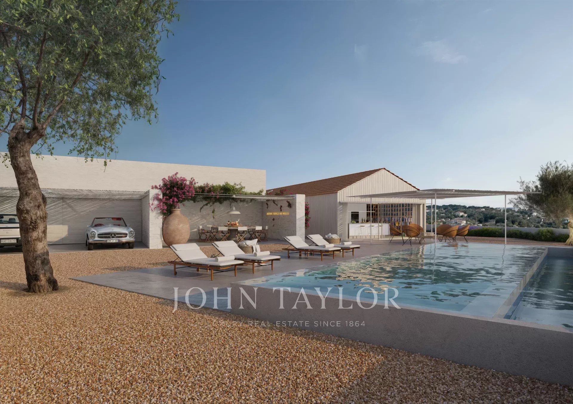 À l’extérieur, on trouve un garage double avec borne de recharge pour véhicules électriques, une salle à manger couverte pour 12 personnes et une piscine à débordement en béton de 12x2,8 m, avec service d’entretien. La propriété dispose également d’un espace de rangement pour le mobilier de piscine et d’un système de traitement de l’eau.