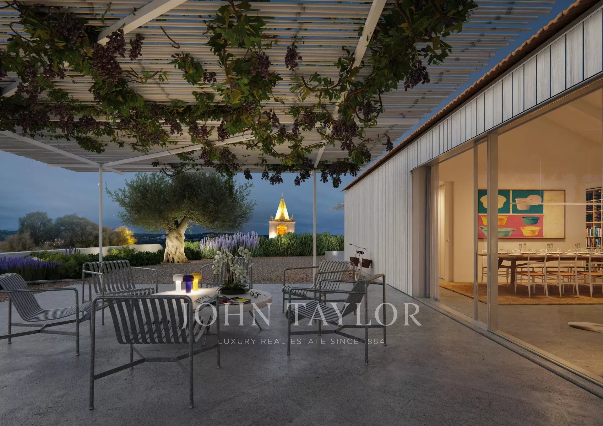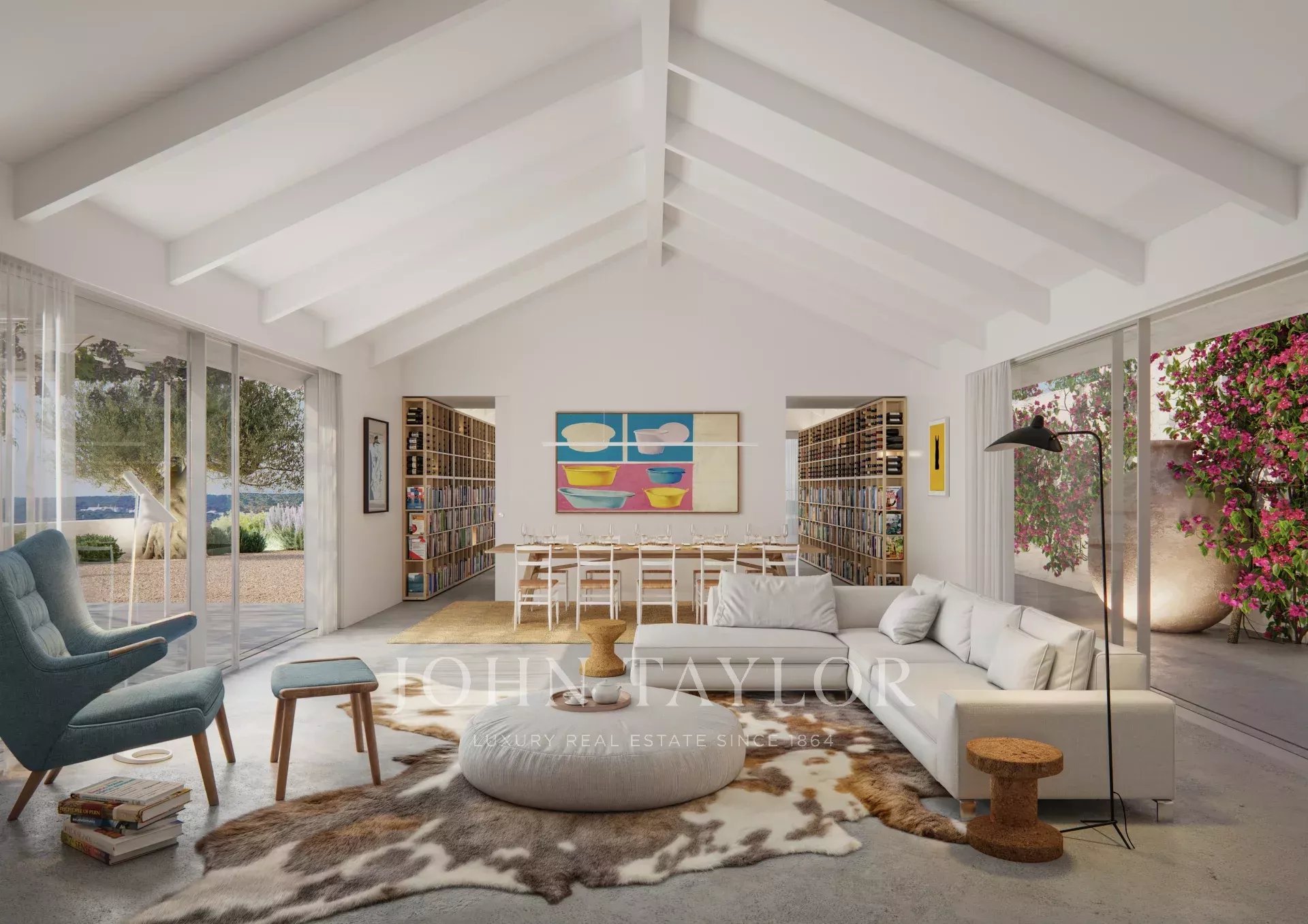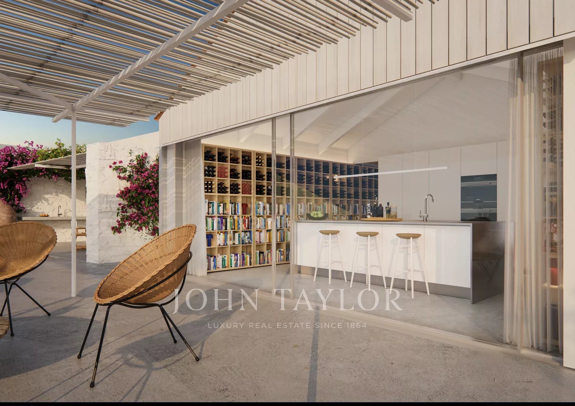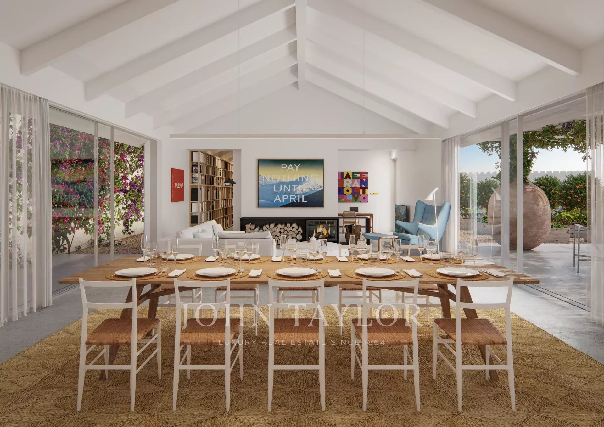 À l’extérieur, on trouve un garage double avec borne de recharge pour véhicules électriques, une salle à manger couverte pour 12 personnes et une piscine à débordement en béton de 12x2,8 m, avec service d’entretien. La propriété dispose également d’un espace de rangement pour le mobilier de piscine et d’un système de traitement de l’eau.