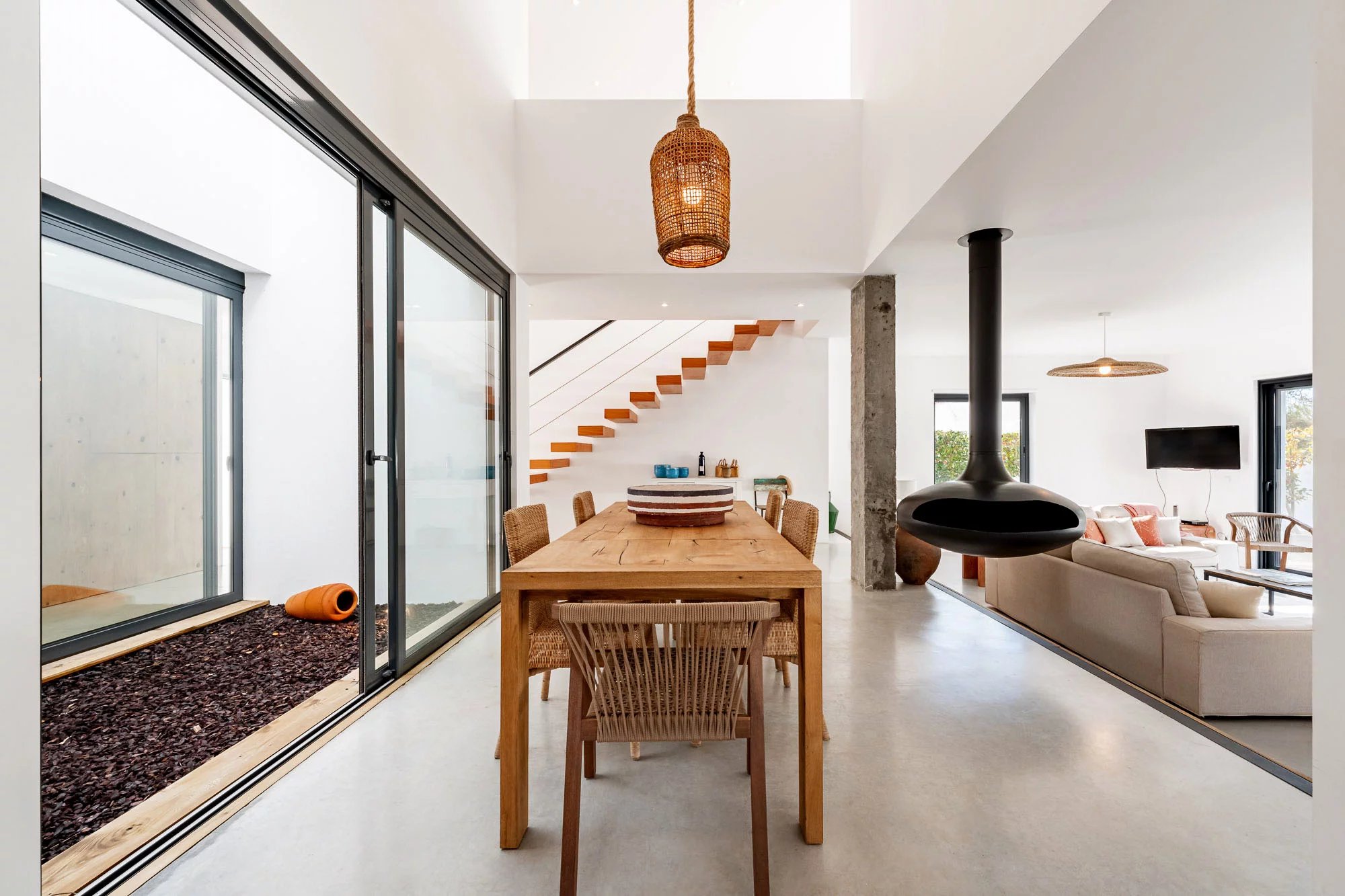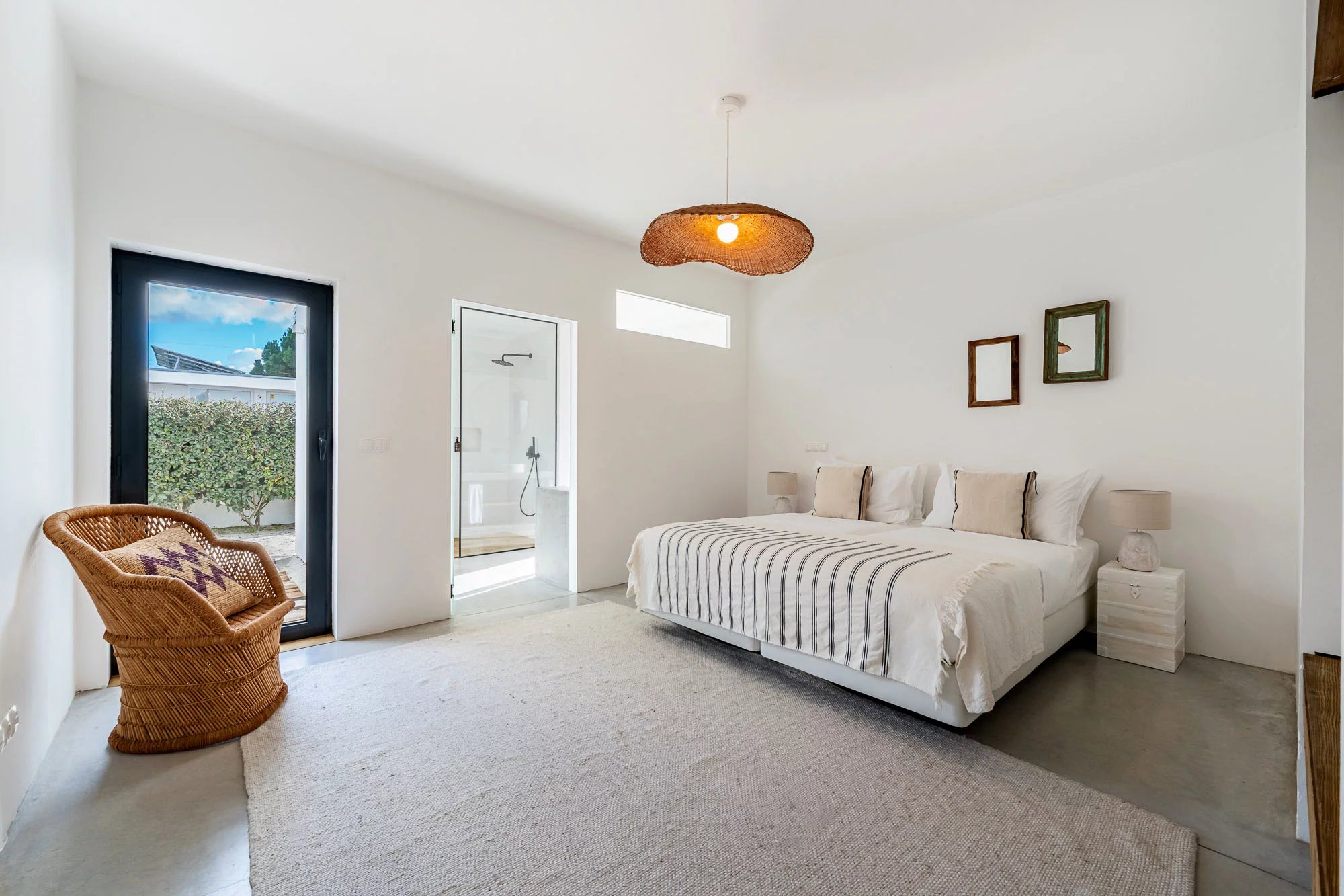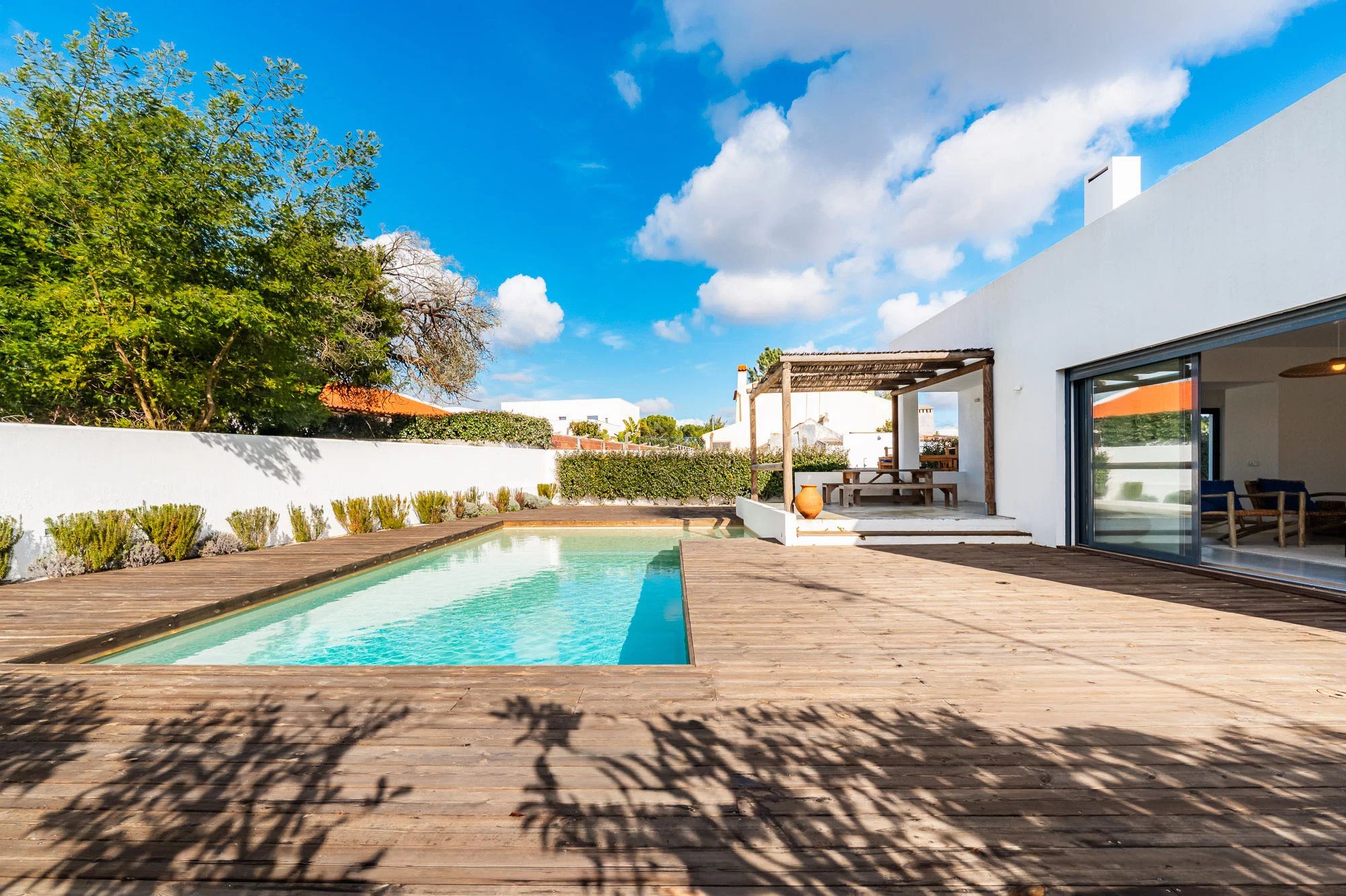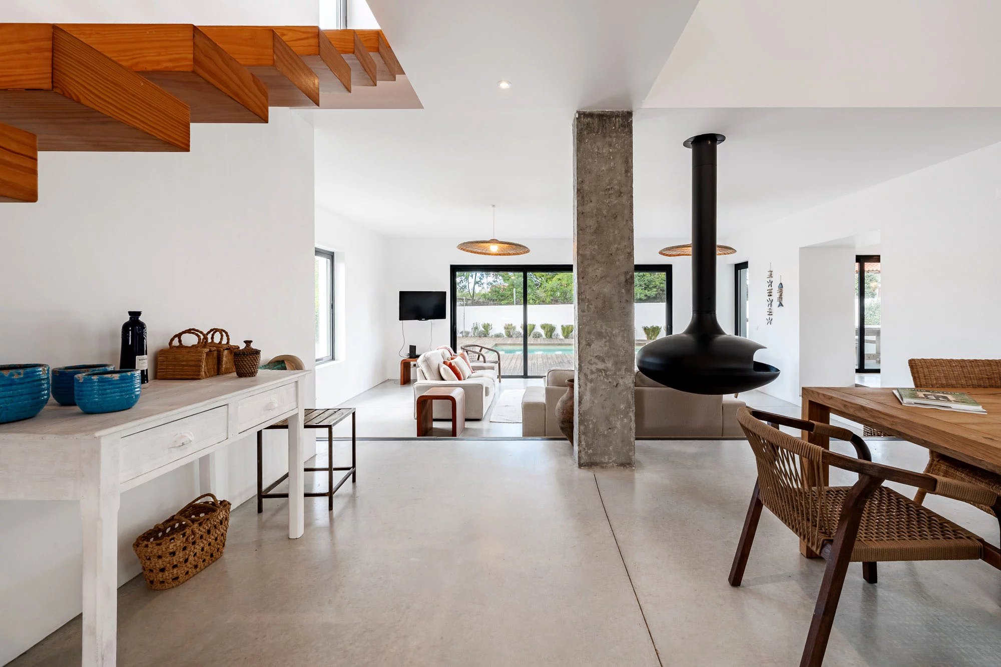Les espaces extérieurs sont conçus pour une vie détendue, avec une piscine privée dotée d'une généreuse terrasse en bois, un jardin paysager et une salle à manger avec barbecue, idéale pour profiter du climat de Comporta. L'intérieur comprend un salon et une cuisine, ainsi que quatre chambres avec salle de bains, deux situées au rez-de-chaussée et deux au premier étage. Le niveau supérieur bénéficie également d'une terrasse spacieuse, idéale pour se détendre ou créer un coin salon supplémentaire.