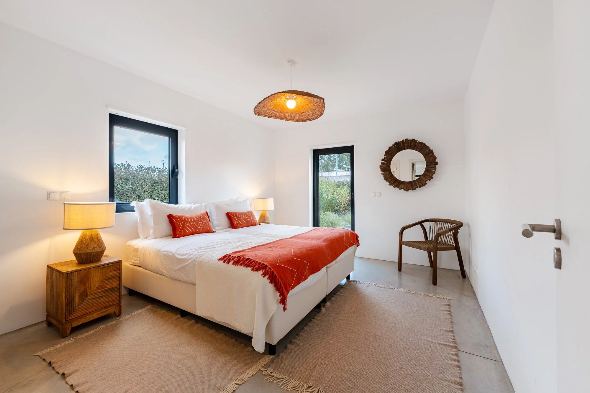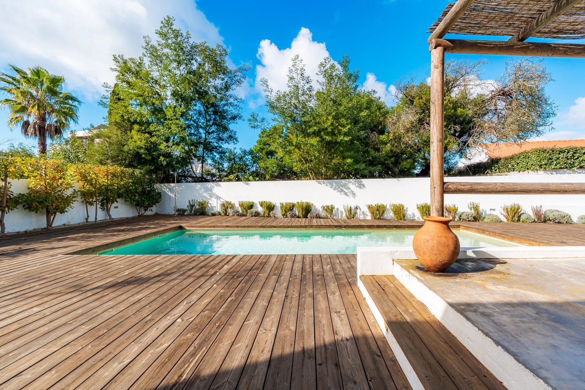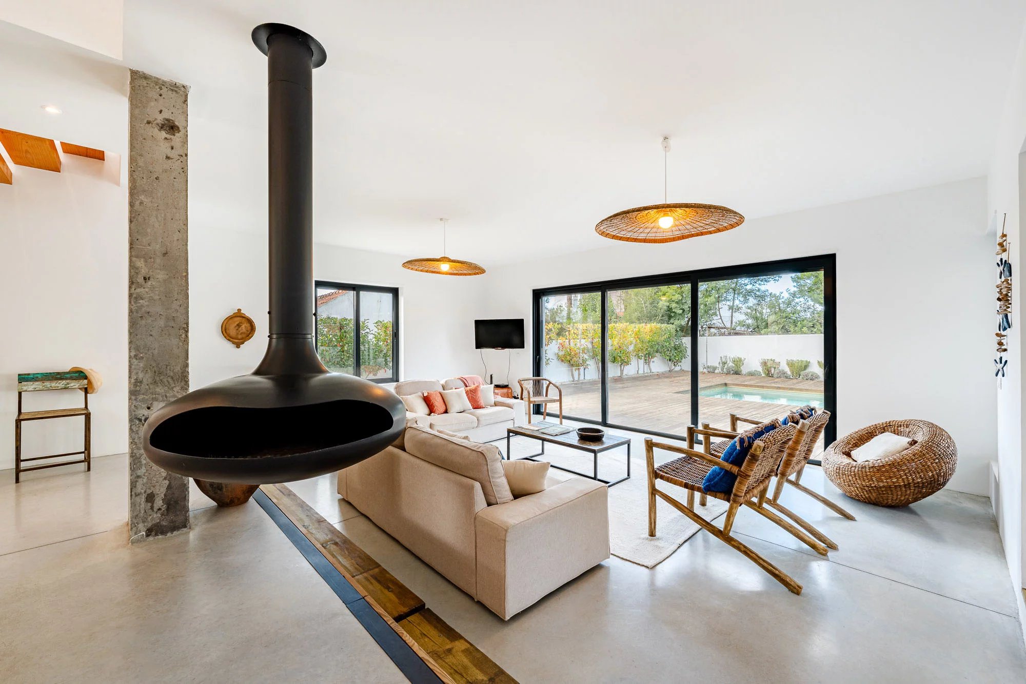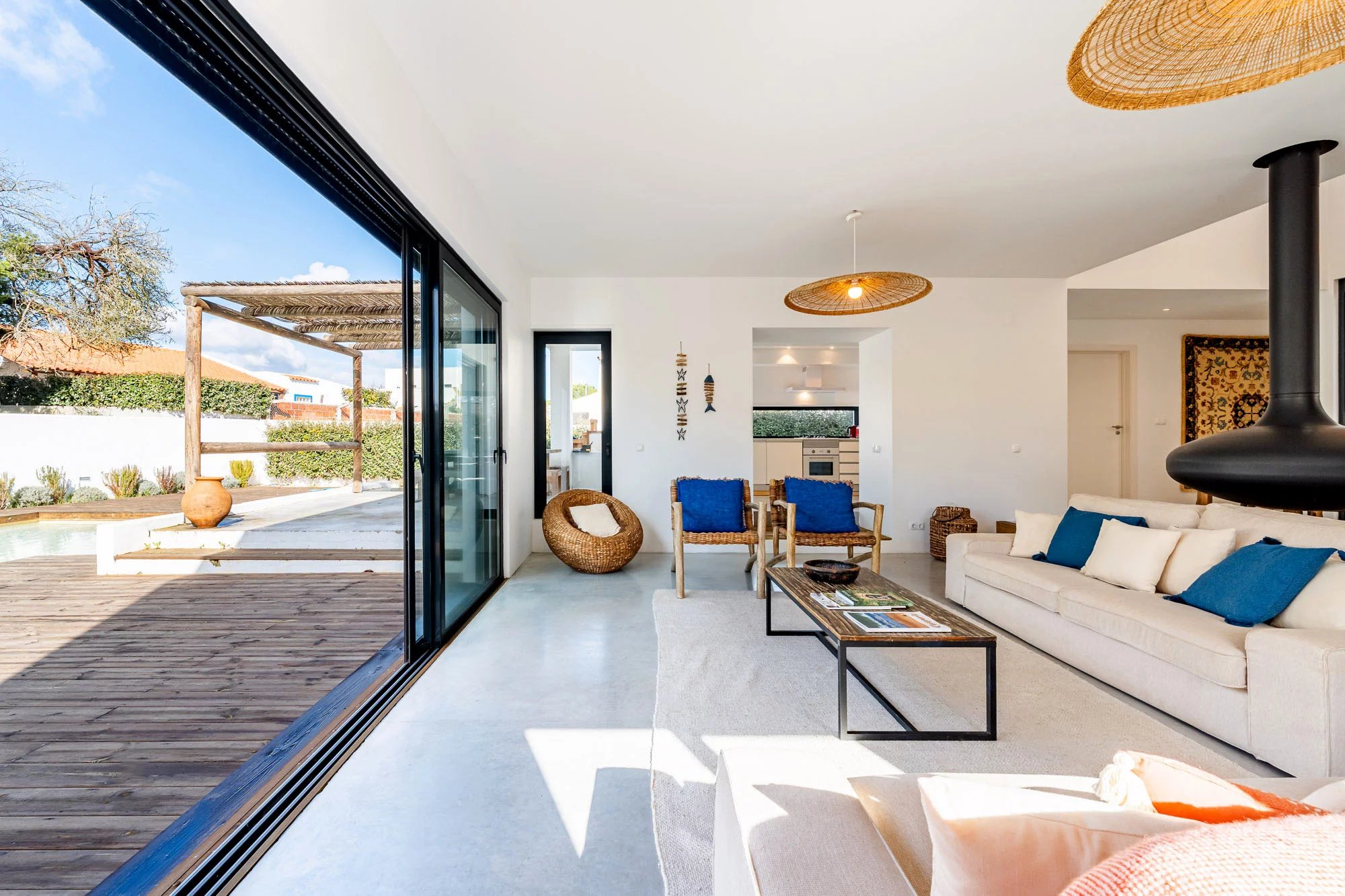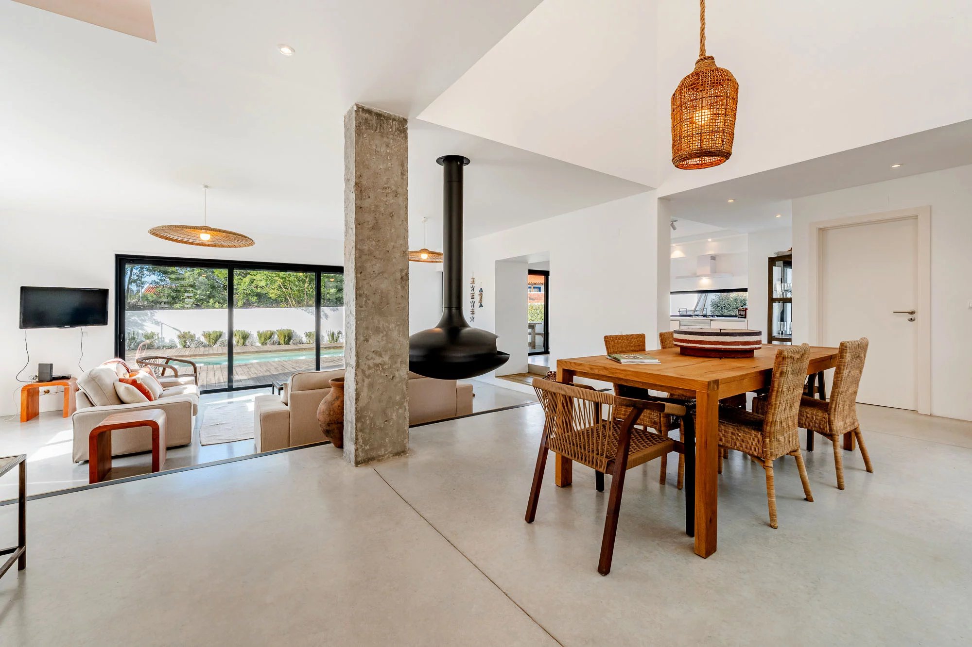 Les espaces extérieurs sont conçus pour une vie détendue, avec une piscine privée dotée d'une généreuse terrasse en bois, un jardin paysager et une salle à manger avec barbecue, idéale pour profiter du climat de Comporta. L'intérieur comprend un salon et une cuisine, ainsi que quatre chambres avec salle de bains, deux situées au rez-de-chaussée et deux au premier étage. Le niveau supérieur bénéficie également d'une terrasse spacieuse, idéale pour se détendre ou créer un coin salon supplémentaire.