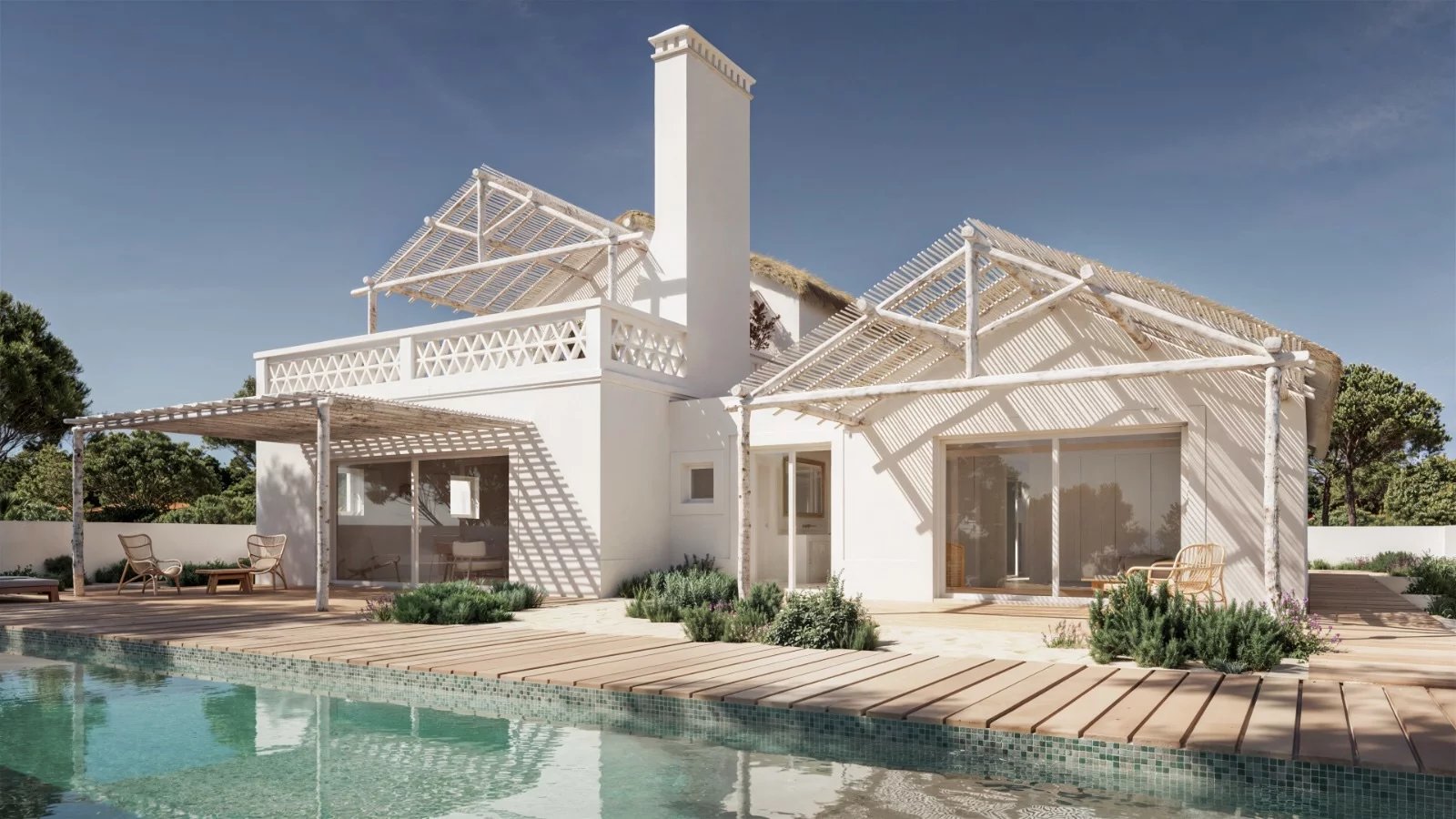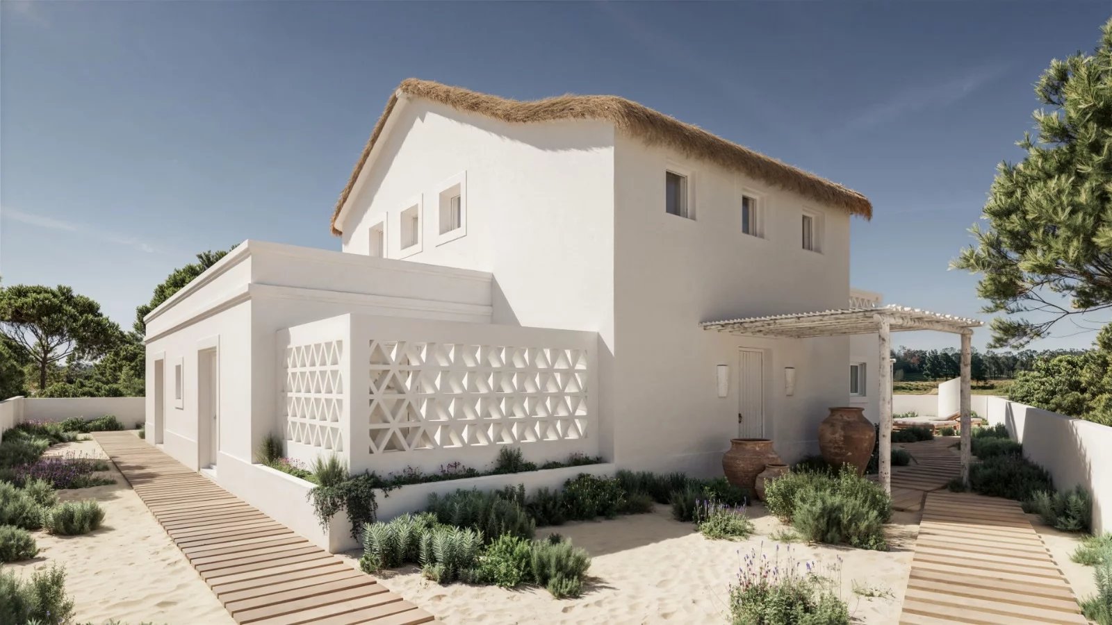 Située à Brejos da Carregueira de Cima, cette villa suit l'architecture traditionnelle de Comporta et offre des équipements modernes pour le confort quotidien. La maison est située sur un terrain privé et offre des vues sur les champs agricoles environnants.