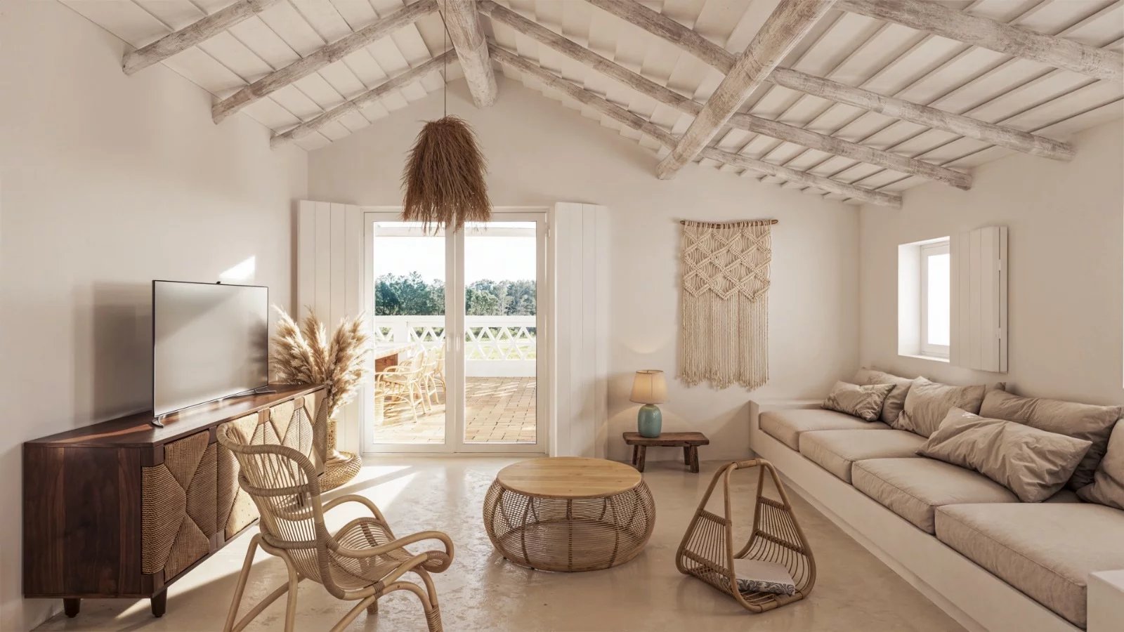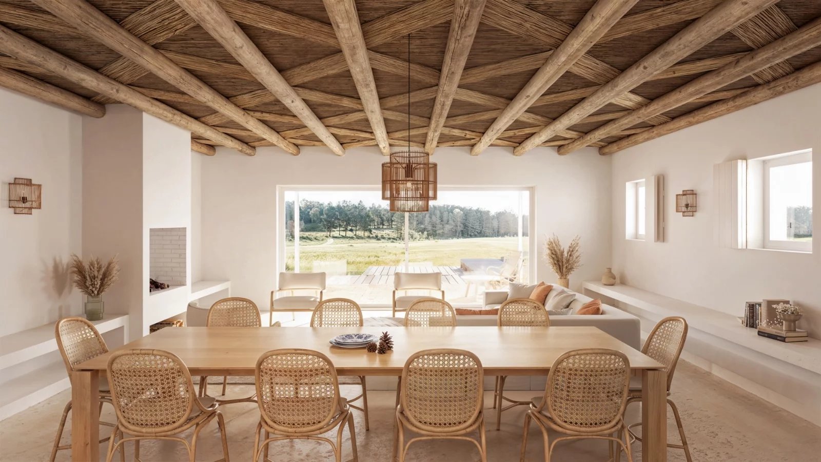 Le salon principal est spacieux et bénéficie d'une bonne lumière naturelle. Une cheminée définit l'espace, tandis que de grandes portes coulissantes s'ouvrent sur la terrasse et la piscine, avec des vues directes sur les champs. Le salon et la salle à manger se connectent naturellement et s'ouvrent sur les espaces extérieurs.