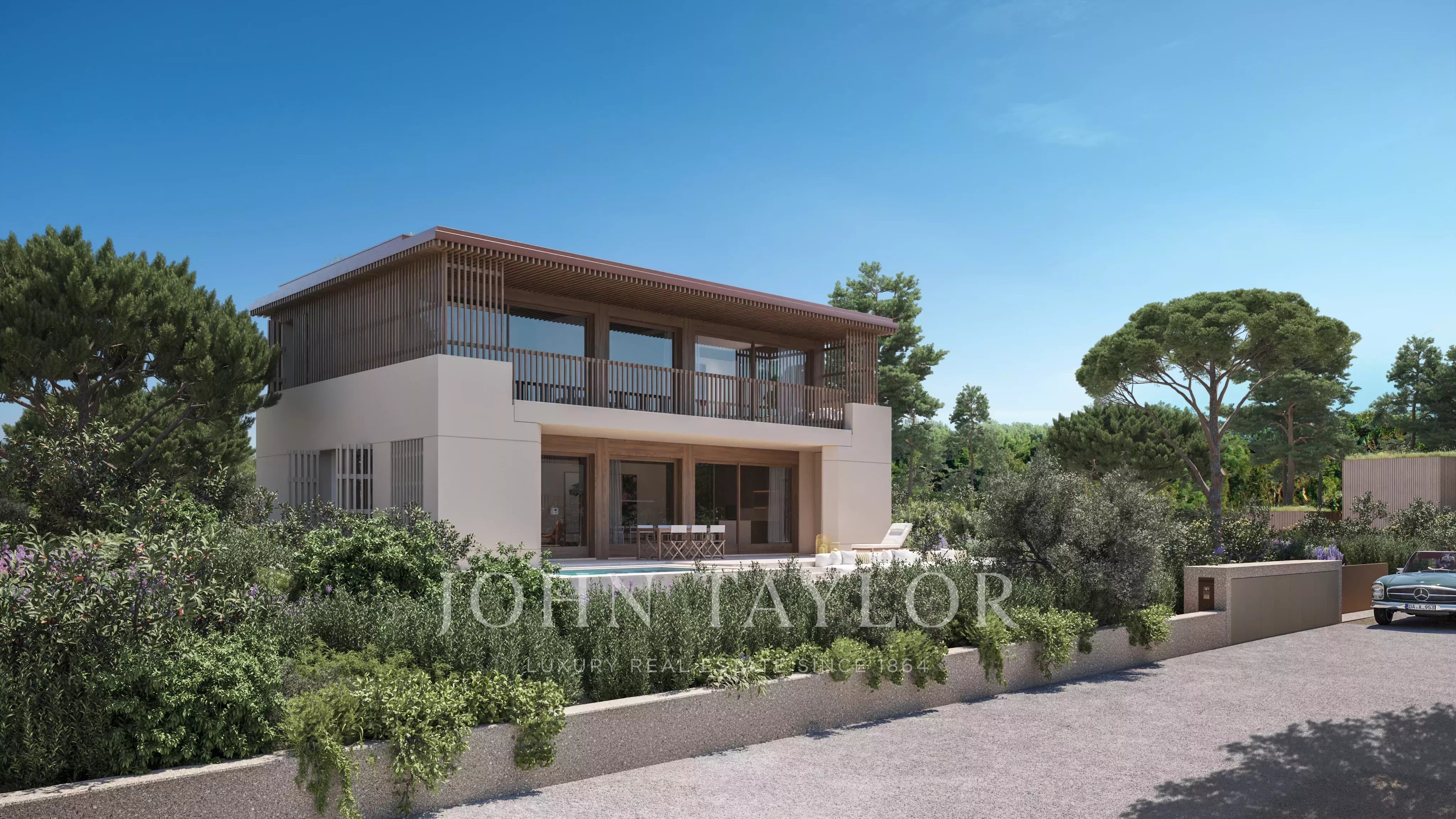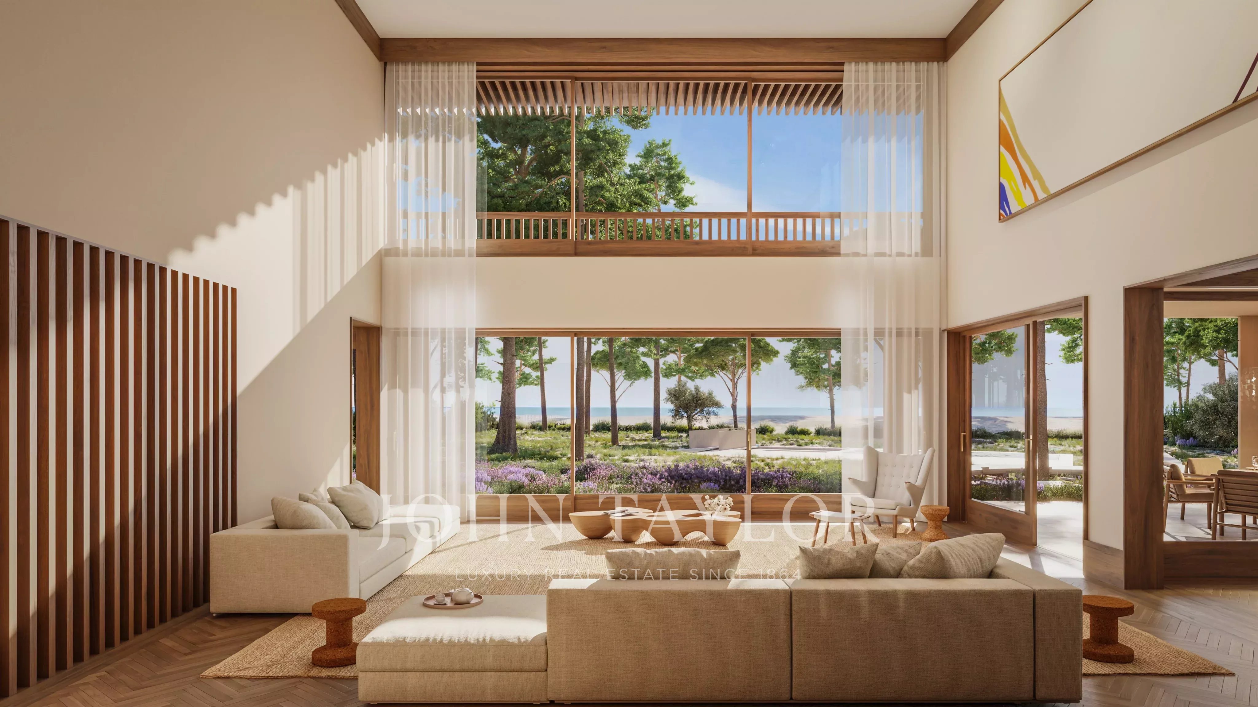 Au rez-de-chaussée, la villa propose un vaste salon, une salle à manger, une cuisine entièrement équipée, une cuisine secondaire, une salle de bain pour invités, un salon TV, un bureau privé, ainsi qu’une suite parentale avec dressing. Les espaces de vie donnent sur une terrasse accueillante, comprenant des espaces extérieurs dédiés aux repas et à la détente. Une grande piscine orientée vers la plage, entourée d’un vaste espace extérieur, complète ce niveau.