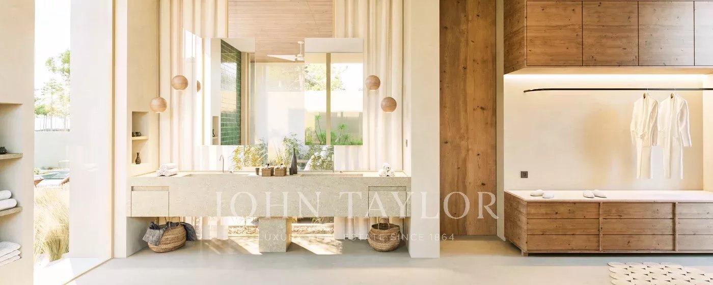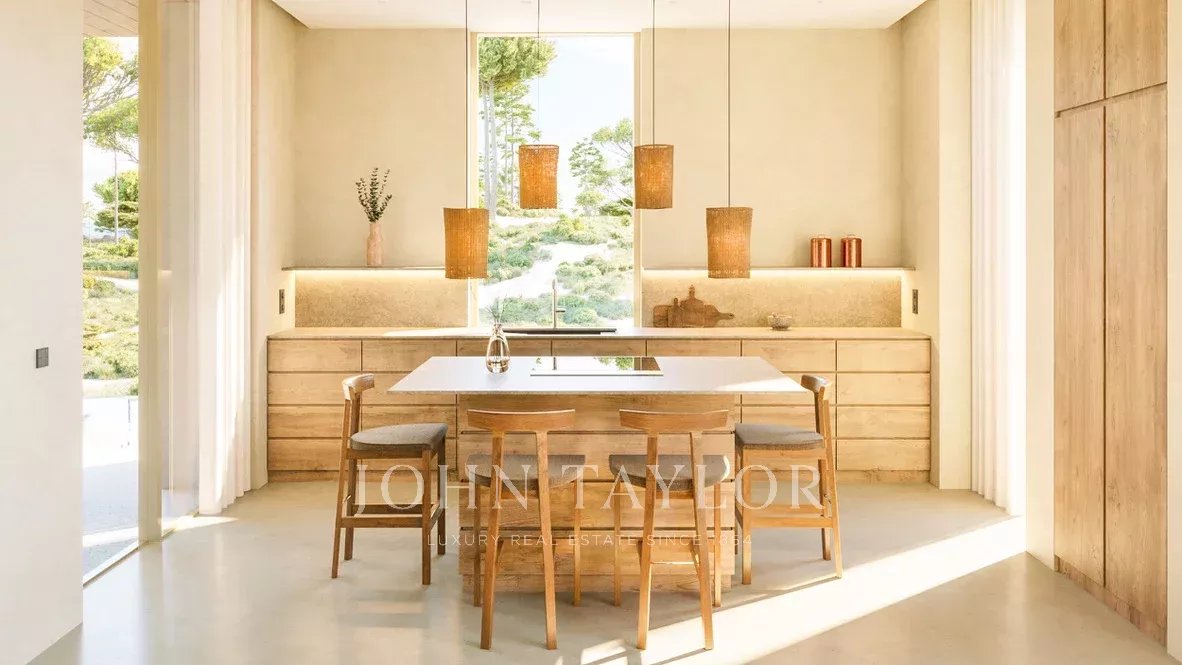 Implantée sur un terrain de 2 800 m², la villa de 315 m² comprend deux suites dans la maison principale ainsi qu’une troisième suite dans une maison d’invités indépendante. La spacieuse cuisine ouverte, intégrée à la salle à manger et au salon, a été conçue pour maximiser la lumière naturelle et offrir une vue imprenable sur les oliveraies et la forêt de chênes-lièges. À l’extérieur, une piscine à débordement, une cuisine extérieure, un espace fire pit, de vastes terrasses et un parking couvert pour deux voitures créent un cadre de vie en parfaite harmonie avec la nature.