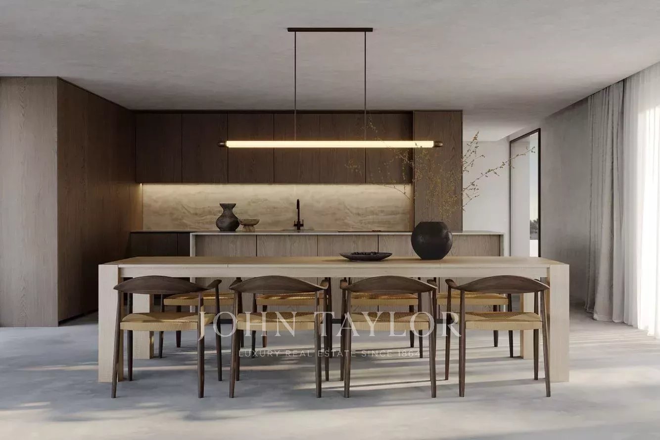 Le rez-de-chaussée comprend un hall d'entrée, une salle de bains pour les invités et un spacieux salon et salle à manger de 66 m² avec cuisine intégrée, conçu pour maximiser la lumière naturelle et la connexion avec l'extérieur. Ce niveau comprend également une chambre avec salle de bain et un accès direct aux terrasses et à la piscine.