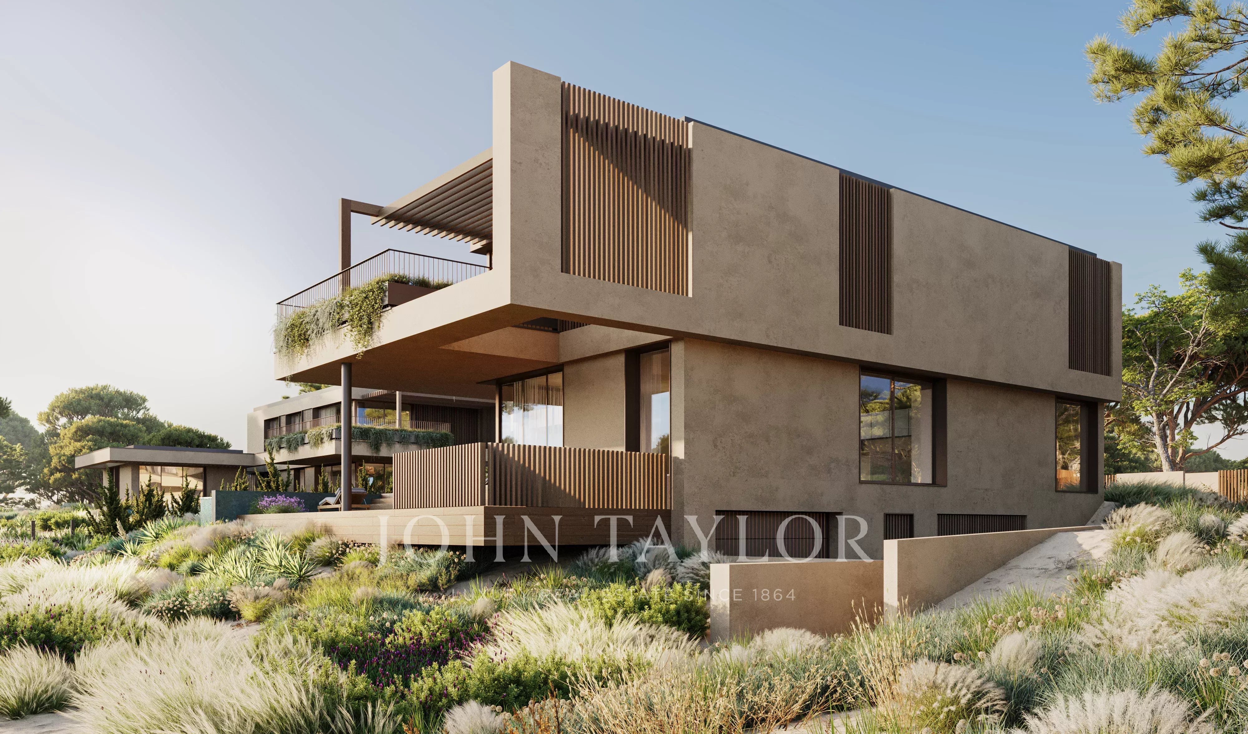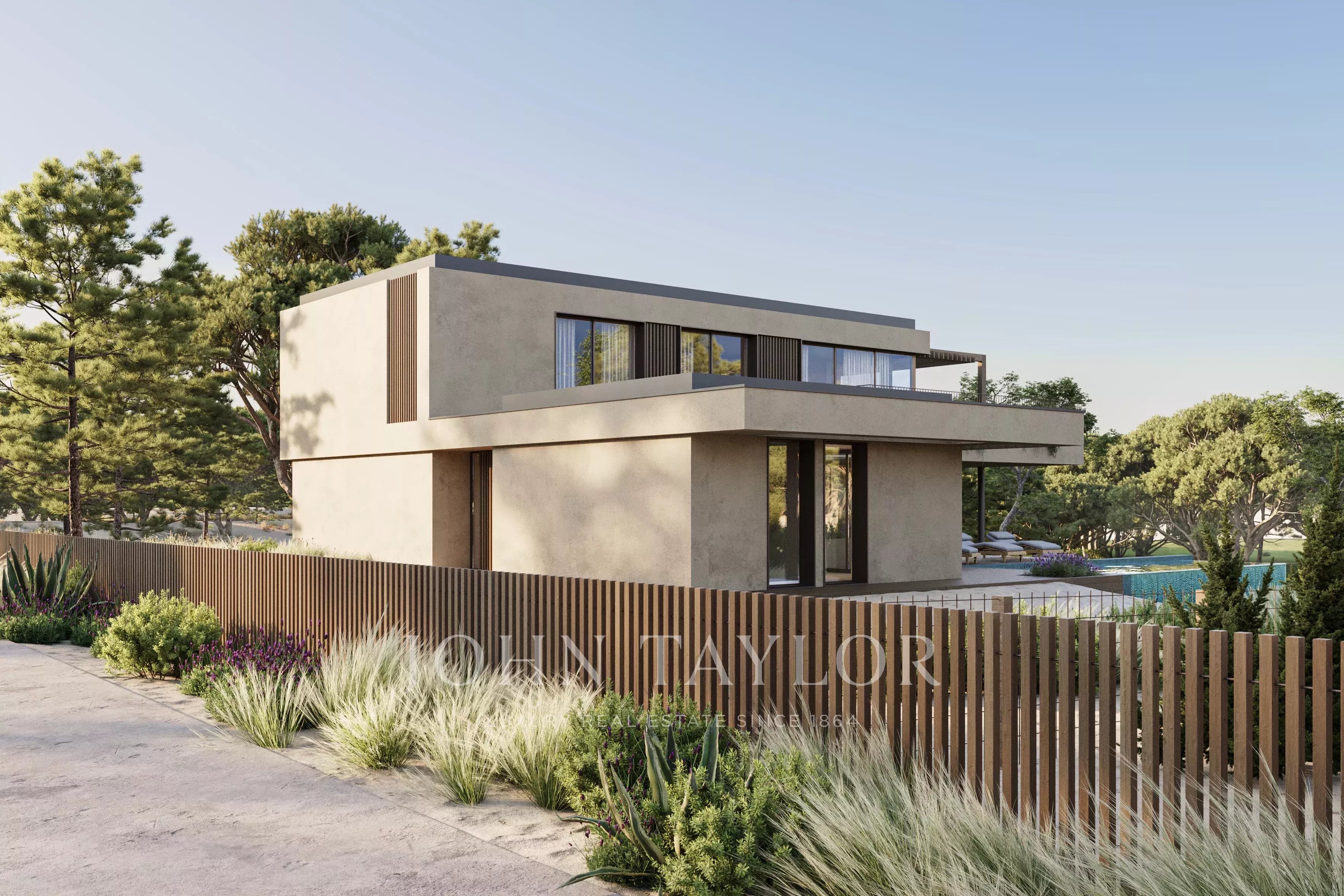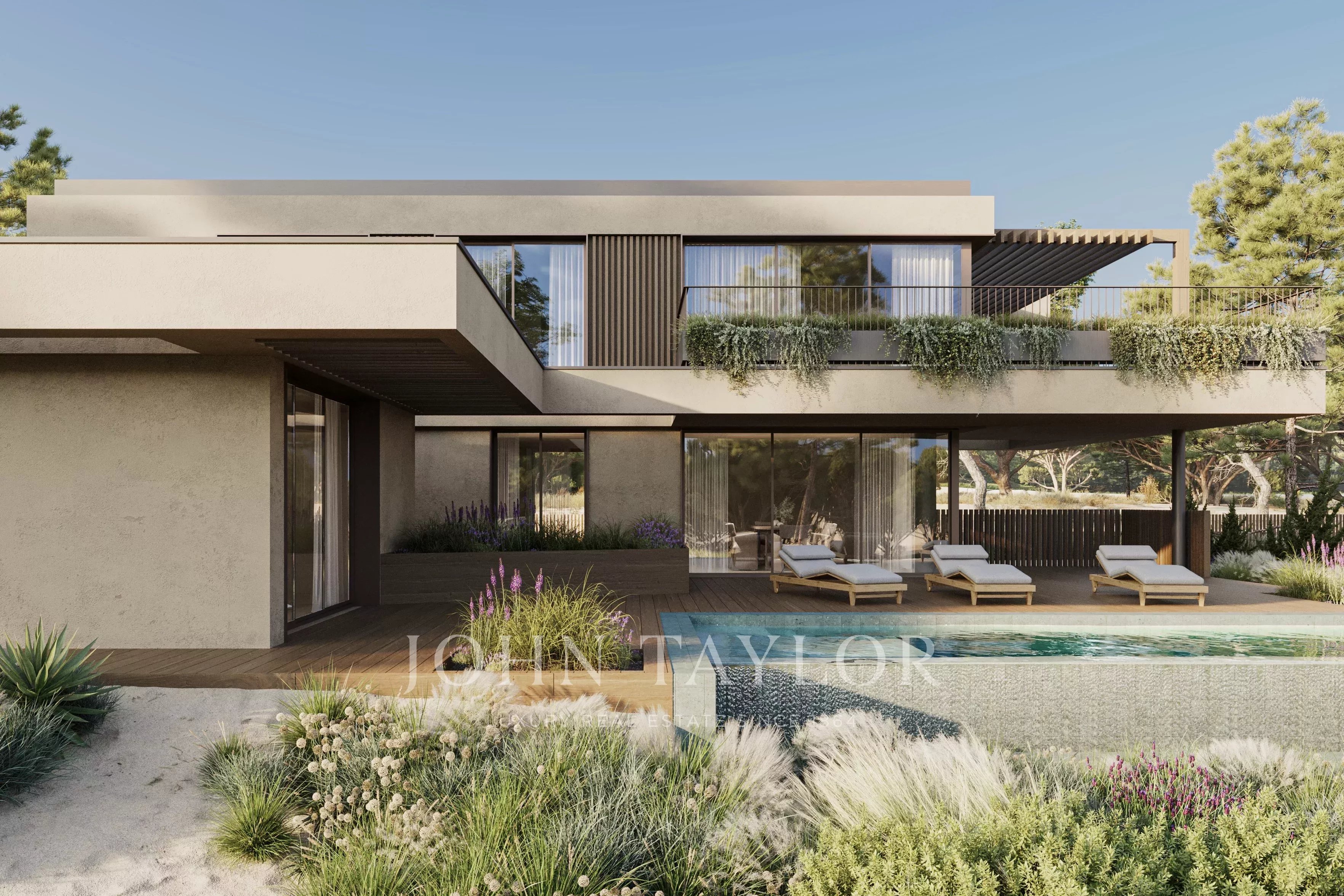 Les espaces extérieurs sont conçus comme une extension naturelle des espaces de vie intérieurs, avec un environnement paysager, des terrasses et une piscine privée surplombant le terrain de golf.