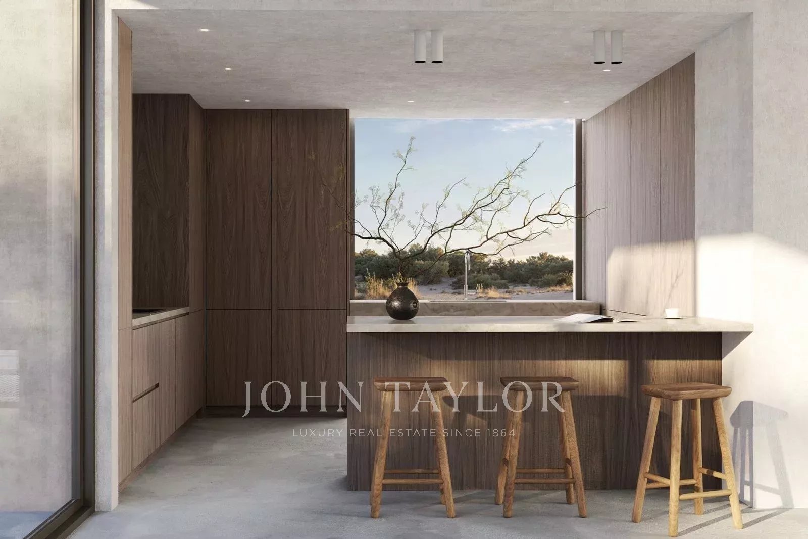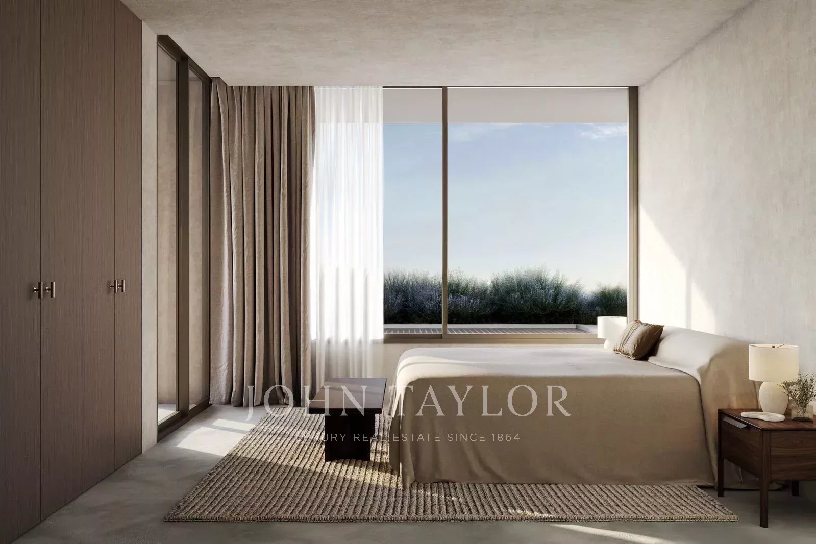 Les finitions et les matériaux reflètent l'intégration du projet dans son environnement : murs intérieurs en plâtre beige de type Marmorino, fenêtres à double vitrage avec des cadres en aluminium gris, pergolas et volets en bois de Cambala pour l'ombrage naturel et la chaleur. Les éléments en aluminium de couleur bronze et les grandes baies vitrées renforcent encore le caractère raffiné et durable de la villa.
