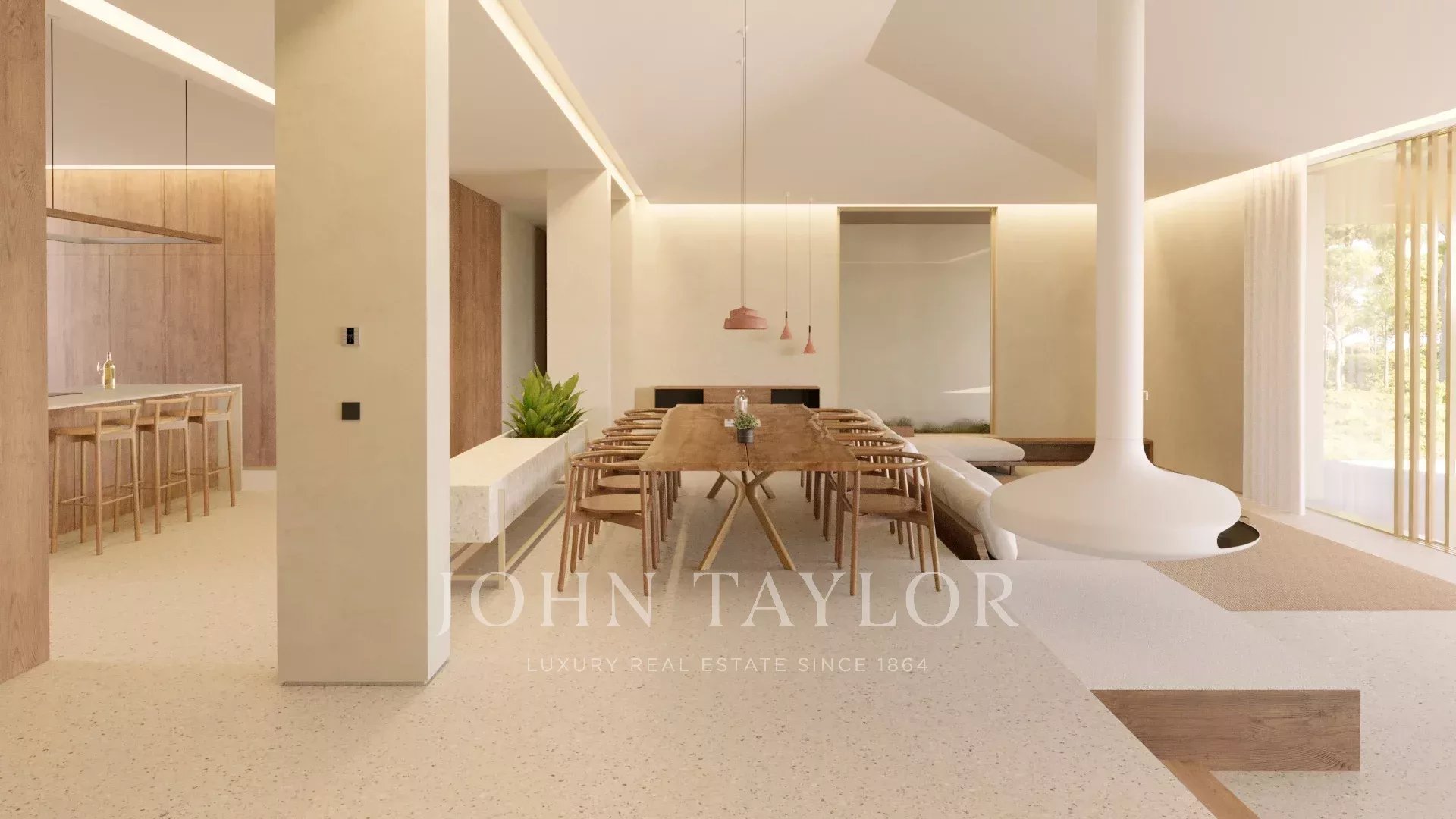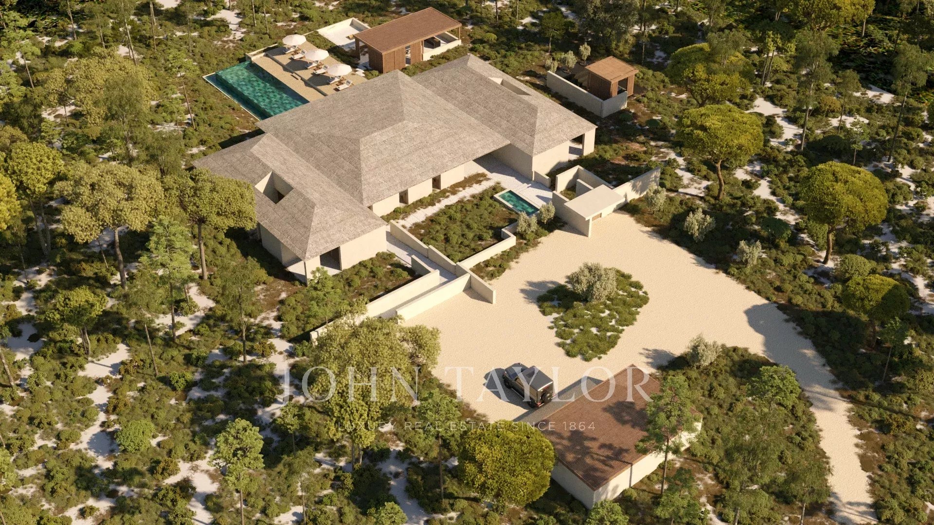 La propriété se trouve sur un terrain de 16 500 m² et dispose d'une surface construite de 665 m². Elle comprend quatre grandes suites avec terrasse privée et une petite suite. La cuisine ouverte, la salle à manger et l'espace de vie offrent une vue sur les oliveraies et les chênes-lièges. Les aménagements extérieurs comprennent deux piscines, une cuisine extérieure, un foyer, des terrasses spacieuses et un parking couvert pour deux voitures.