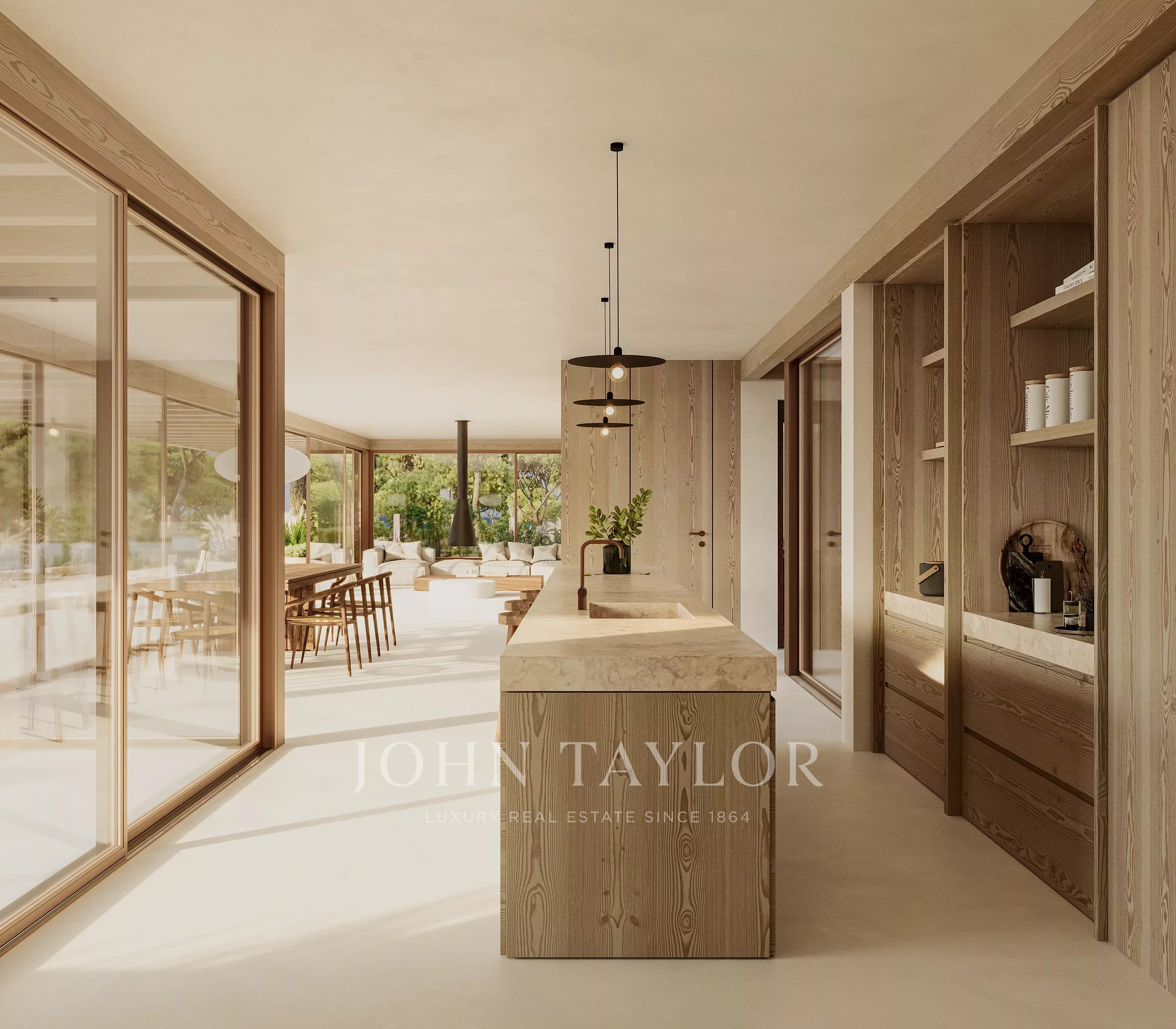 Offrant environ 587 m² d'espace intérieur, la villa est répartie sur deux étages au-dessus du sol et un niveau souterrain. Le rez-de-chaussée comprend un spacieux salon et une salle à manger d'environ 100 m², intégrés à la cuisine et s'ouvrant directement sur les terrasses et la piscine. L'étage supérieur comprend quatre chambres généreuses avec salle de bains, dont la suite principale, toutes avec accès à un grand balcon de 63 m².