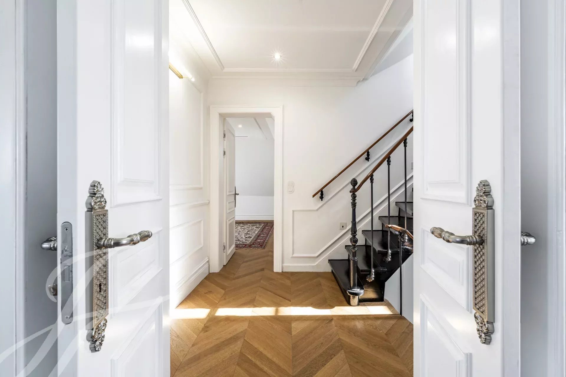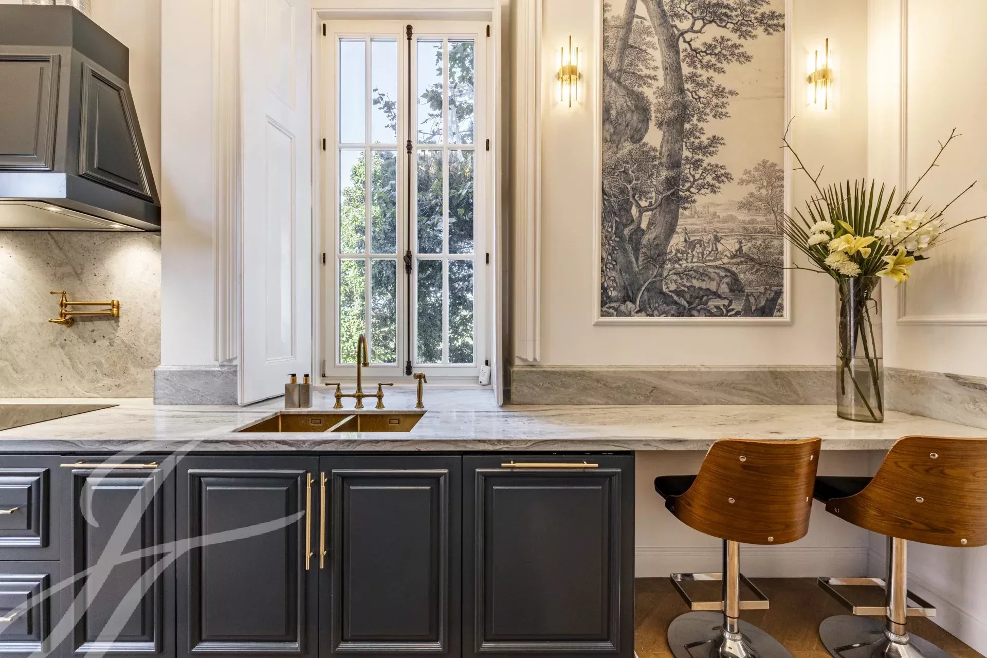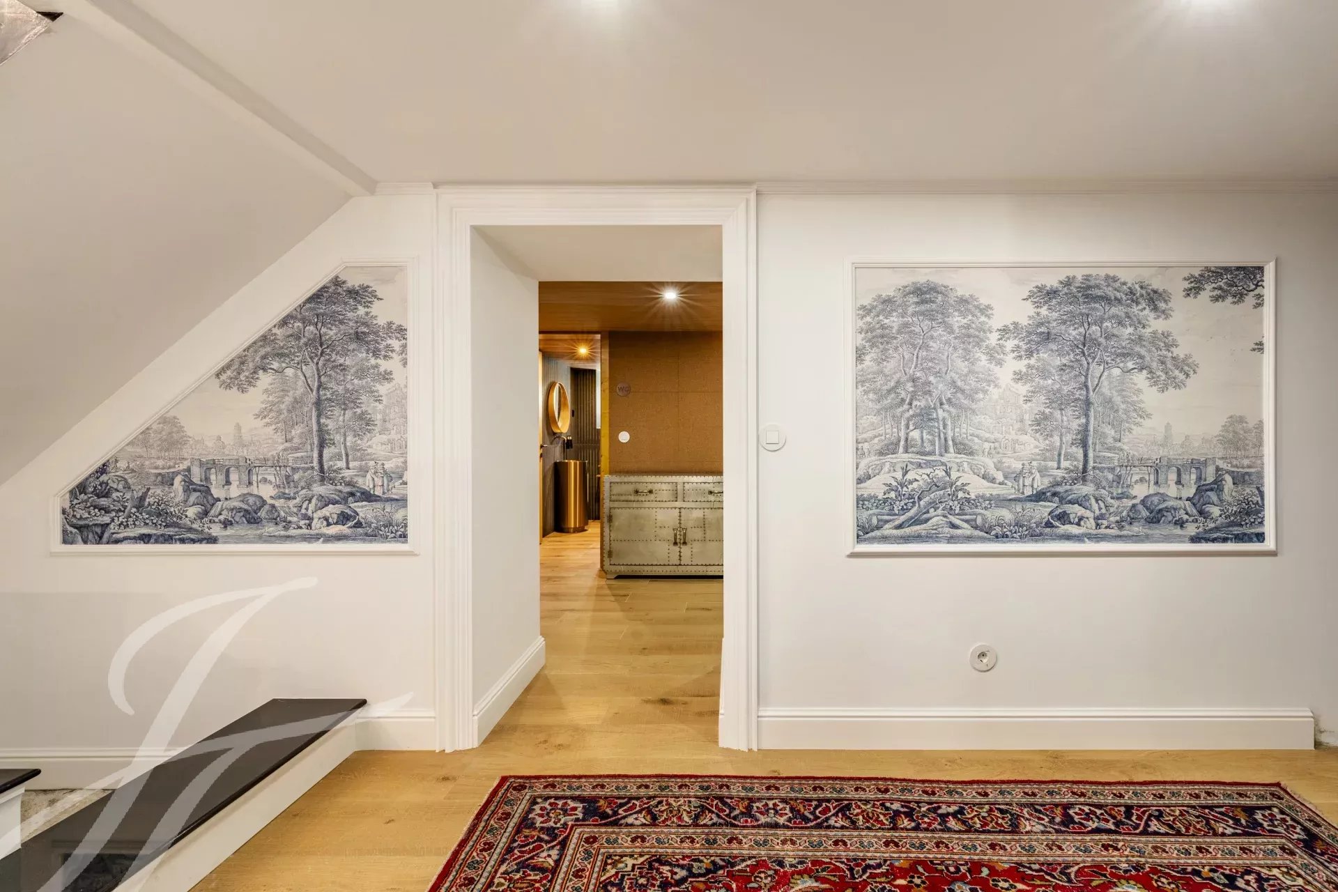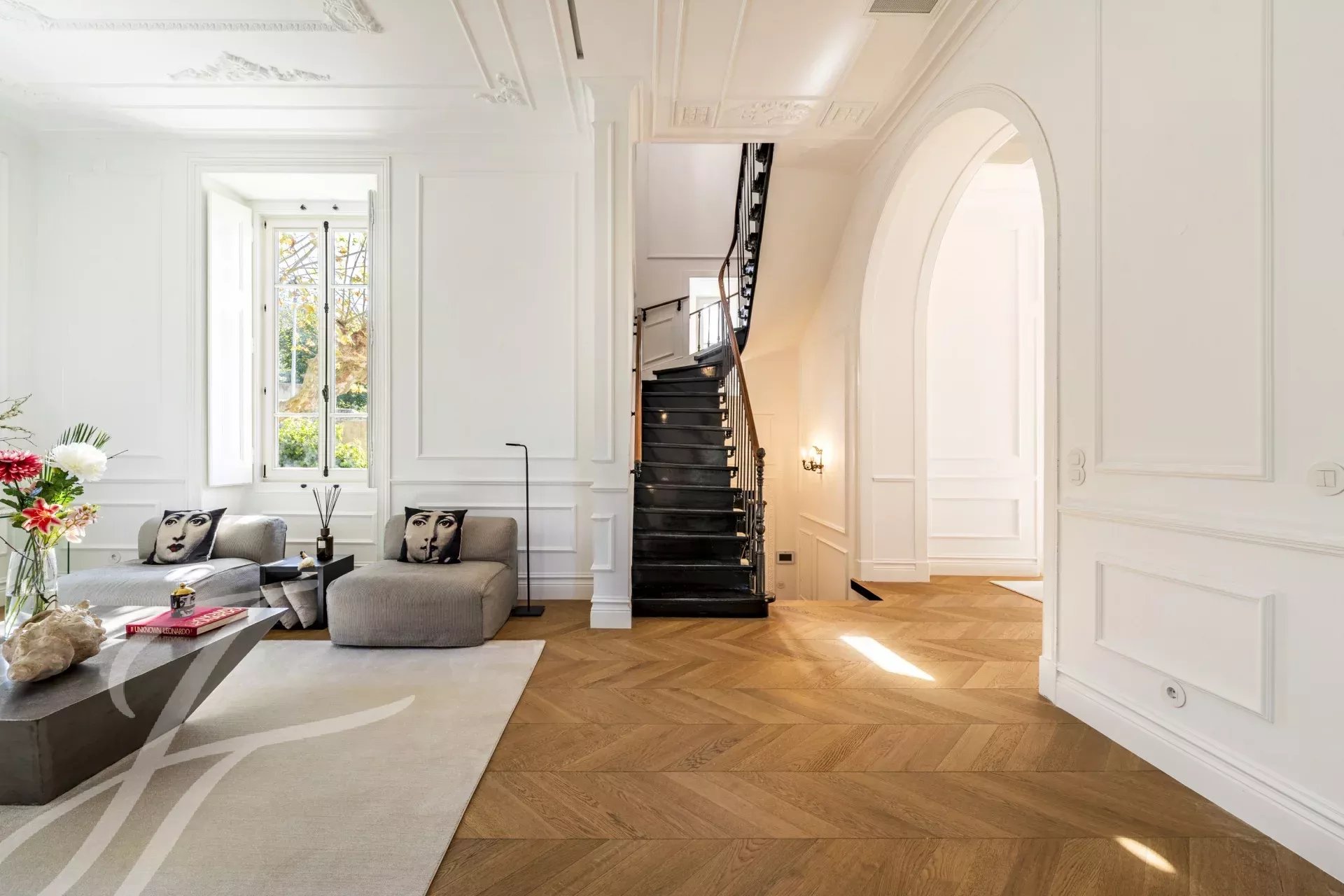 Distribué sur quatre niveaux, le rez-de-chaussée comprend un vaste salon qui s’ouvre directement sur un jardin paysager, créant une parfaite continuité entre les espaces intérieurs et extérieurs. La salle à manger, de style formel, et la cuisine entièrement équipée sont idéales pour des moments conviviaux, qu’ils soient décontractés ou plus sophistiqués.