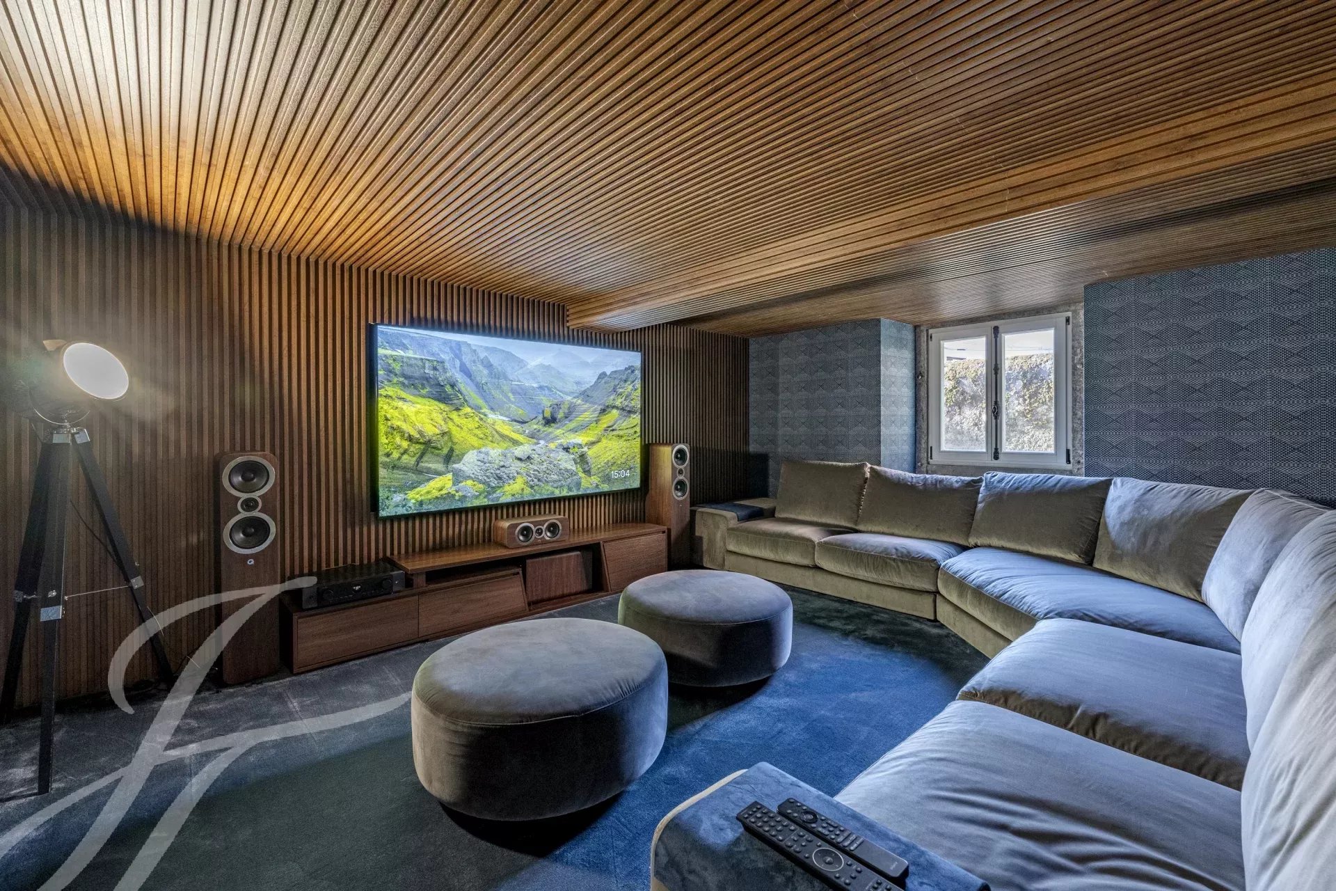 Le sous-sol est dédié aux loisirs, avec une salle de télévision insonorisée, une cave à vin, un sauna, une buanderie et une chambre supplémentaire.