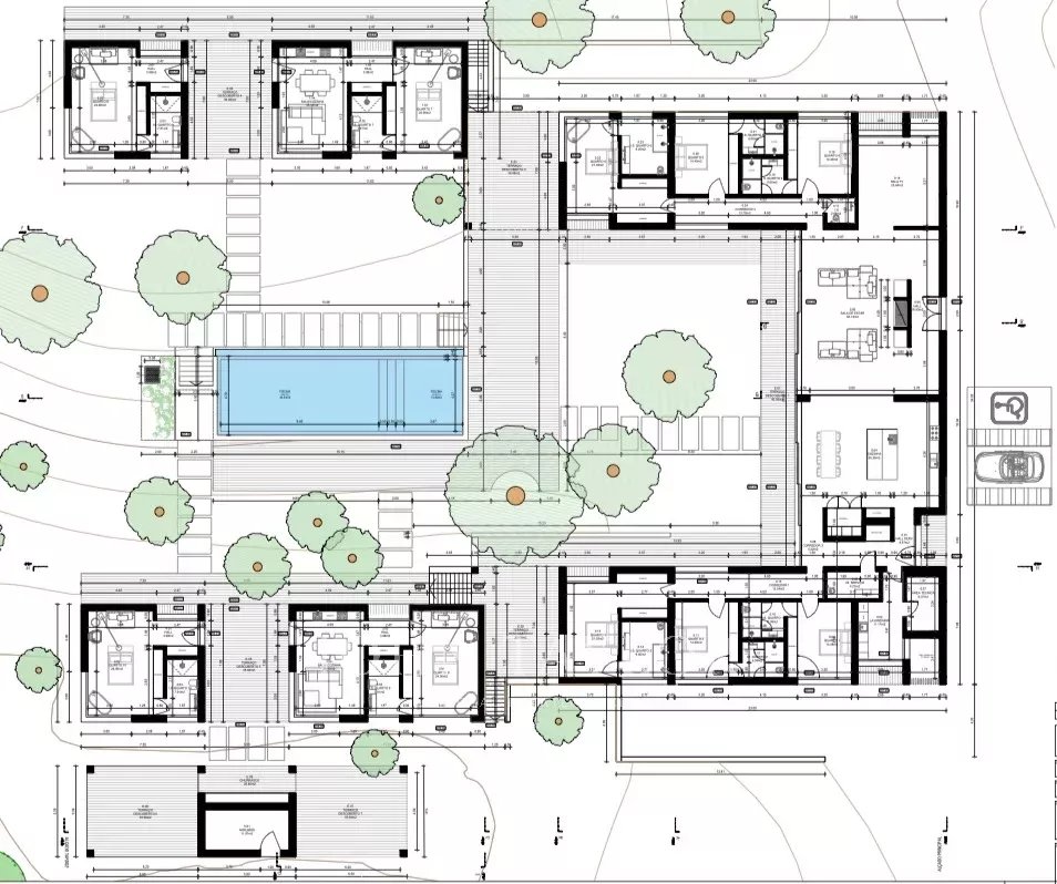 Le projet présente une architecture moderne et discrète, pensée pour s’intégrer harmonieusement dans le paysage naturel. La maison principale offrira 500 m², comprenant six suites, de vastes espaces de vie et de réception avec vue dégagée, une cuisine entièrement équipée et une salle de cinéma privée.