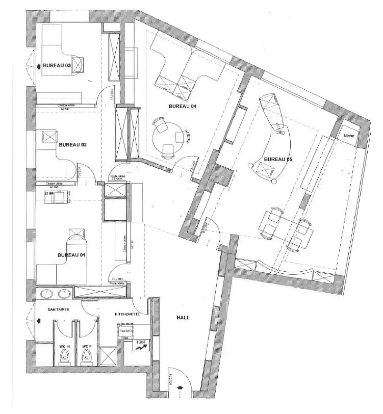 Ces locaux de standing de 147 m², agencés et décorés avec goût sont loués avec le mobilier : bureaux, chaises, tables, armoires, kitchenette.