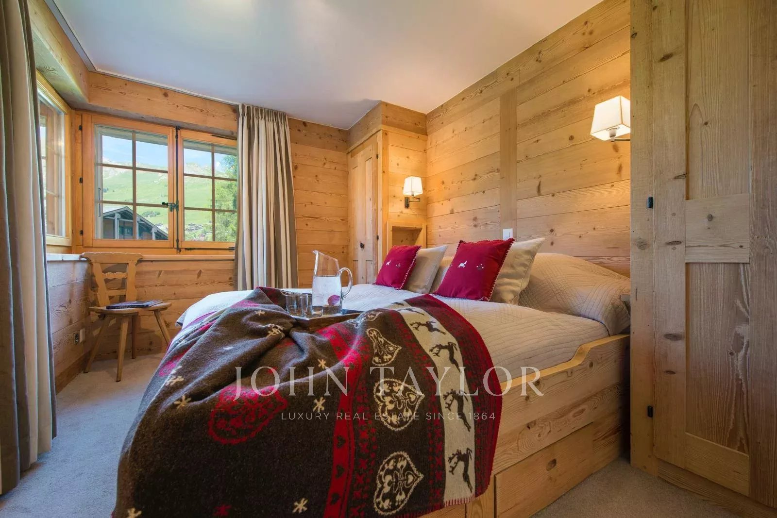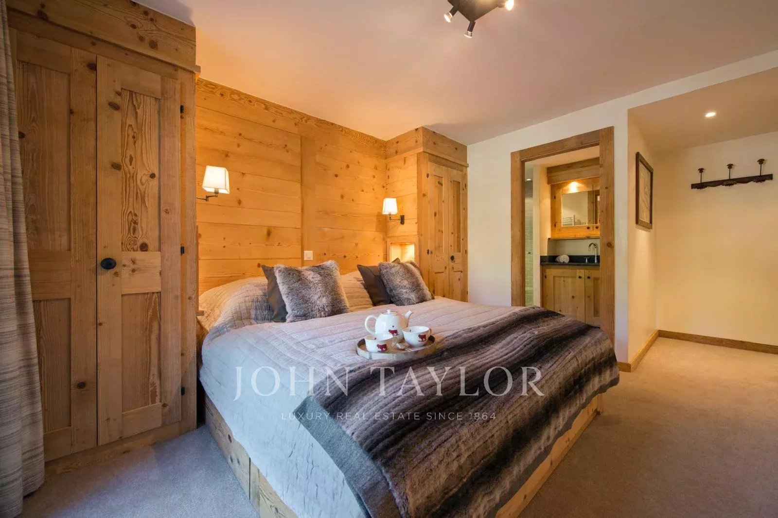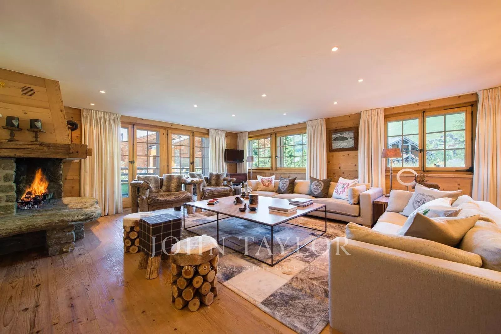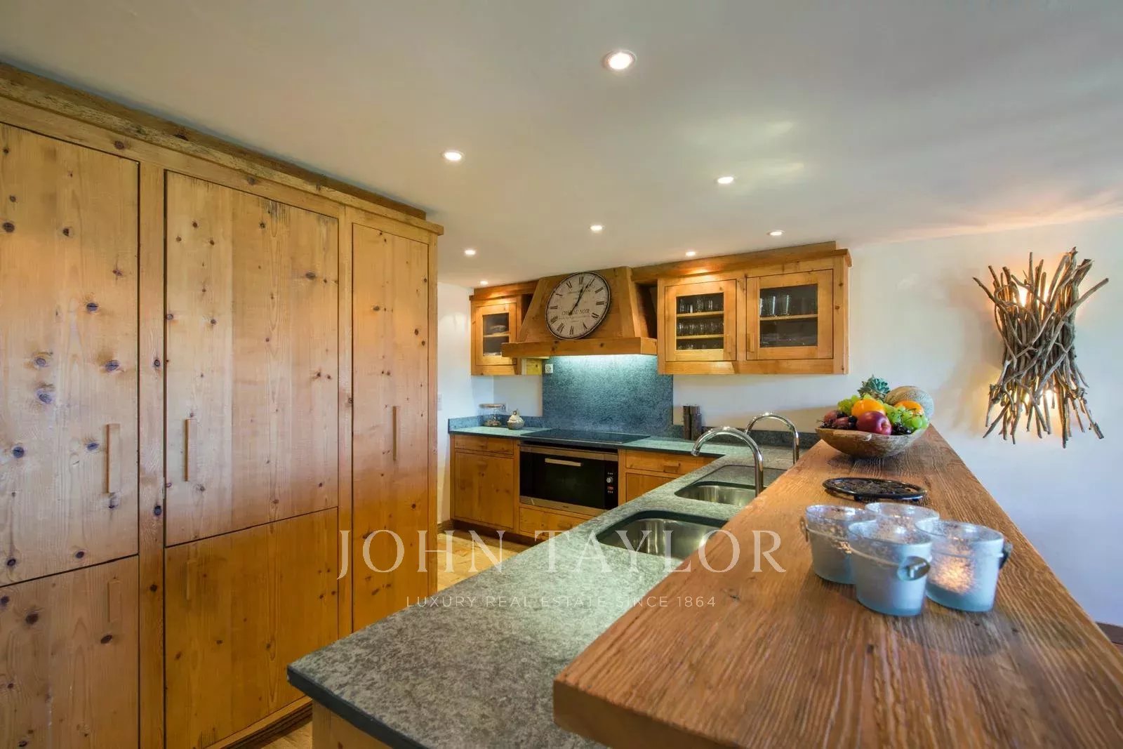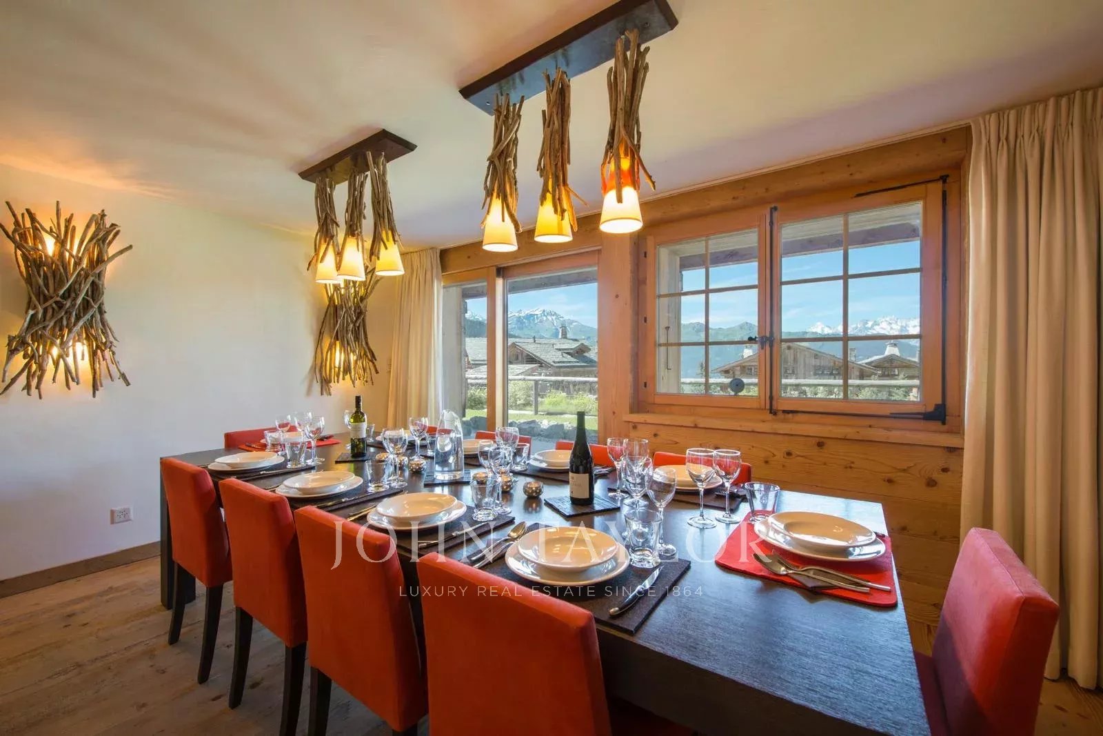 L'appartement dispose d'un grand salon contemporain de style alpin, agrémenté d'une cheminée traditionnelle en pierre. La cuisine s'ouvre sur la salle à manger, celle-ci offrant une vue sur le jardin orienté au sud avec de superbes vues sur les montagnes.