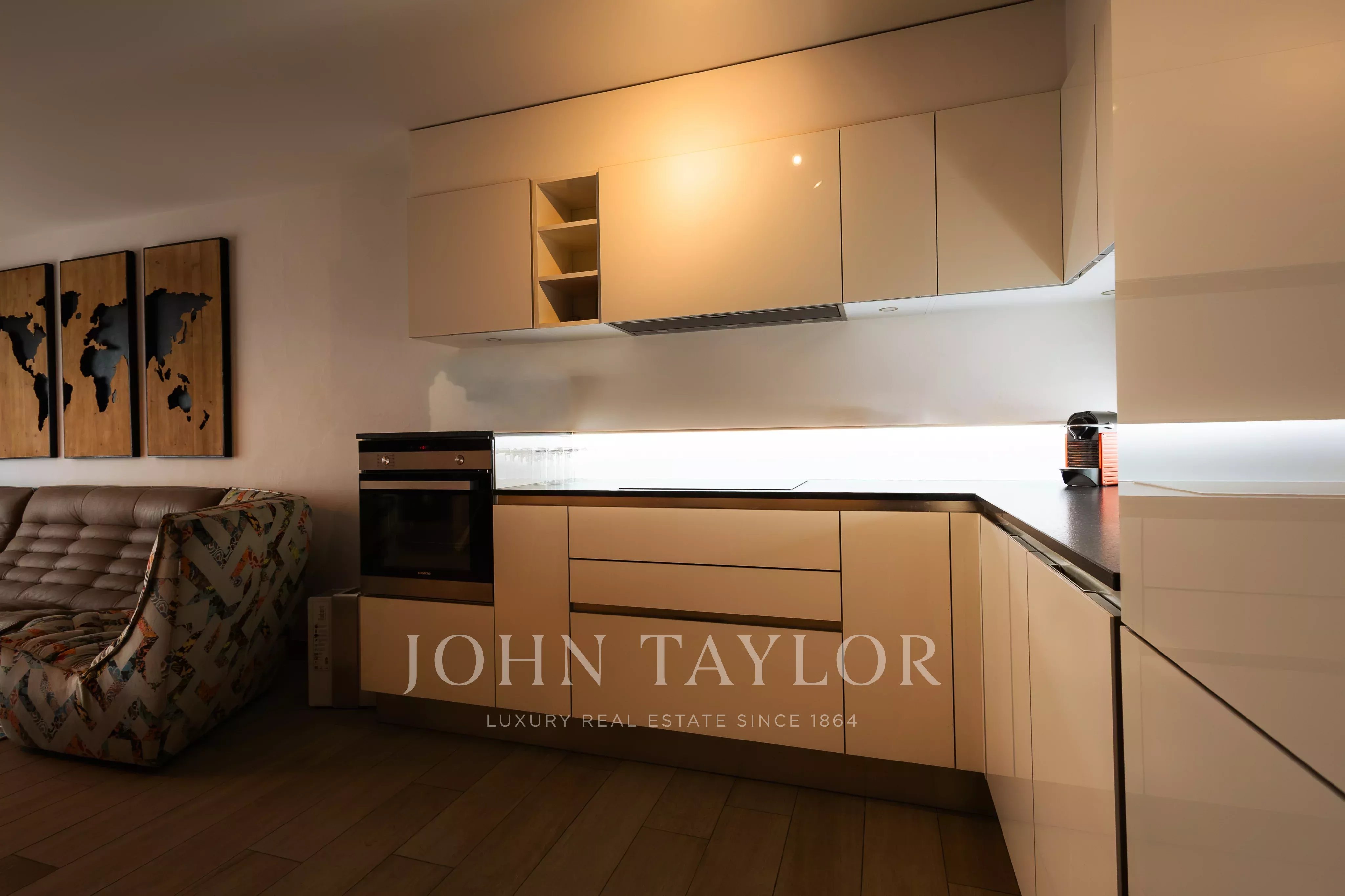 La cuisine, moderne et très bien agencée, offre de nombreux rangements et un espace de travail confortable. Elle s’ouvre sur le séjour, lumineux et convivial, avec accès direct au balcon.