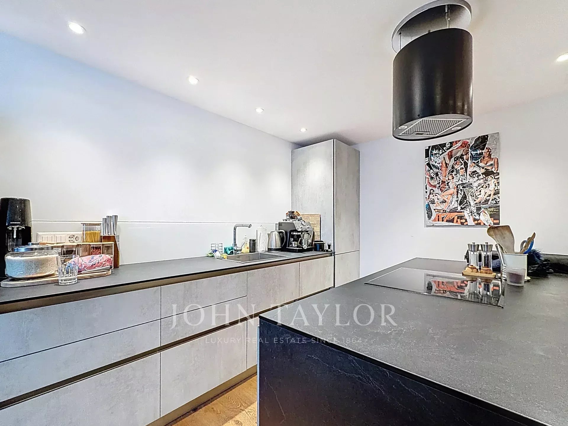 La cuisine ouverte, moderne et fonctionnelle, dispose d’un îlot central et d’équipements intégrés, parfaite autant pour les petits-déjeuners rapides que pour les soirées entre amis.