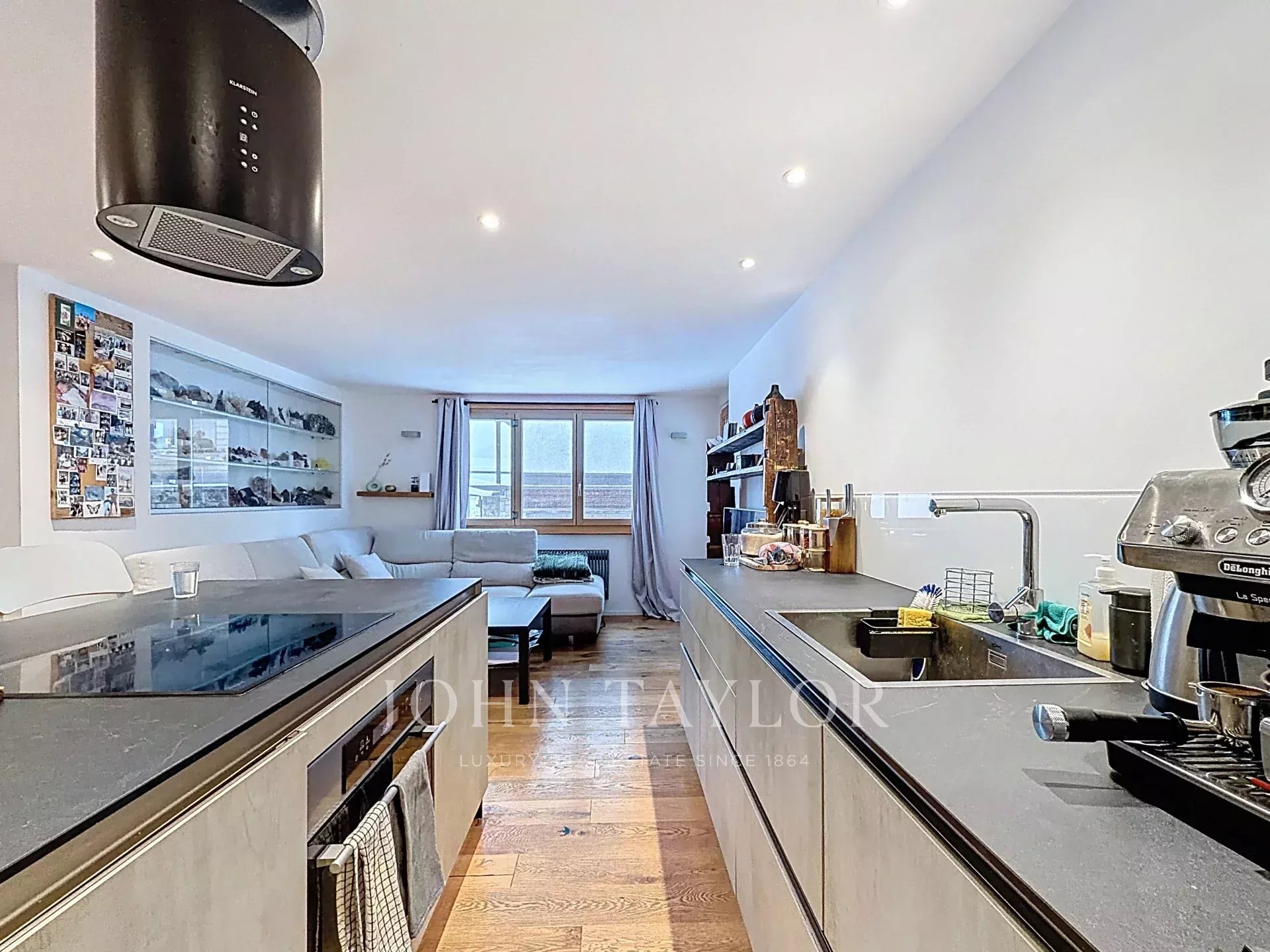 Entièrement repensé, cet appartement offre un intérieur lumineux et chaleureux, porté par un parquet en bois massif et une grande baie vitrée. Le séjour, convivial et accueillant, crée une atmosphère idéale après une journée en montagne.