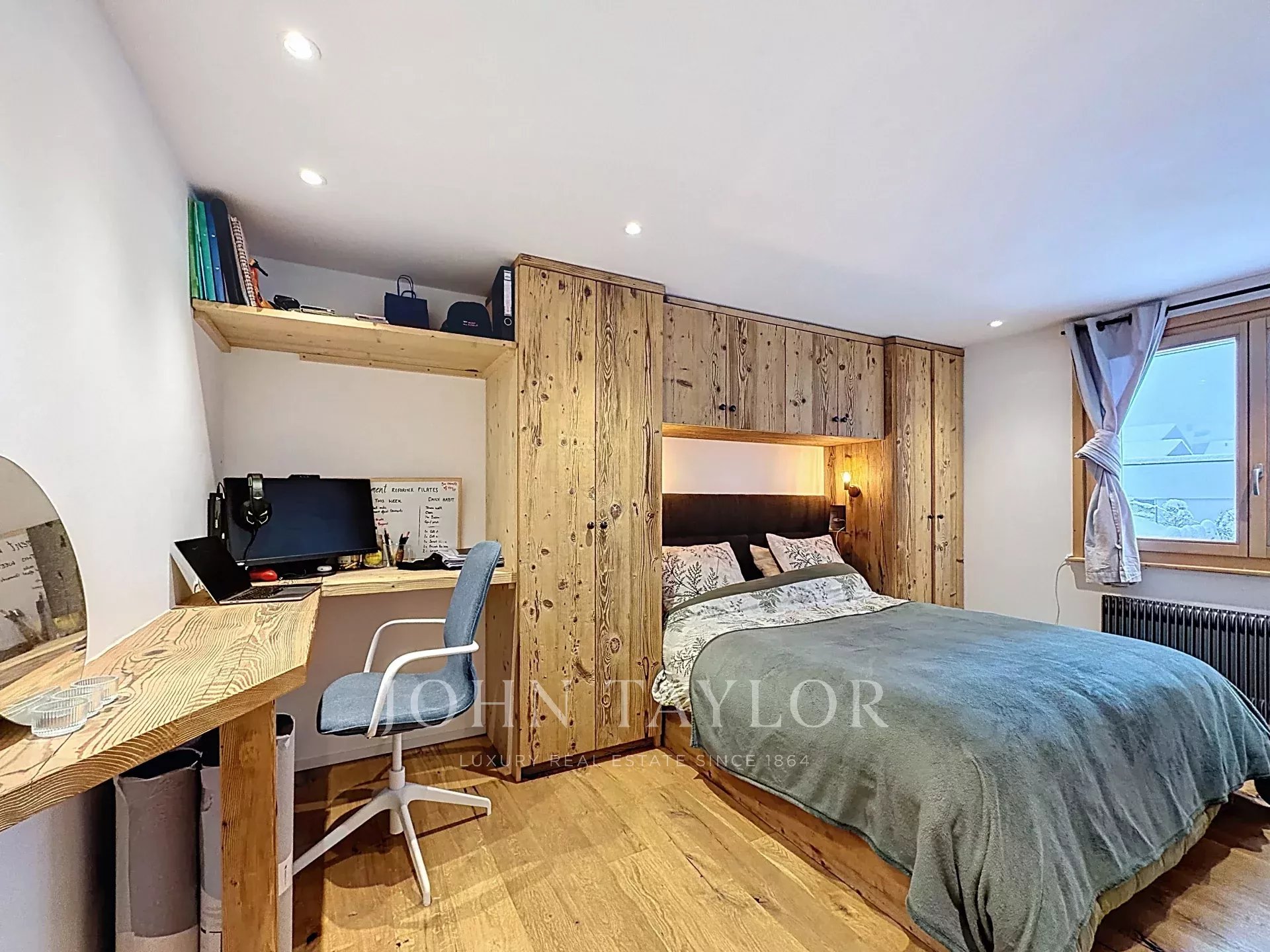 La chambre principale reprend l’esprit chalet avec des boiseries soignées, des rangements intégrés et un coin bureau discret. La salle de bain, propose une douche à l’italienne et des finitions contemporaines.