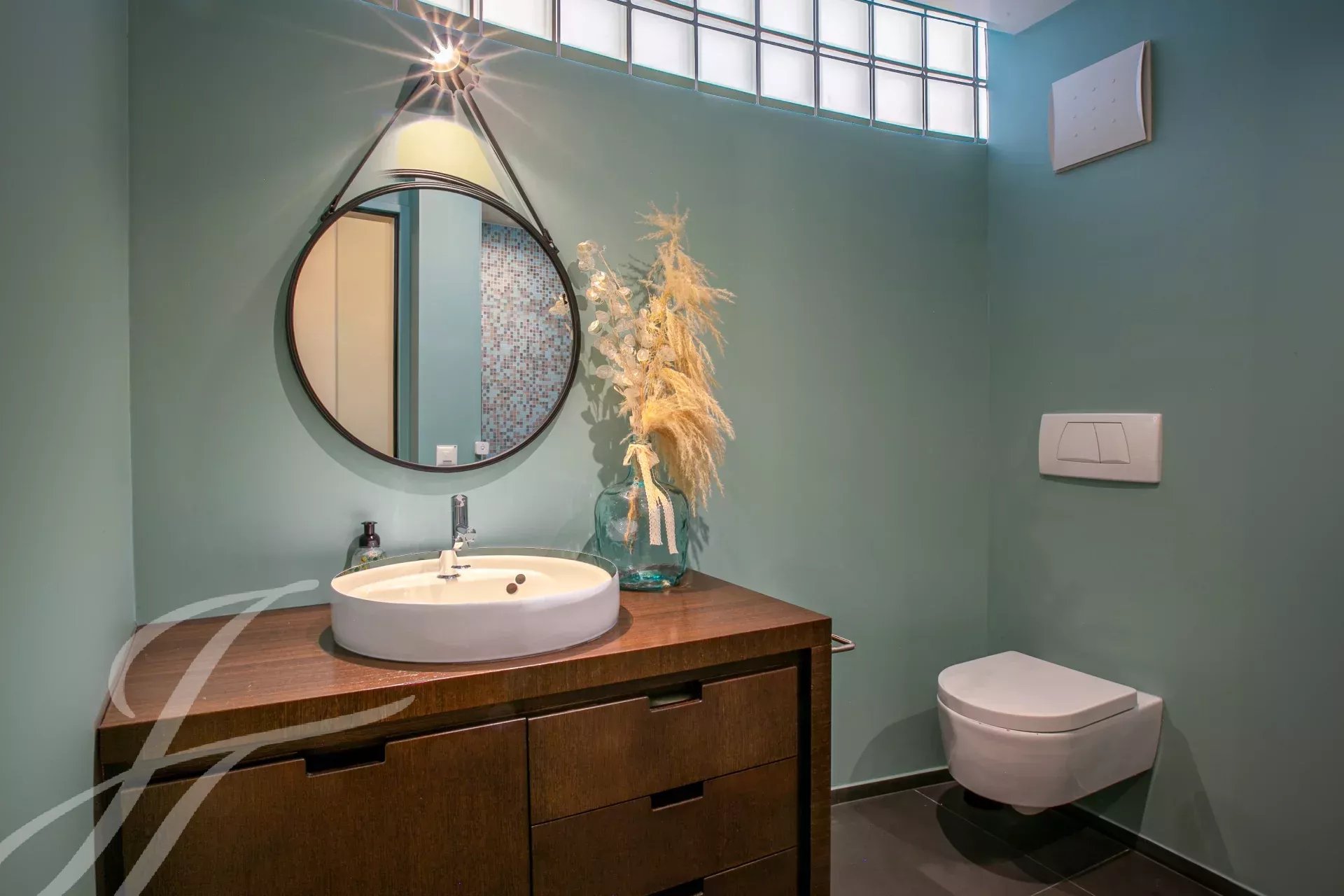 Réparti sur deux niveaux, le rez-de-chaussée accueille un vaste double séjour de 100 m² avec cheminée suspendue, une cuisine entièrement équipée, une buanderie, deux chambres à coucher, une salle d’eau ainsi que des toilettes visiteurs.