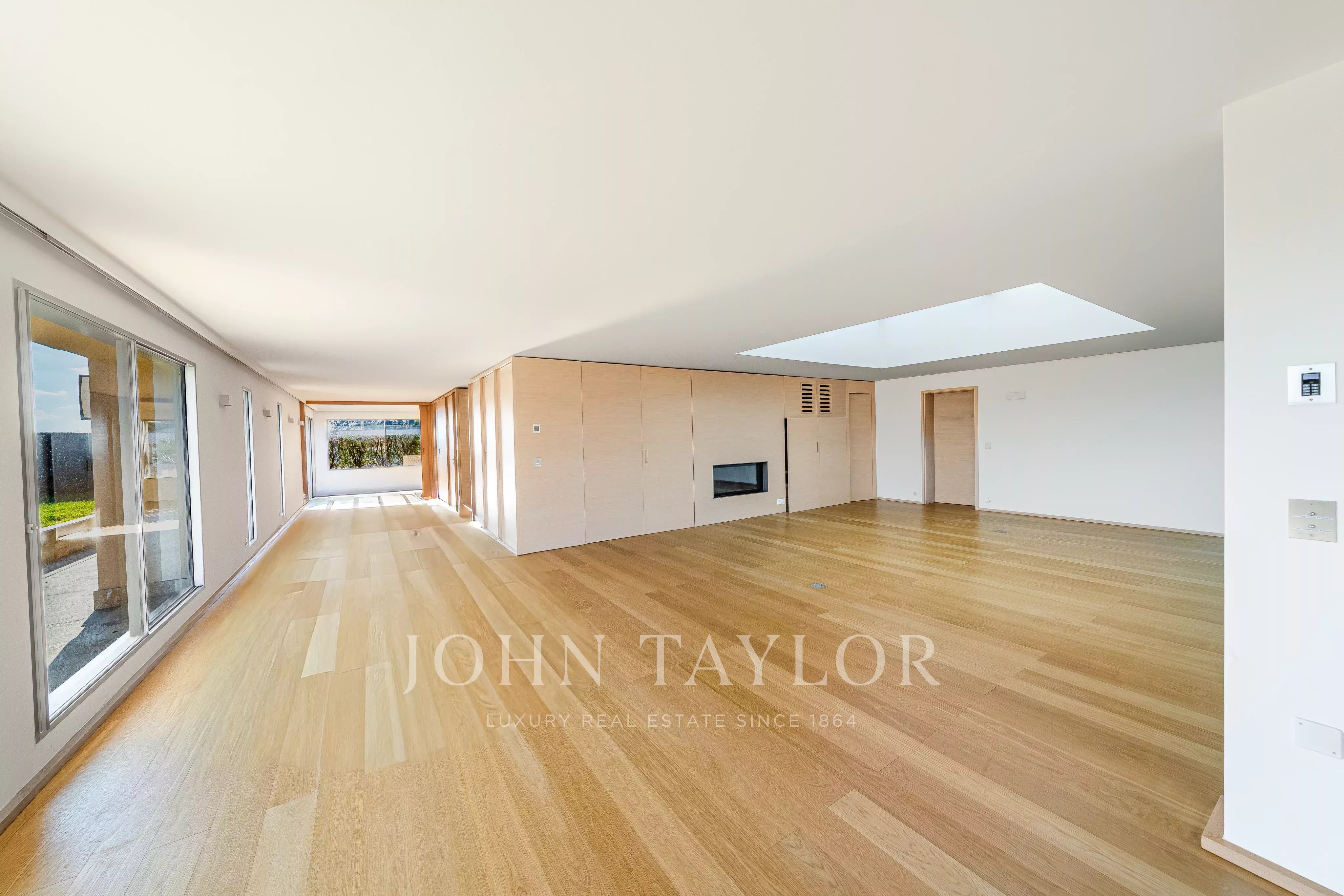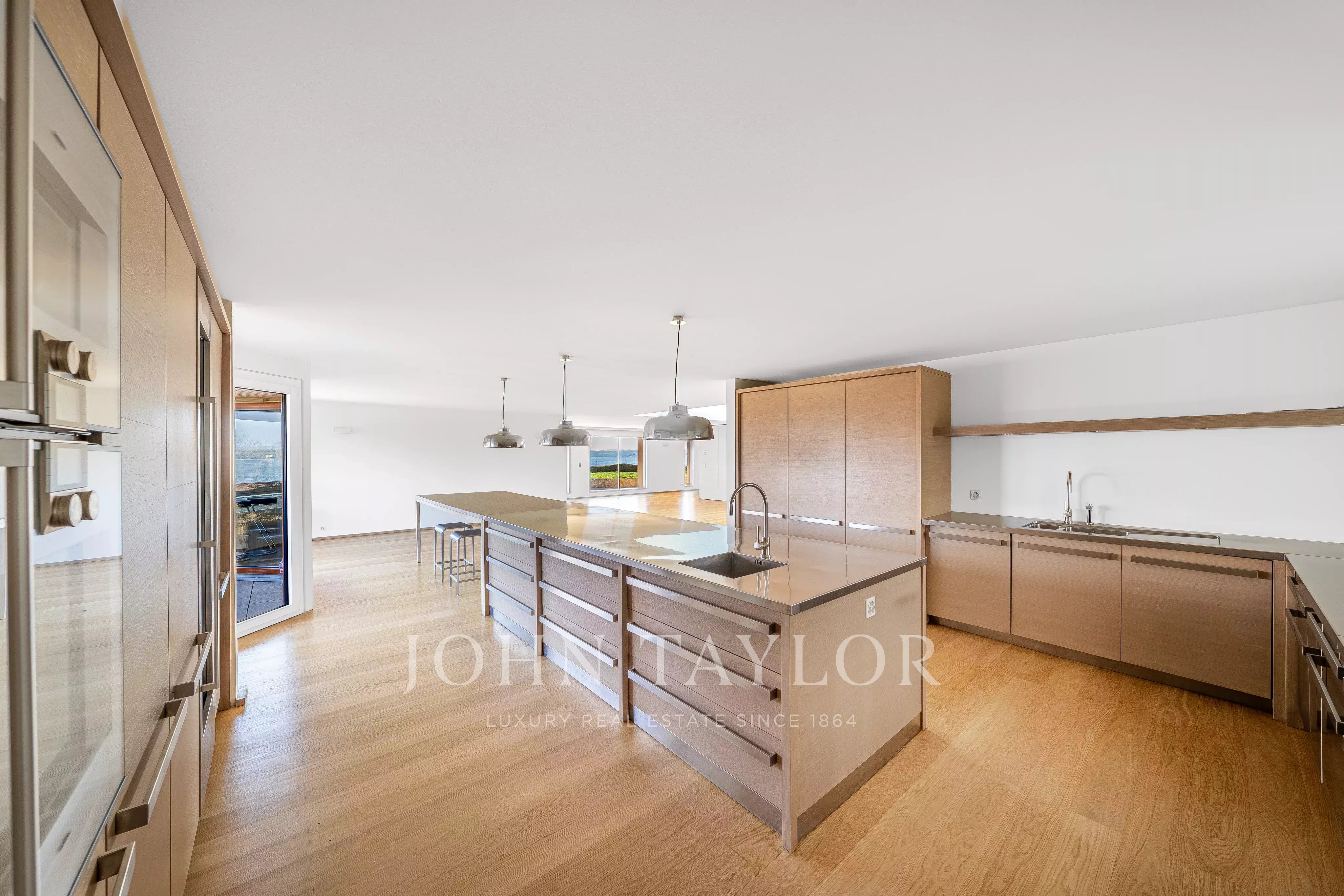 Pièces de réception lumineuses avec cuisine ouverte, accès directs aux terrasses et vue lac omniprésente.