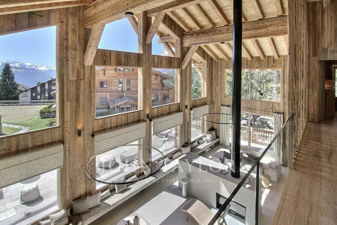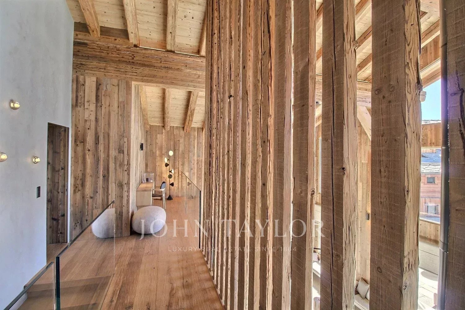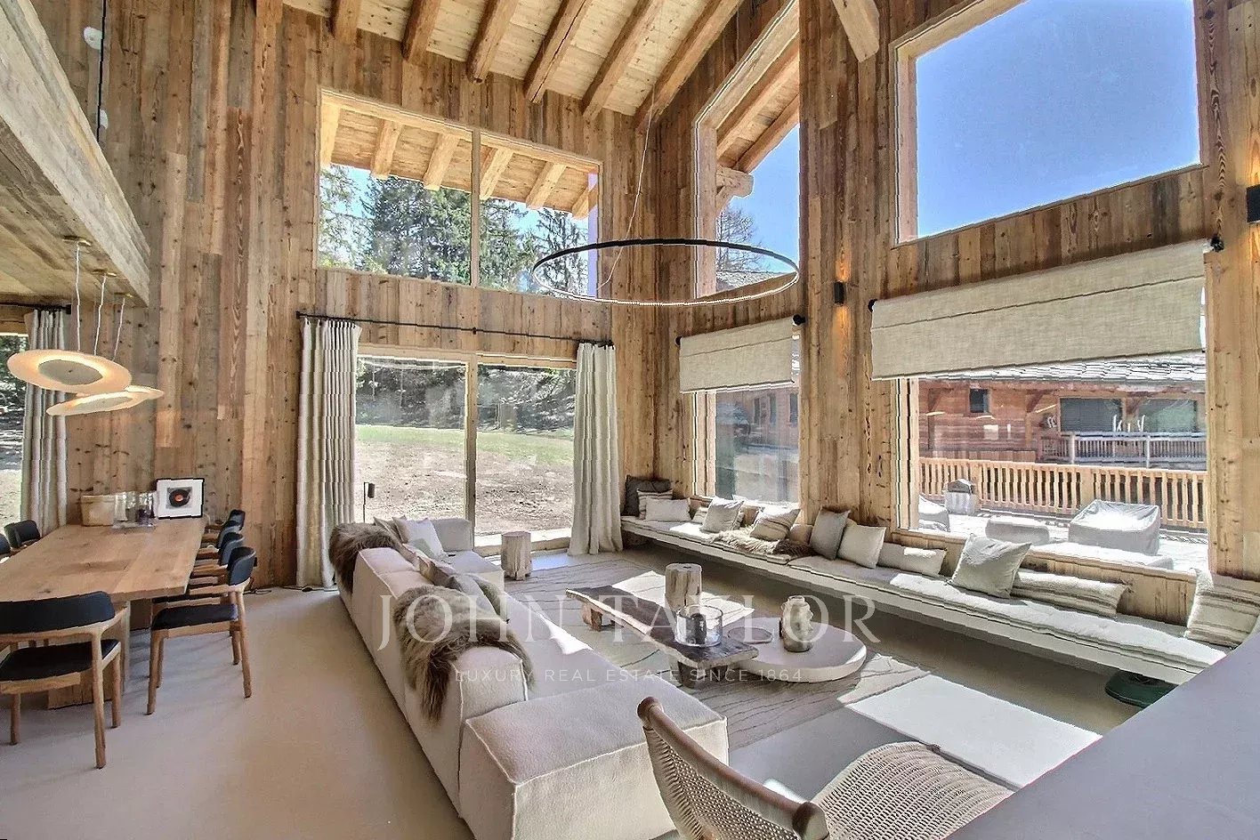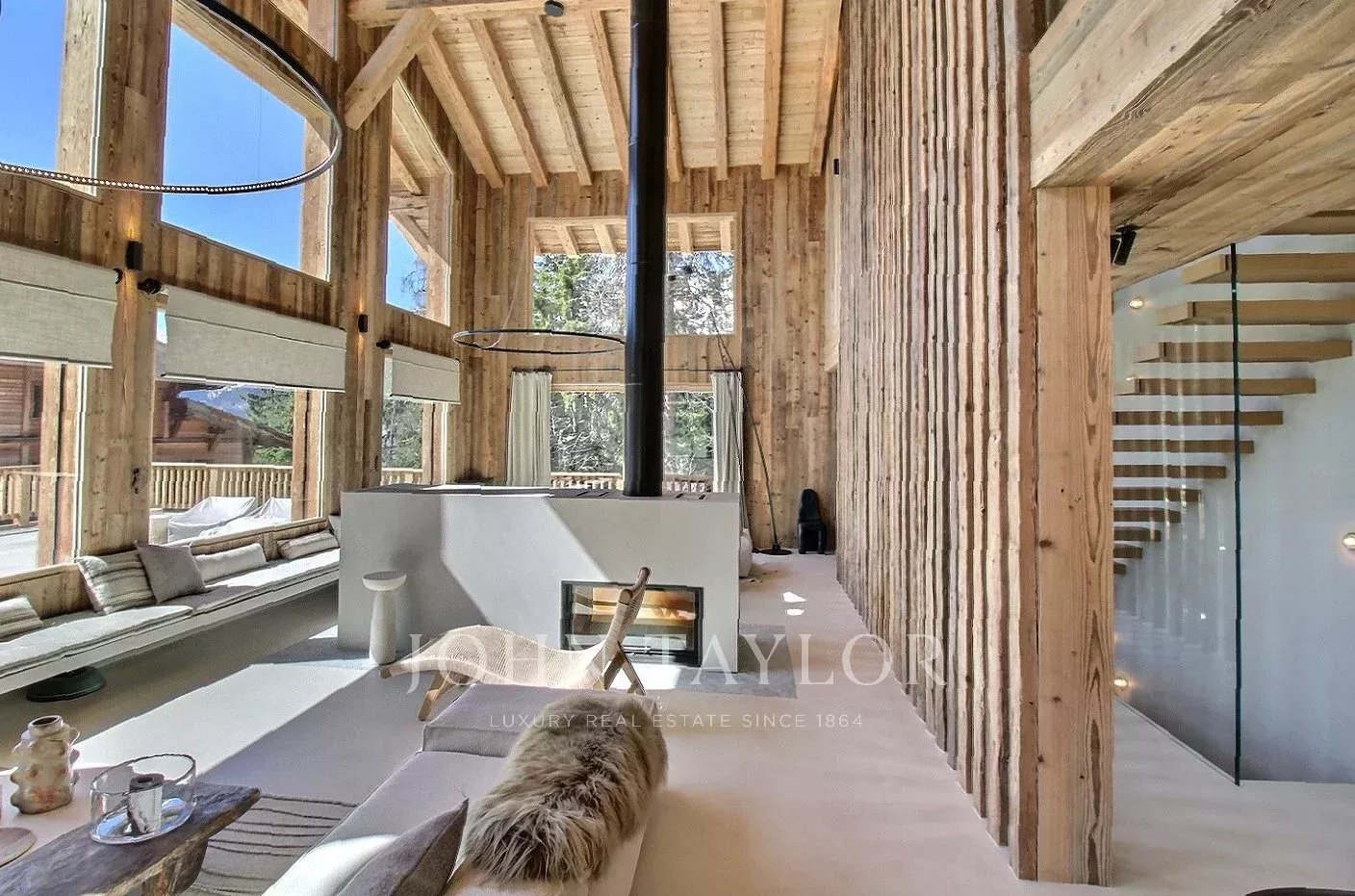 Le chalet offre une atmosphère chaleureuse et actuelle, dans un esprit alpin modernisé : vaste séjour avec belle hauteur sous plafond, larges ouvertures orientées Sud-Ouest, une charpente apparente en bois massif et une cheminée double face intégrée au séjour.