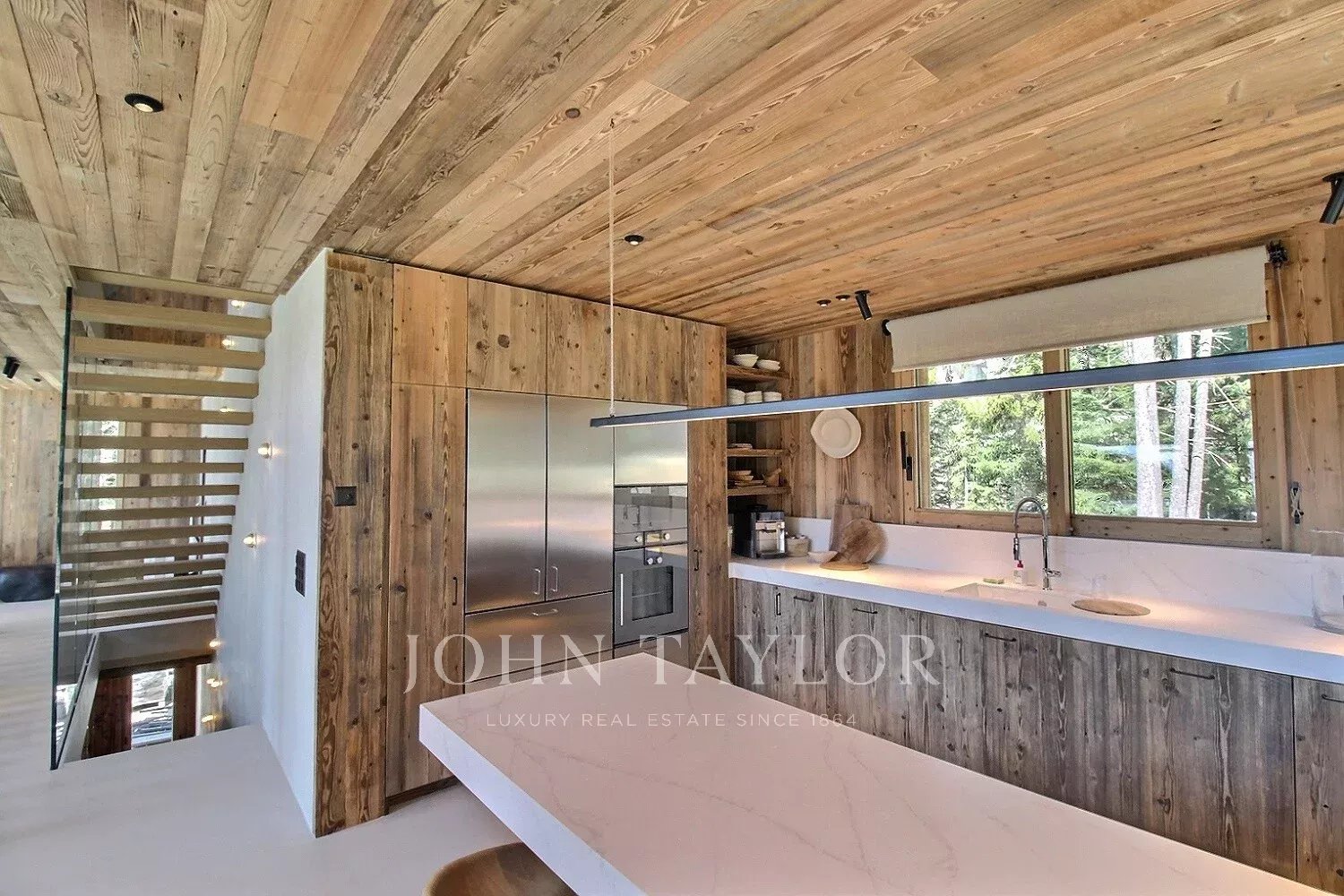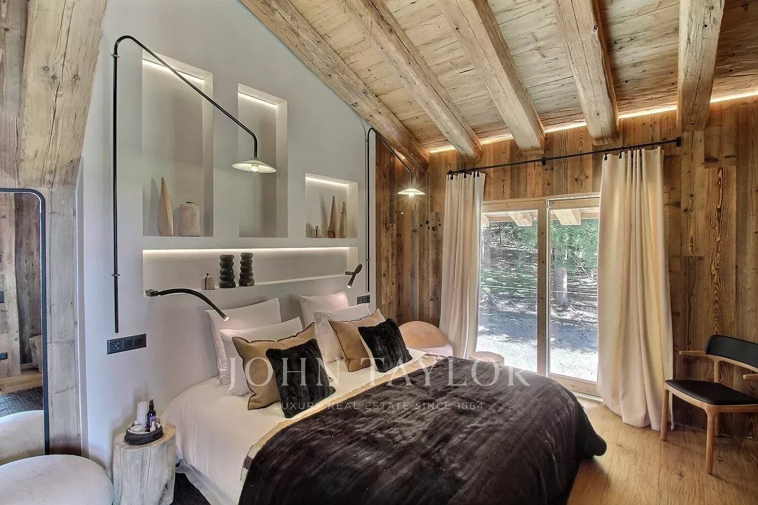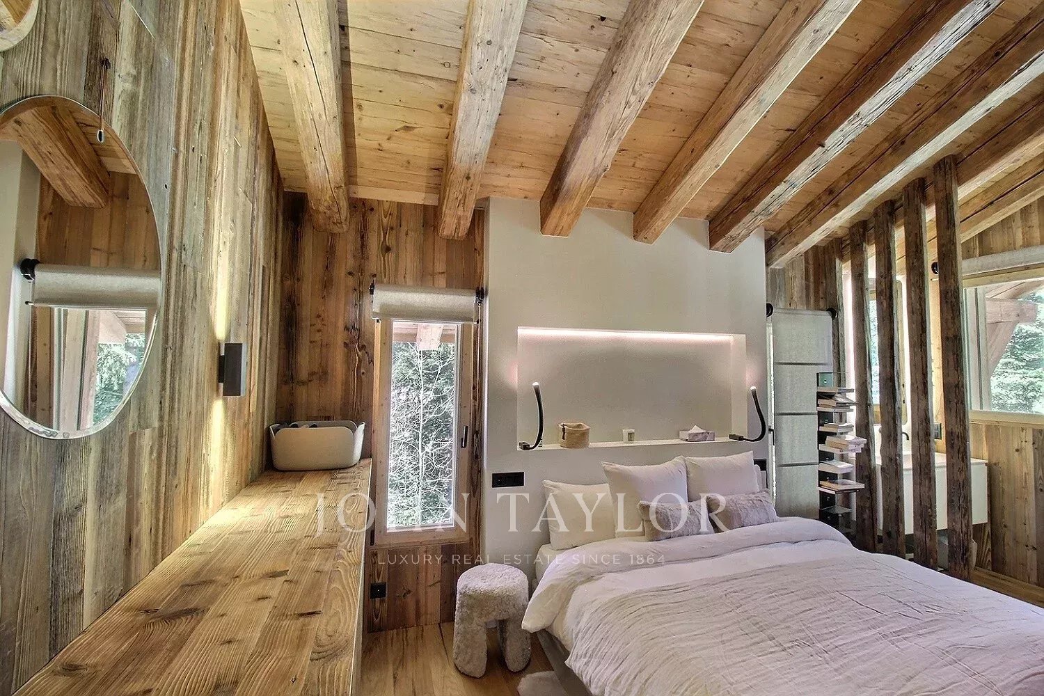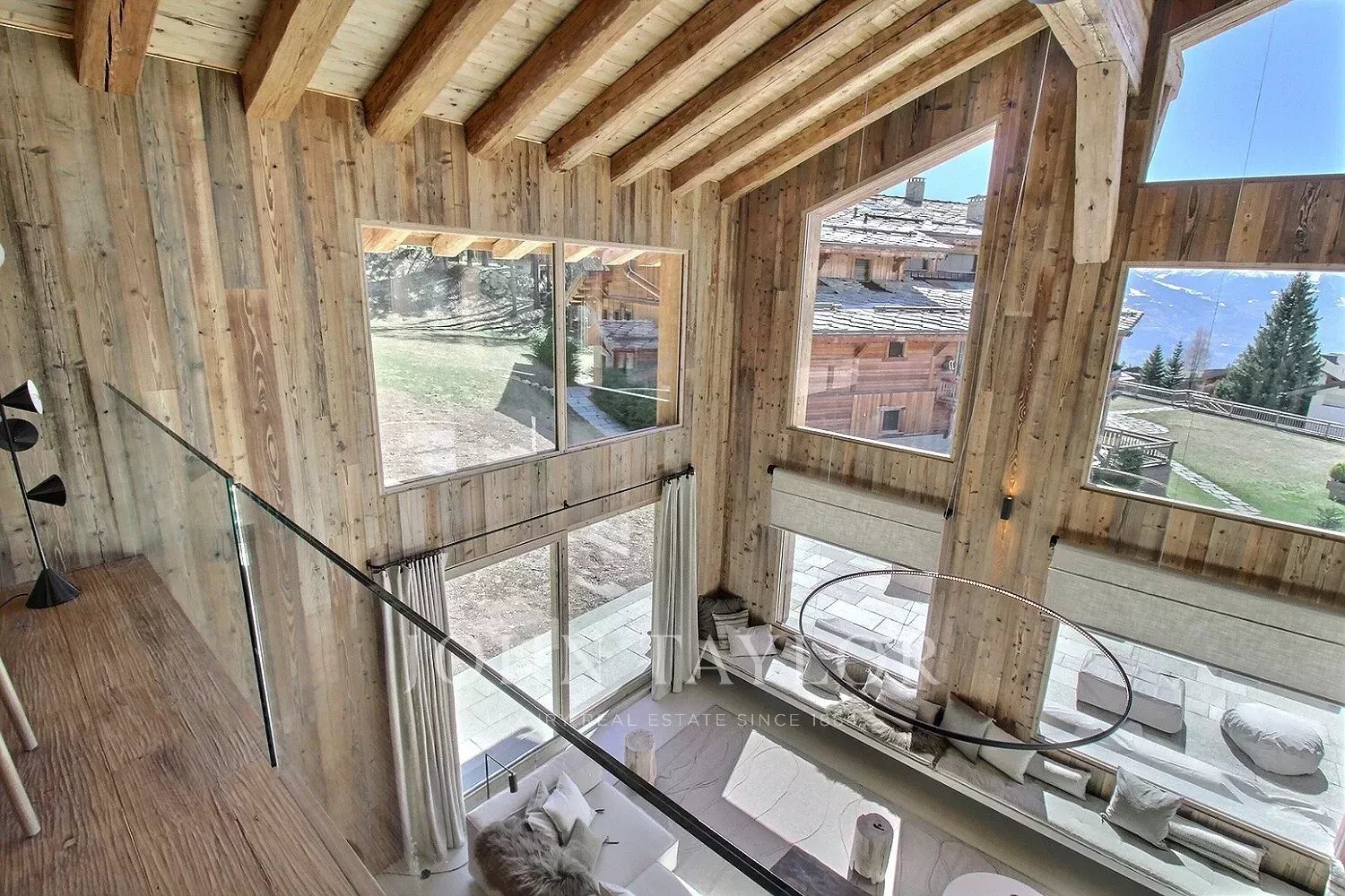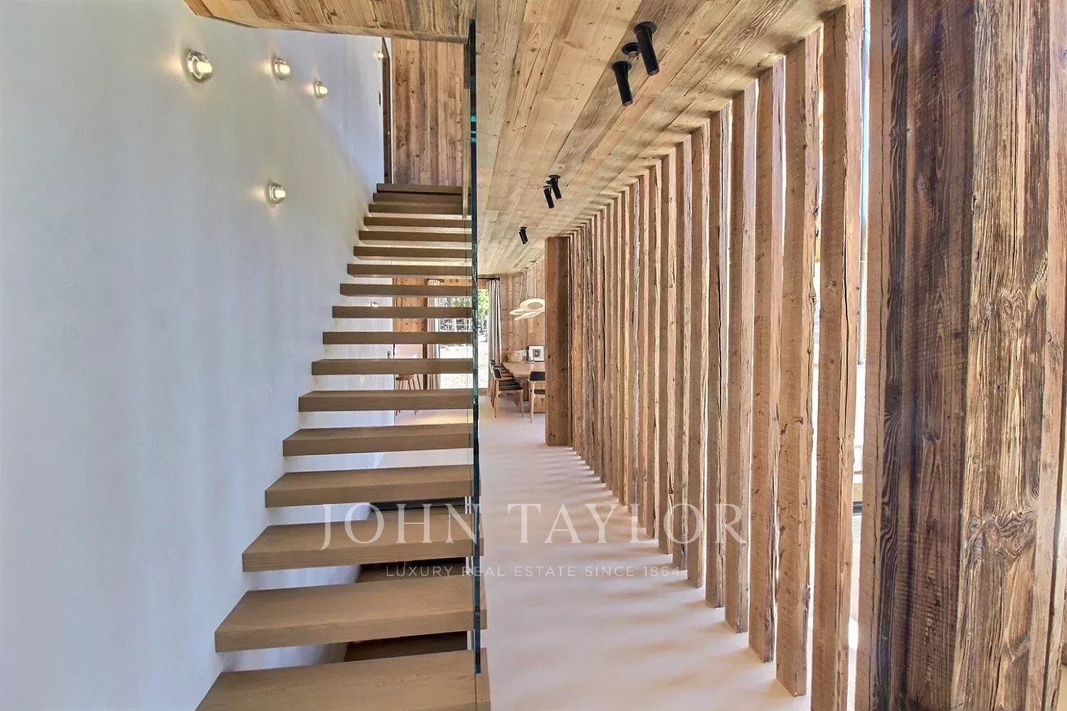 Le chalet offre une atmosphère chaleureuse et actuelle, dans un esprit alpin modernisé : vaste séjour avec belle hauteur sous plafond, larges ouvertures orientées Sud-Ouest, une charpente apparente en bois massif et une cheminée double face intégrée au séjour.