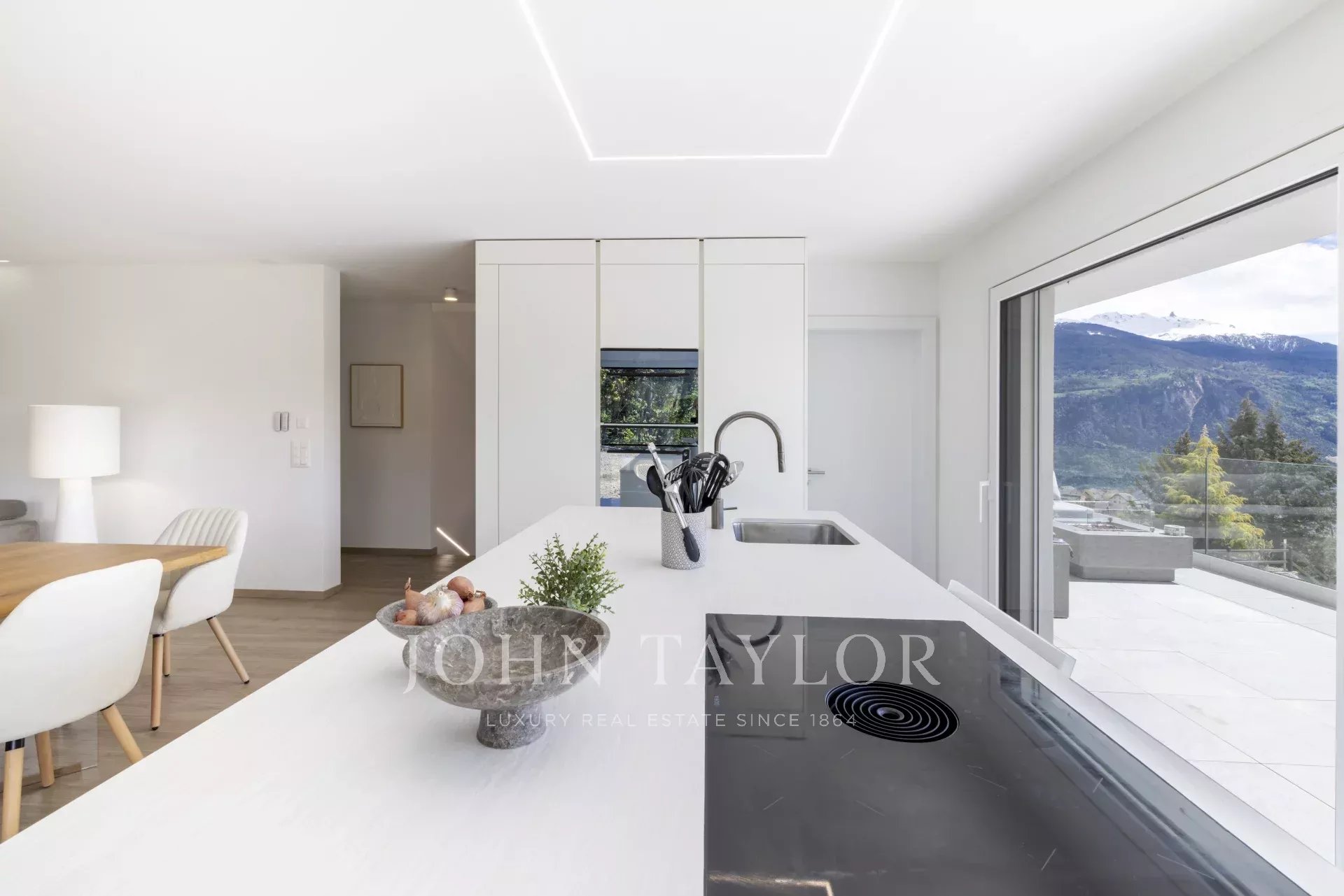 La vue sur les Alpes et la plaine du Rhône est splendide et son orientation sud vous garantira un ensoleillement optimal. L’environnement bucolique vous préservera de toutes nuisances. L’altitude de 930 m, entre plaine et montagne, garantit un accès aisé et rapide à la ville, aux sites de loisir et aux stations très réputées de Crans et Anzère. La proximité des écoles, des transports publics ainsi que des commodités quotidiennes, comblera les souhaits d’une famille.