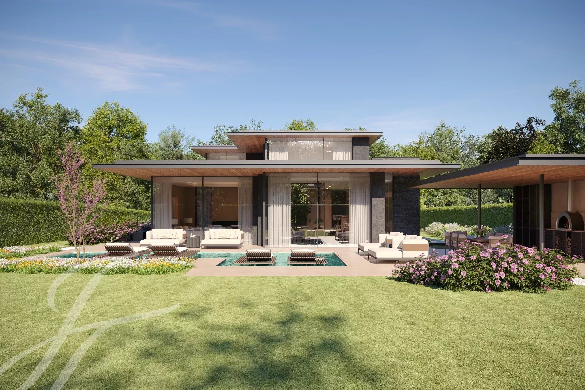 Le terrain, parfaitement plat, sans vis-à-vis et baigné de lumière, offre un cadre d’une rareté absolue, où architecture et nature dialoguent en harmonie.