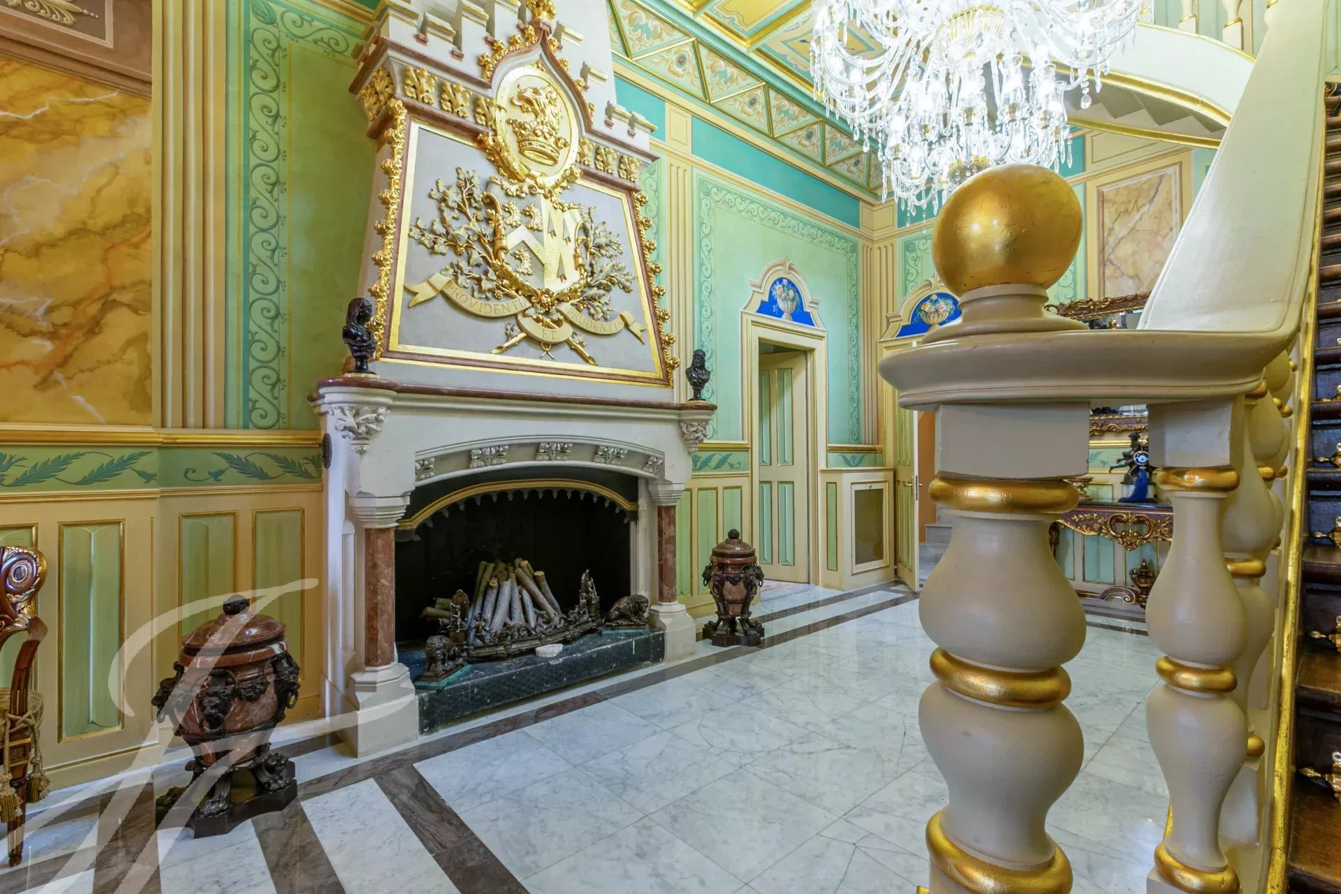 L’entrée s’effectue par un porche sculpté, au sommet d’un escalier en marbre à double volée d’inspiration baroque. Un somptueux salon adapté aux réceptions formelles, une bibliothèque et une cuisine sont également situés au même niveau.