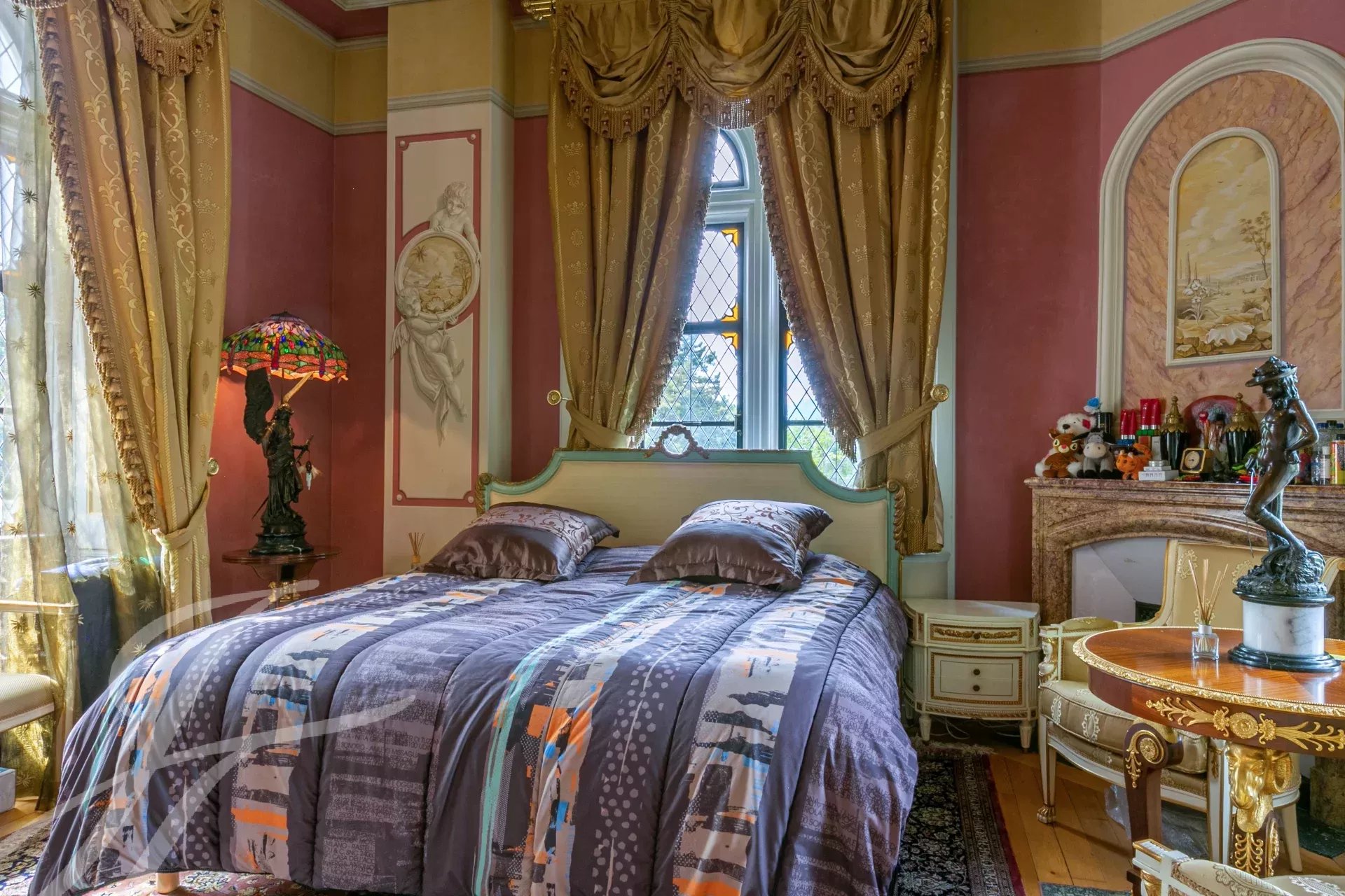 Plus haut, au deuxième étage se trouvent trois autres chambres et une salle de bains, avec un escalier circulaire reliant la tourelle. Un bureau est idéalement niché dans l'espace rond en forme de tour, bénéficiant d'une lumière naturelle abondante et de magnifiques vues à 360 degrés depuis ses multiples fenêtres.
