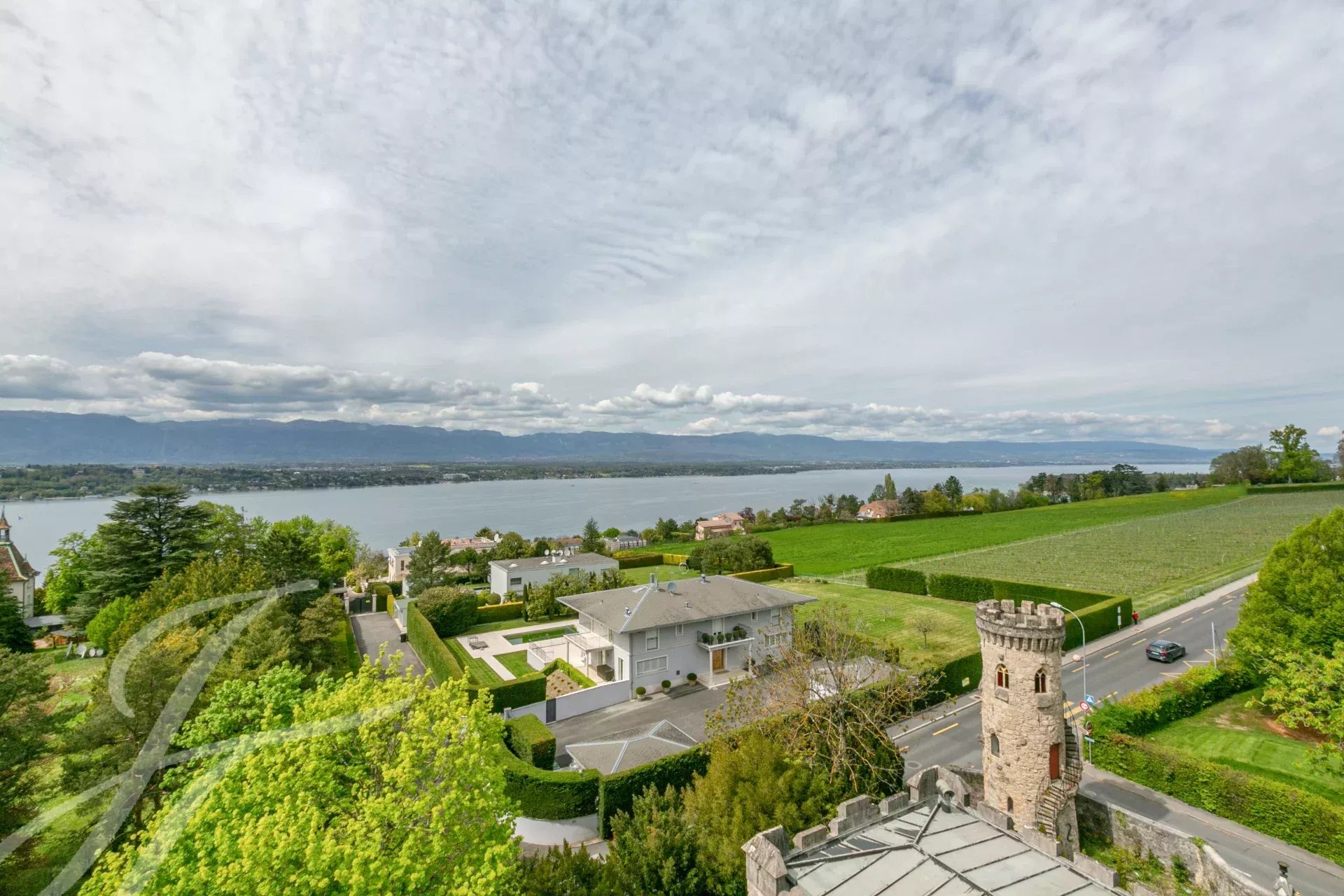 La particularité de la propriété est sa tourelle médiévale, attenante à la demeure principale, menant à une terrasse-tour fortifiée ornée de créneaux et de mâchicoulis, offrant une vue unique sur le lac Léman, le Jura et les ciels de nuit, avec en son centre, un haut donjon carré de quatre étages de belle hauteur. Ce donjon majuscule est flanqué de deux corps de bâtiments, dont le plus important comprend, au premier étage, une étonnante chapelle seigneuriale éclairée de grandes baies ogivales, portant le monogramme du commanditaire Charles Flood.