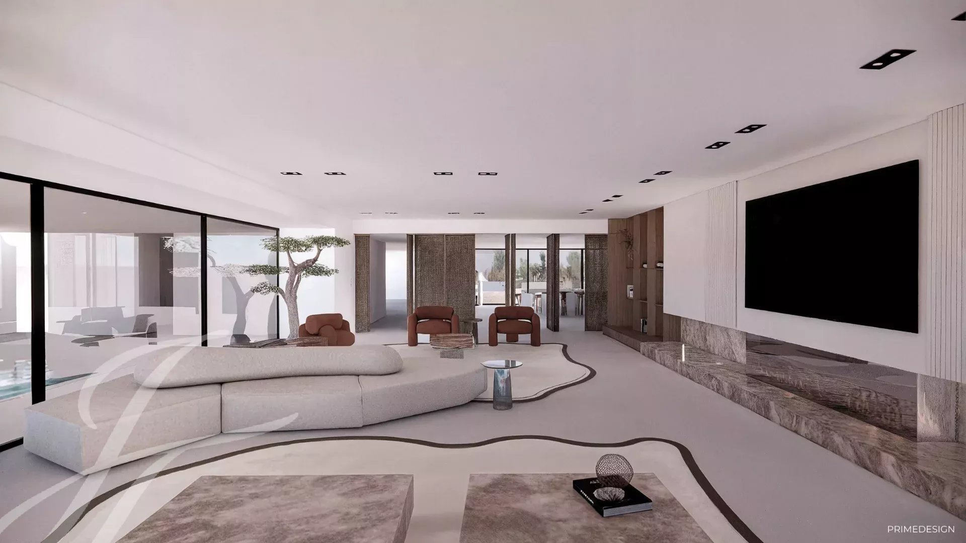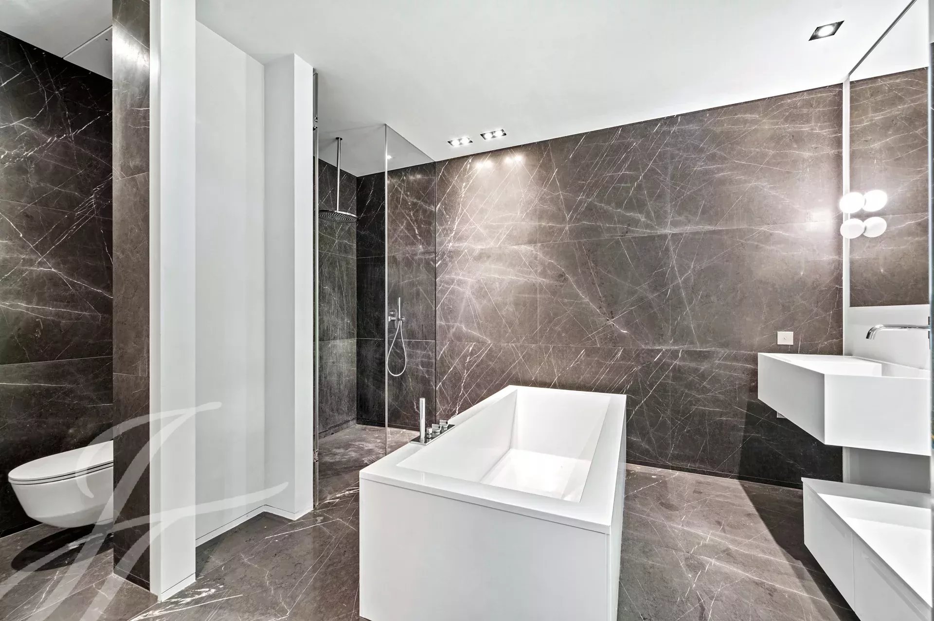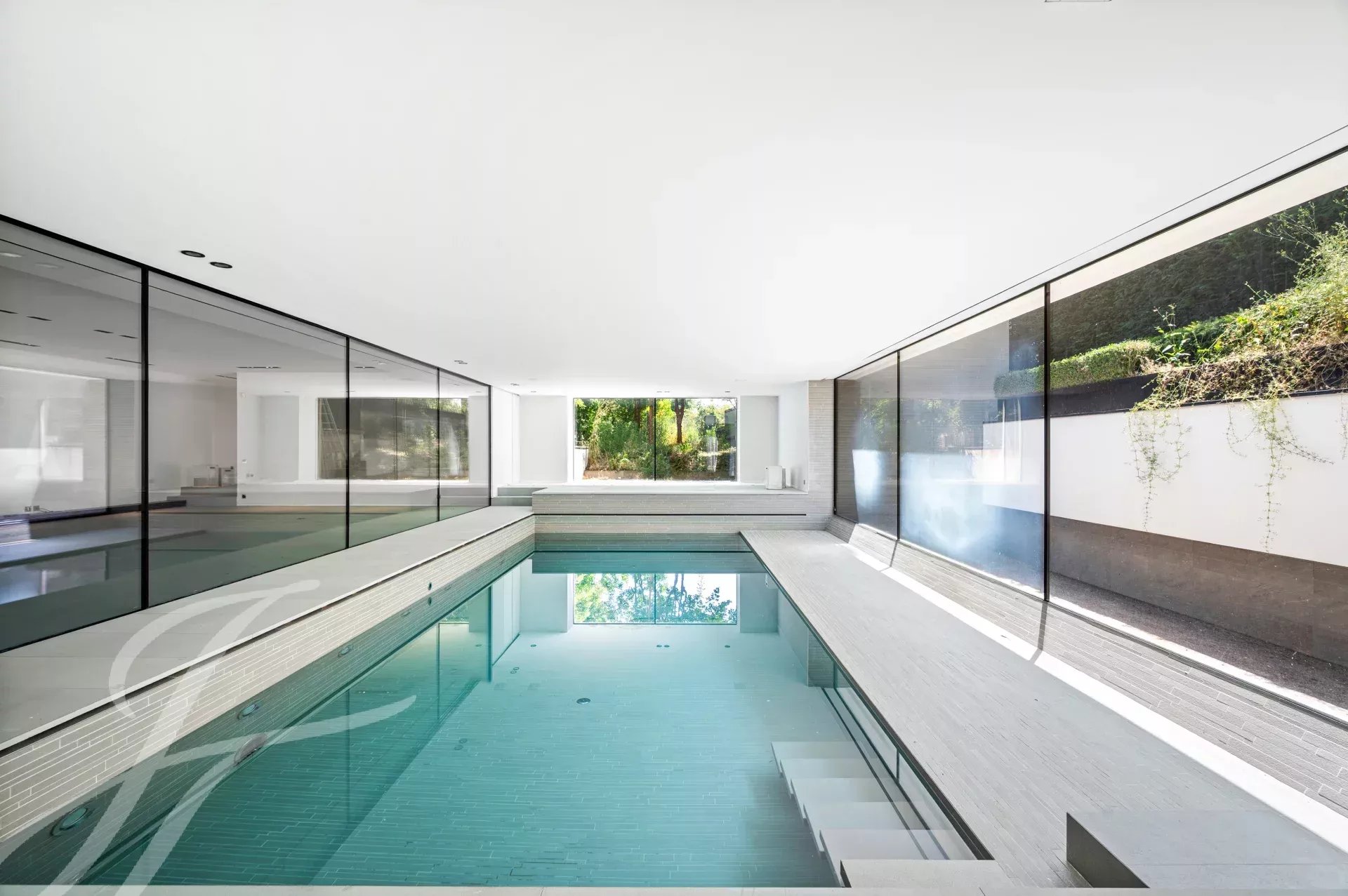 Un majestueux hall d’entrée accueille les visiteurs, avec un superbe escalier conçu par l’architecte italien Pierre Lissoni. Le vaste salon offre une vue imprenable sur la piscine intérieure. La salle à manger, dotée d’une cheminée, et la grande cuisine équipée d’appareils haut de gamme, avec son espace repas, complètent cet espace de vie convivial. Deux chambres, chacune avec son dressing et sa salle de bain attenante, ainsi qu’une troisième chambre, équipée d’une kitchenette et d’une salle de bain, viennent parfaire ce niveau.