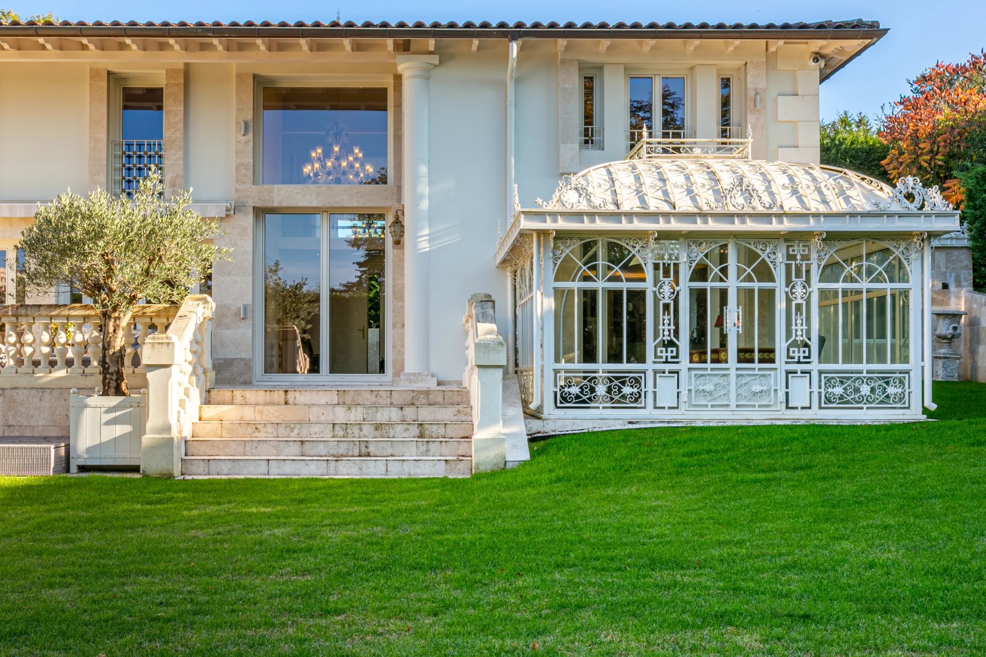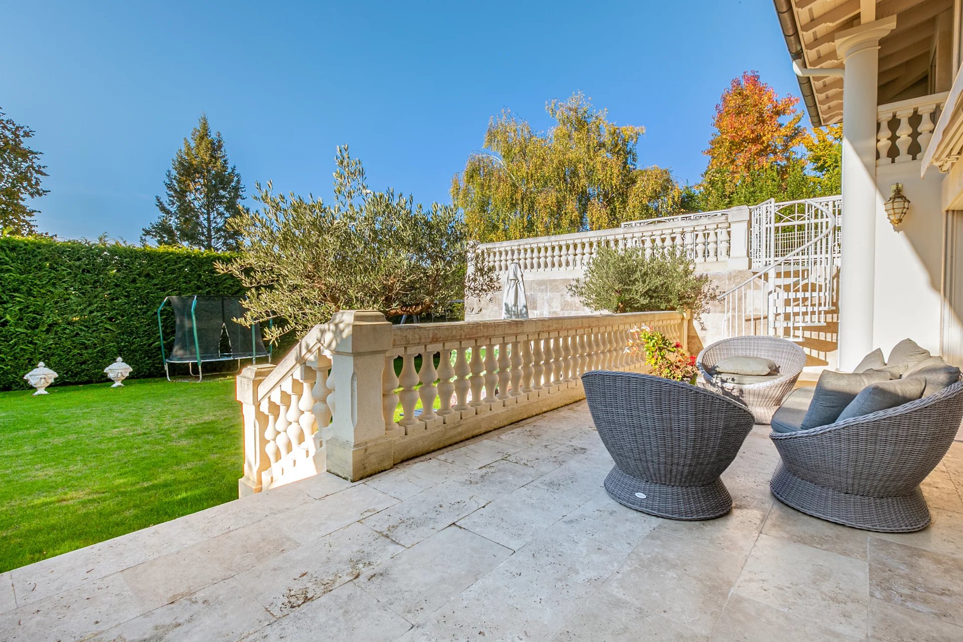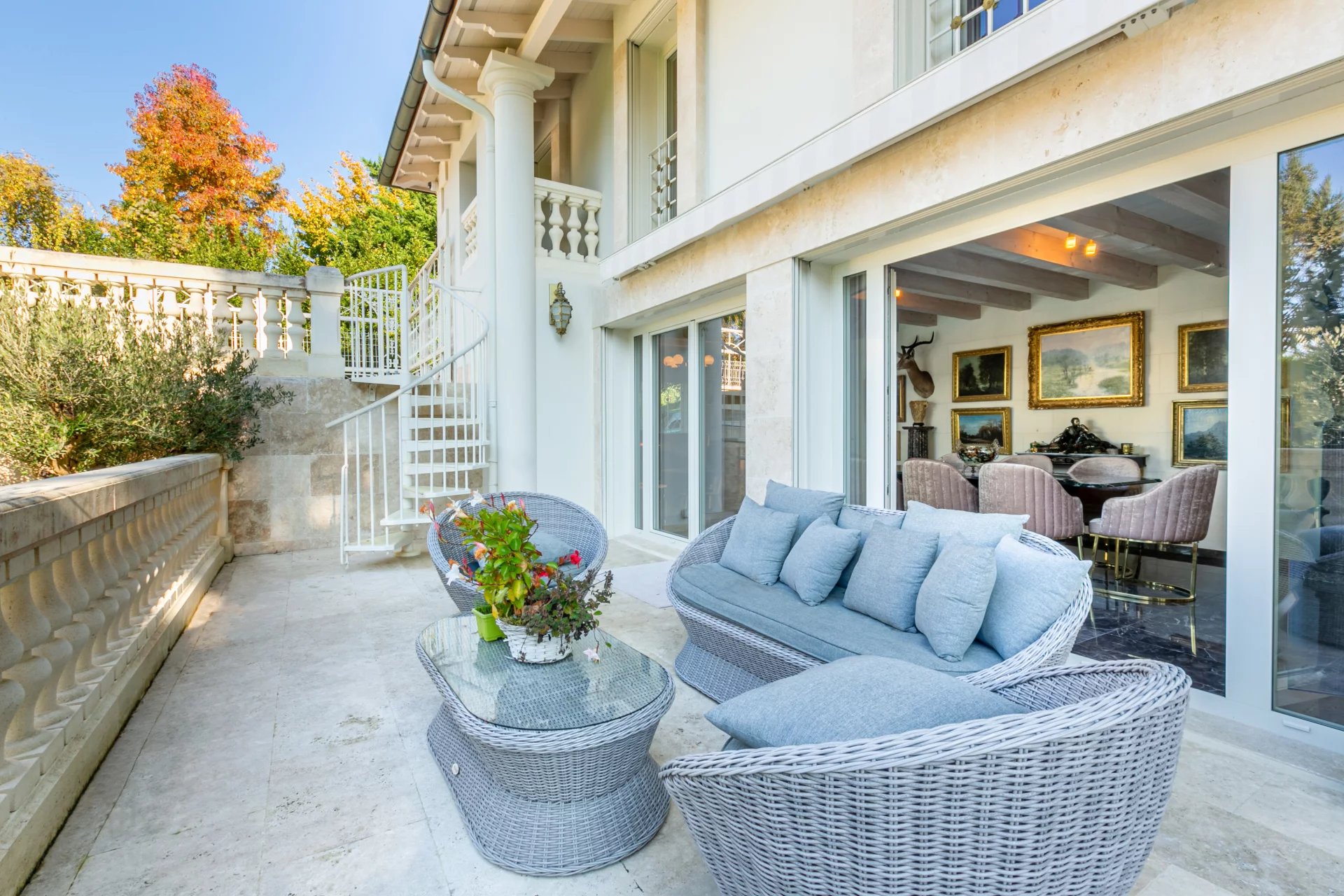 L’extérieur se compose de plusieurs terrasses, dont une avec échappée sur le lac, d’un jardin joliment arboré entièrement clos, d'un garage double automatisé pour 2 véhicules et de plusieurs places de parking extérieures.