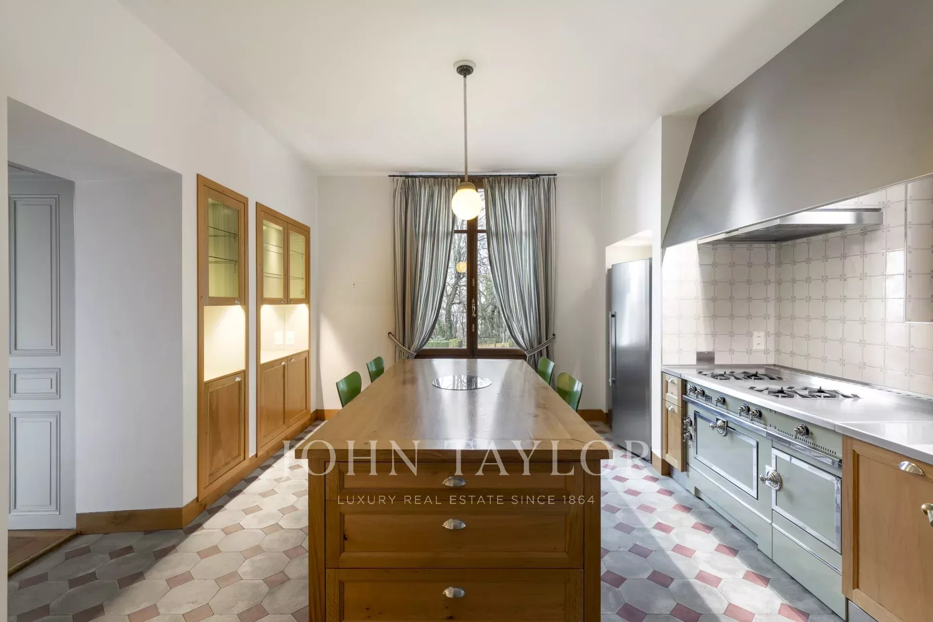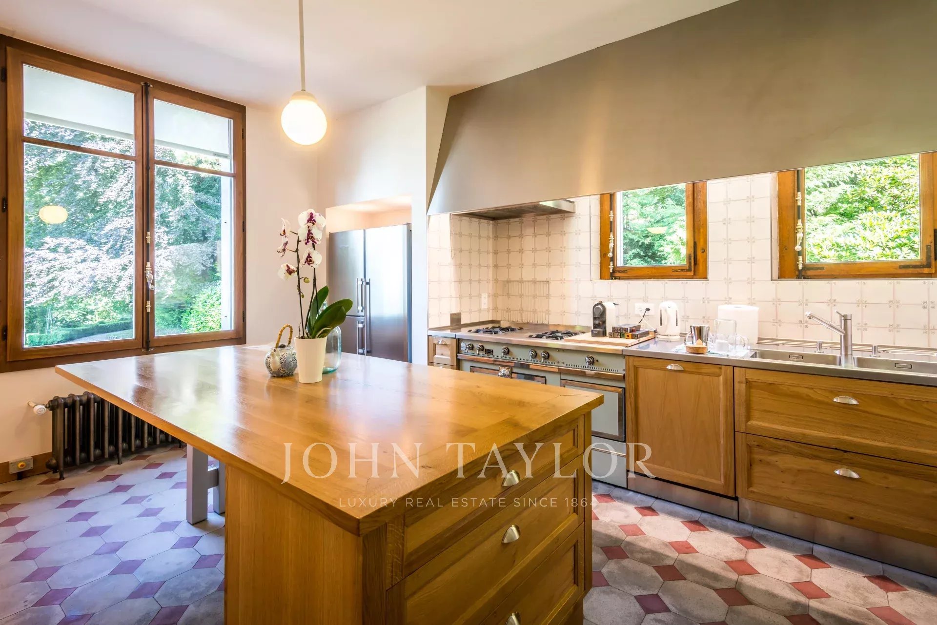 Les deux salons du rez-de-chaussée disposent chacun d'une cheminée fonctionnelle. La salle à manger communique avec la belle cuisine contemporaine par un office de service disposant de rangements.