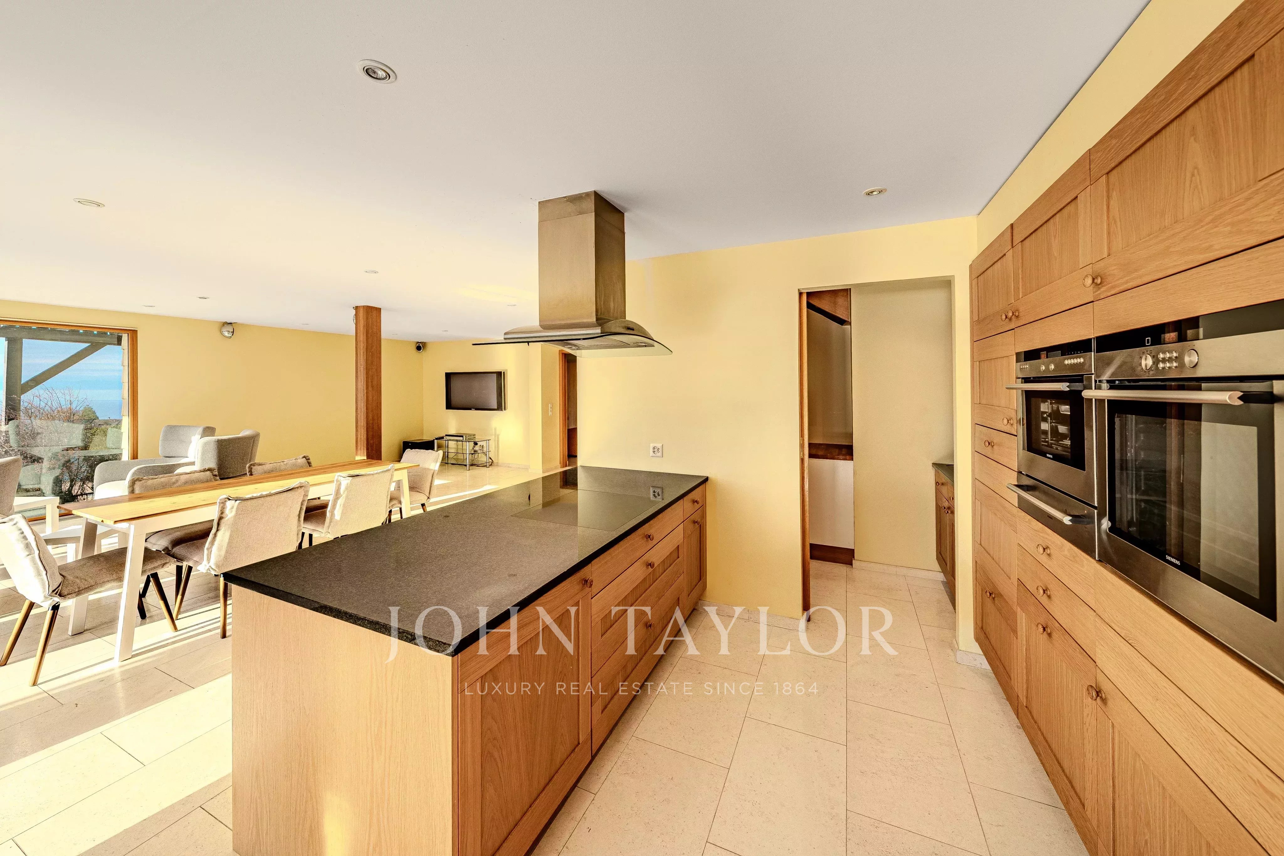 - Le premier niveau est consacré aux espaces de vie et à une première partie nuit. Il comprend une cuisine entièrement équipée avec îlot central, ouverte sur un séjour et une salle à manger lumineux bénéficiant d’un accès direct à la terrasse et à la piscine.