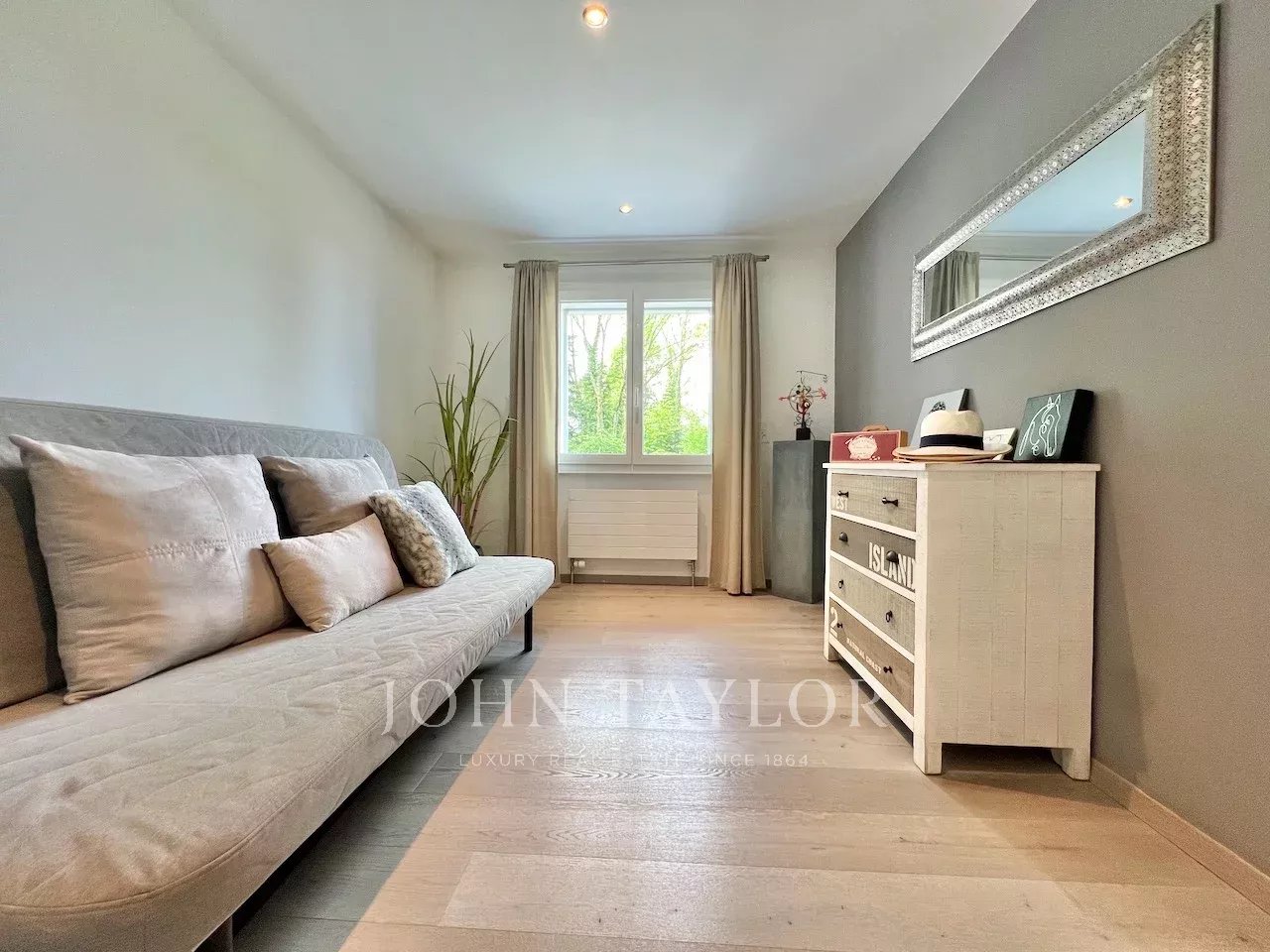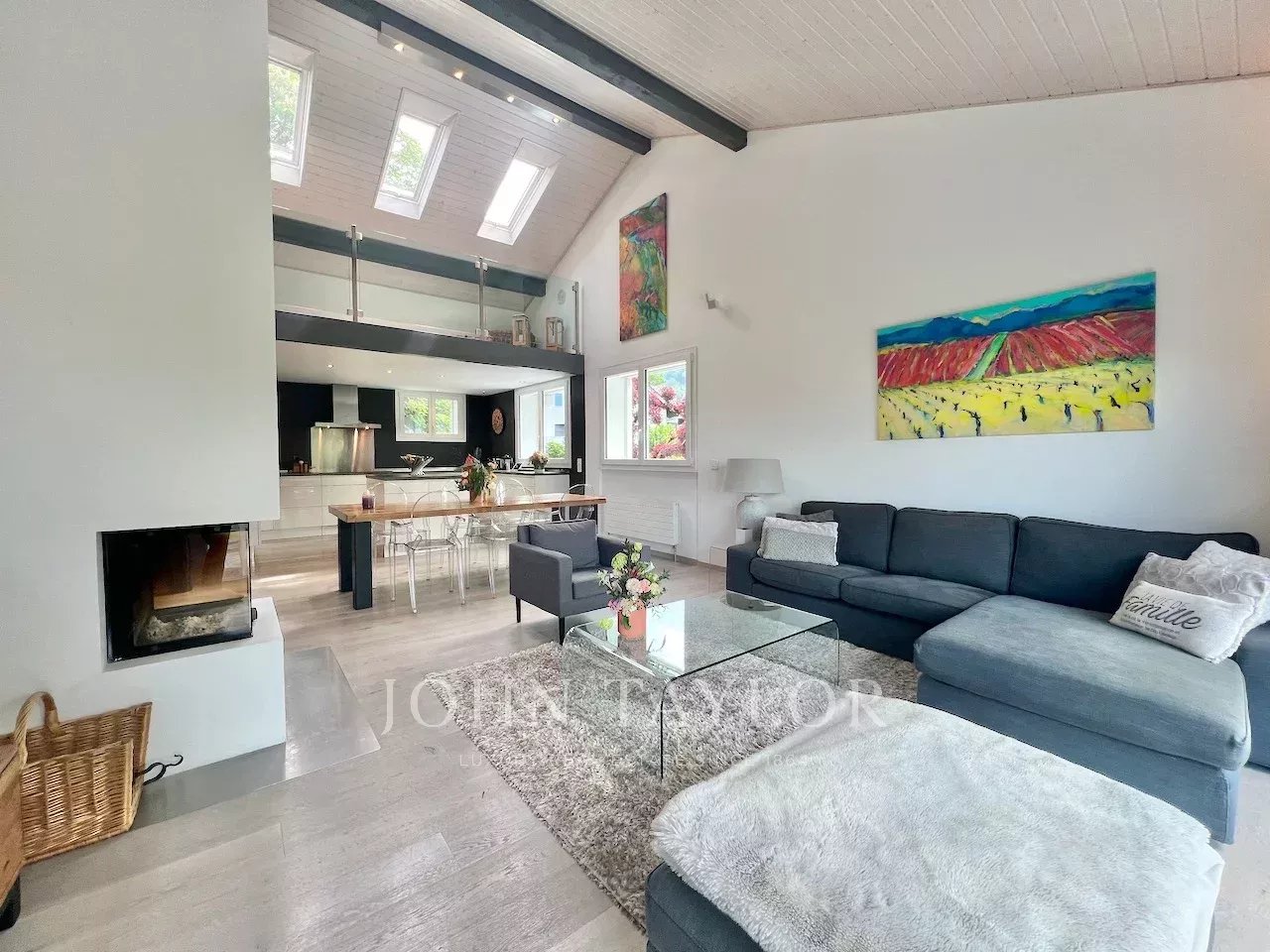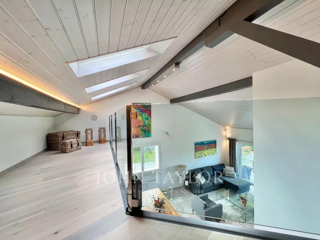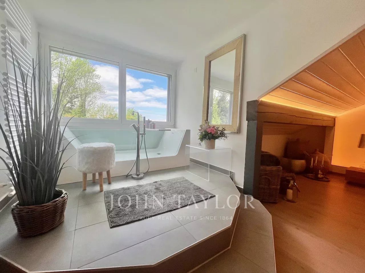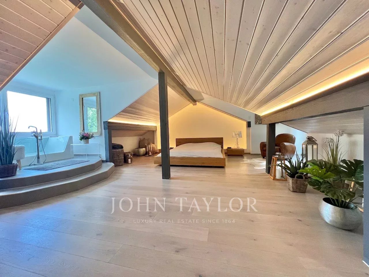 À l’étage, une magnifique suite parentale sous combles offre un espace lecture, une salle de douche et une baignoire, un véritable cocon privé.